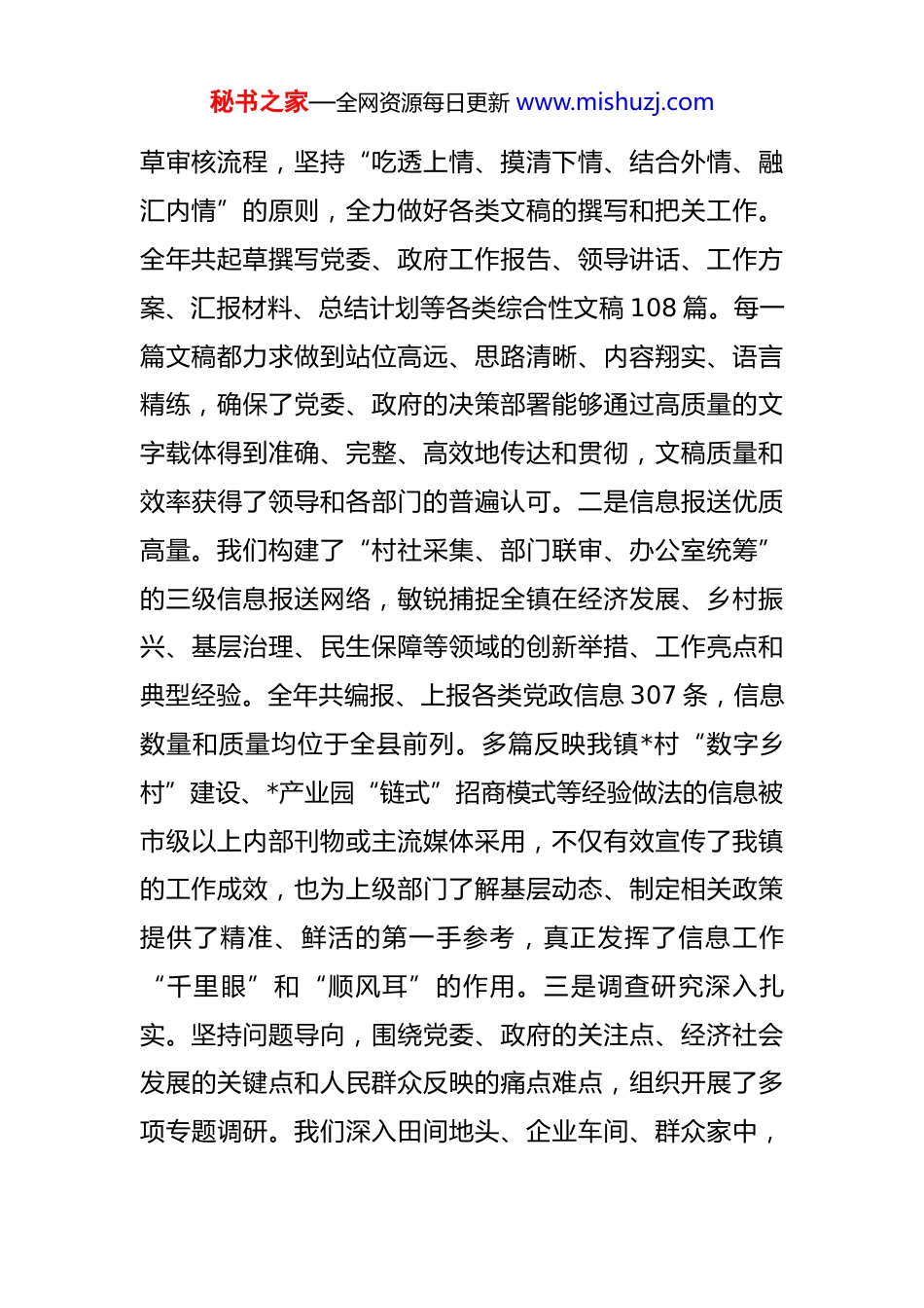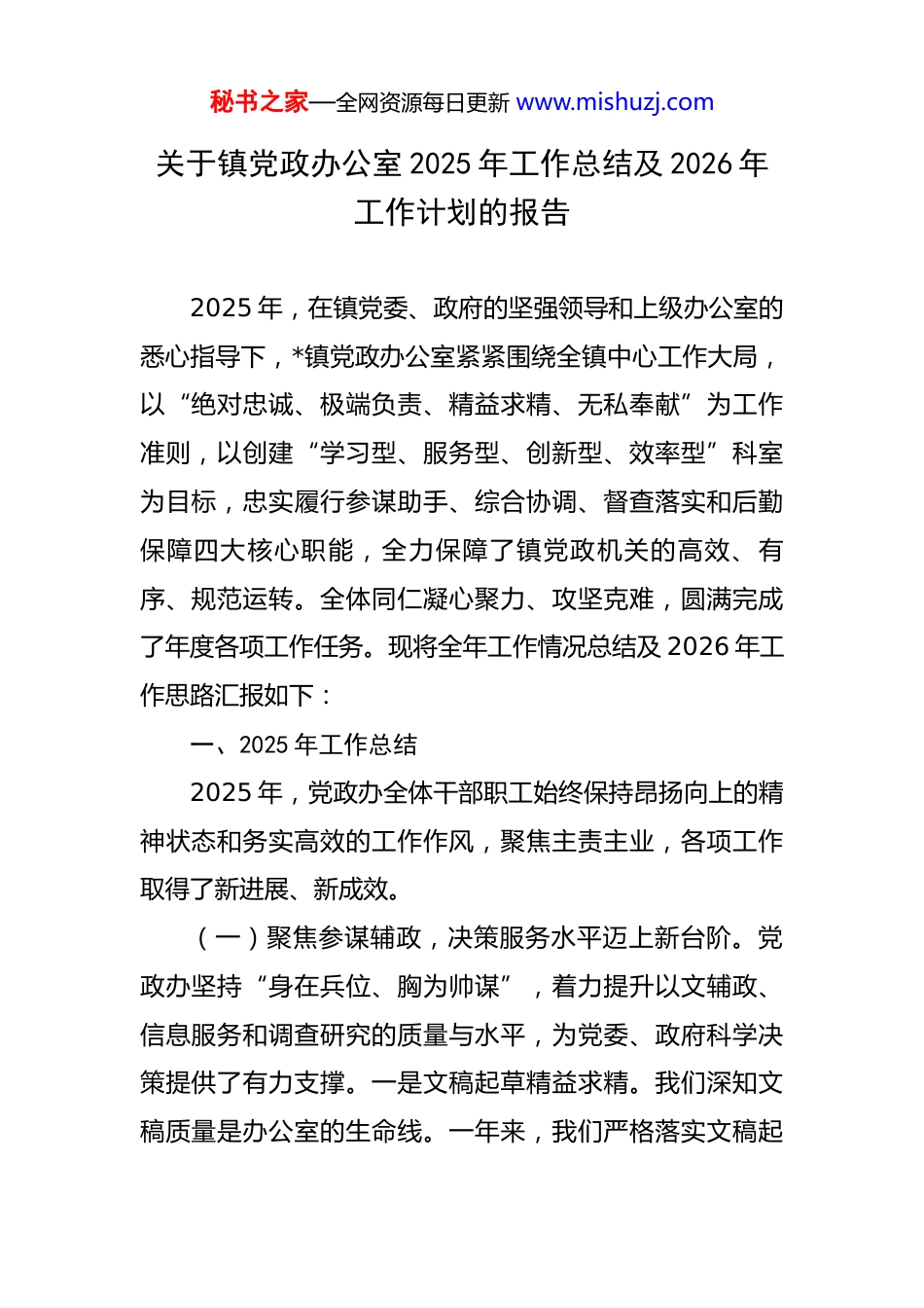 秘书之家—全网资源每日更新 www.mishuzj.com关于镇党政办公室 2025 年工作总结及 2026 年工作计划的报告 2025 年,在镇党委、政府的坚强领导和上级办公室的悉心指导下,*镇党政办公室紧紧围绕全镇中心工作大局,以“绝对忠诚、极端负责、精益求精、无私奉献”为工作准则,以创建“学习型、服务型、创新型、效率型”科室为目标,忠实履行参谋助手、综合协调、督查落实和后勤保障四大核心职能,全力保障了镇党政机关的高效、有序、规范运转。全体同仁凝心聚力、攻坚克难,圆满完成了年度各项工作任务。现将全年工作情况总结及 2026 年工作思路汇报如下:一、2025 年工作总结2025 年,党政办全体干部职工始终保持昂扬向上的精神状态和务实高效的工作作风,聚焦主责主业,各项工作取得了新进展、新成效。(一)聚焦参谋辅政,决策服务水平迈上新台阶。党政办坚持“身在兵位、胸为帅谋”,着力提升以文辅政、信息服务和调查研究的质量与水平,为党委、政府科学决策提供了有力支撑。一是文稿起草精益求精。我们深知文稿质量是办公室的生命线。一年来,我们严格落实文稿起秘书之家—全网资源每日更新 www.mishuzj.com草审核流程,坚持“吃透上情、摸清下情、结合外情、融汇内情”的原则,全力做好各类文稿的撰写和把关工作。全年共起草撰写党委、政府工作报告、领导讲话、工作方案、汇报材料、总结计划等各类综合性文稿 108 篇。每一篇文稿都力求做到站位高远、思路清晰、内容翔实、语言精练,确保了党委、政府的决策部署能够通过高质量的文字载体得到准确、完整、高效地传达和贯彻,文稿质量和效率获得了领导和各部门的普遍认可。二是信息报送优质高量。我们构建了“村社采集、部门联审、办公室统筹”的三级信息报送网络,敏锐捕捉全镇在经济发展、乡村振兴、基层治理、民生保障等领域的创新举措、工作亮点和典型经验。全年共编报、上报各类党政信息 307 条,信息数量和质量均位于全县前列。多篇反映我镇*村“数字乡村”建设、*产业园“链式”招商模式等经验做法的信息被市级以上内部刊物或主流媒体采用,不仅有效宣传了我镇的工作成效,也为上级部门了解基层动态、制定相关政策提供了精准、鲜活的第一手参考,真正发挥了信息工作“千里眼”和“顺风耳”的作用。三是调查研究深入扎实。坚持问题导向,围绕党委、政府的关注点、经济社会发展的关键点和人民群众反映的痛点难点,组织开展了多项专题调研。我们深入田间地头、企业车间、群众家中,秘书之家—全网资源每日更新 www.mishuzj.com通过实地走访、座谈交流等形式,先后就“农村‘三资’管理规范化路径”“新业态劳动者权益保障”“农村人居环境整治长效机制”等课题开展了 10 余次深度调研。在充分掌握一手资料的基础上,撰写了《关于加强我镇农村集体经济组织财务监管的调研报告》等多篇高质量调研成果,其中部分建议被党委、政府采纳并转化为具体的工作举措,有效提升了决策的科学性和针对性。(二)聚焦统筹协调,机关运转中枢作用充分彰显。党政办作为承上启下、协调各方的中枢部门,始终致力于优化工作流程,提升协调效率,确保政令畅通、运转高效。一是公文流转规范有序。严格执行《党政机关公文处理工作条例》,建立并完善了“收文登记—分级拟办—领导批示—跟踪催办—办结归档”的全流程闭环管理机制。2025 年,共处理上级来文及各类文件 800 余件,制发本级文件 150 余份。在处理过程中,我们严把政策关、格式关和时效关,确保每一份文件都能第一时间精准分送、及时办理、规范归档,全年未发生一起因公文延误、错办、漏办而影响工作大局的事件,保障了机关工作的制度化和规范化。二是会务组织周密细致。坚持“精简、高效、务实”的原则,全年共牵头组织筹备各类会议 260 余场次。无论是全镇性的党代会、人大等大型会议,还是小秘书之家—全网资源每日更新 www.mishuzj.com范围的书记办公会、政府常务会、专题调度会,我们都坚持“会前有方案、会中有服务、会后有纪要、事后有落实”的“四有”标准。从议题收集、材料准备、会场布置,到通知传达、席卡摆放、设备调试、会议记录,再到后勤服务...