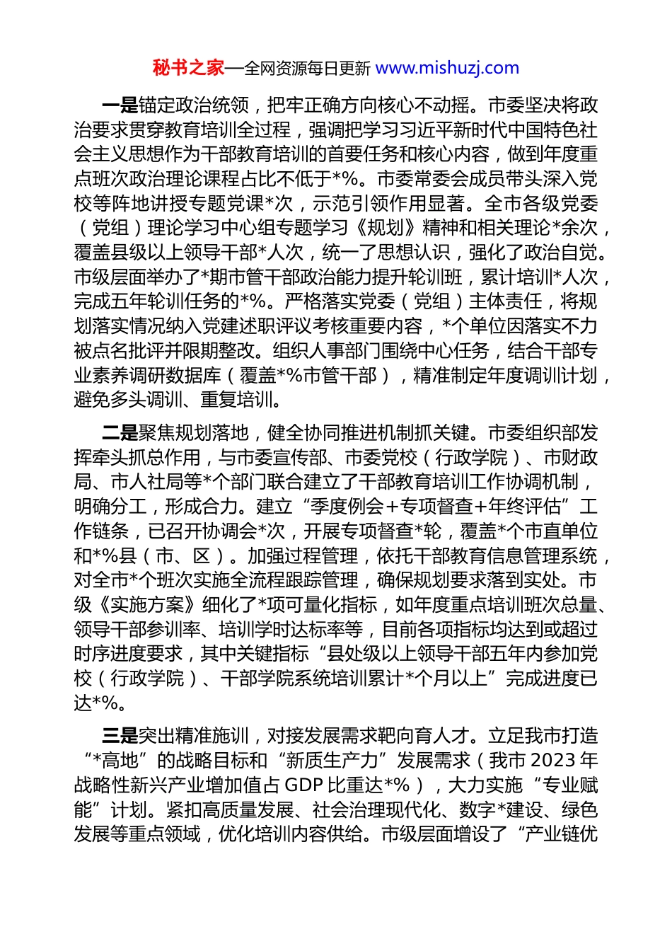 秘书之家—全网资源每日更新 www.mishuzj.com关于贯彻落实全国全省《干部教育培训规划(2023-2027 年)》中期评估报告习近平总书记关于建设高素质专业化干部队伍作出重要指示:“干部教育培训是干部队伍建设的先导性、基础性、战略性工程,在进行伟大斗争、建设伟大工程、推进伟大事业、实现伟大梦想中具有不可替代的重要作用。”我市市委深刻学习领会,始终将干部教育培训作为关系党的事业继往开来的关键来抓。根据全国、全省《干部教育培训规划( 2023—2027 年)》(以下简称《规划》)部署要求,我市迅速行动,对标对表制定实施方案,狠抓各项工作落实。本报告旨在系统评估《规划》实施以来的进展情况、成效经验、存在问题,并提出针对性改进措施,为下一阶段纵深推进干部教育培训工作提供决策依据。一、深学笃行强基固本:主要做法与阶段成效(一)强化顶层设计,夯实规划实施根基《规划》的生命力在于执行,关键在抓好开头、打好基础。市委常委会坚持以上率下,专题学习习近平总书记关于干部教育培训的最新重要论述和《规划》精神,将其纳入年度工作要点和常委会重要议事日程。市委组织部切实履行主管职责,牵头建立由*个相关职能部门参与的联席会议机制,定期研判调度。在系统调研基础上,结合我市发展定位和干部队伍实际需求,于 2023 年*月印发了《*市贯彻落实全国全省〈干部教育培训规划(2023—2027年)〉的具体实施方案》,明确了*大方面*项重点任务、*项量化指标和*项保障措施,层层压实了党委(党组)主体责任。至2024 年*月,市级层面规划的*项主要任务均按进度要求有效推进,其中*项已提前或超额完成节点目标。秘书之家—全网资源每日更新 www.mishuzj.com一是锚定政治统领,把牢正确方向核心不动摇。市委坚决将政治要求贯穿教育培训全过程,强调把学习习近平新时代中国特色社会主义思想作为干部教育培训的首要任务和核心内容,做到年度重点班次政治理论课程占比不低于*%。市委常委会成员带头深入党校等阵地讲授专题党课*次,示范引领作用显著。全市各级党委(党组)理论学习中心组专题学习《规划》精神和相关理论*余次,覆盖县级以上领导干部*人次,统一了思想认识,强化了政治自觉。市级层面举办了*期市管干部政治能力提升轮训班,累计培训*人次,完成五年轮训任务的*%。严格落实党委(党组)主体责任,将规划落实情况纳入党建述职评议考核重要内容,*个单位因落实不力被点名批评并限期整改。组织人事部门围绕中心任务,结合干部专业素养调研数据库(覆盖*%市管干部),精准制定年度调训计划,避免多头调训、重复培训。二是聚焦规划落地,健全协同推进机制抓关键。市委组织部发挥牵头抓总作用,与市委宣传部、市委党校(行政学院)、市财政局、市人社局等*个部门联合建立了干部教育培训工作协调机制,明确分工,形成合力。建立“季度例会+专项督查+年终评估”工作链条,已召开协调会*次,开展专项督查*轮,覆盖*个市直单位和*%县(市、区)。加强过程管理,依托干部教育信息管理系统,对全市*个班次实施全流程跟踪管理,确保规划要求落到实处。市级《实施方案》细化了*项可量化指标,如年度重点培训班次总量、领导干部参训率、培训学时达标率等,目前各项指标均达到或超过时序进度要求,其中关键指标“县处级以上领导干部五年内参加党校(行政学院)、干部学院系统培训累计*个月以上”完成进度已达*%。三是突出精准施训,对接发展需求靶向育人才。立足我市打造“*高地”的战略目标和“新质生产力”发展需求(我市 2023 年战略性新兴产业增加值占 GDP 比重达*%),大力实施“专业赋能”计划。紧扣高质量发展、社会治理现代化、数字*建设、绿色发展等重点领域,优化培训内容供给。市级层面增设了“产业链优秘书之家—全网资源每日更新 www.mishuzj.com化提升”“城市数字化转型治理”“乡村振兴前沿实践”等*个新专题班次,累计培训急需紧缺专业干部*名。强化市情市策教育,开发本土化教学案例*个。深化拓展培训渠道,选调*名骨干赴*高校、科研院所和发达地区专题研修;推动政企学研合作,在*家龙头企业建立现场教学基地*个。全市干部参加各类专业能...