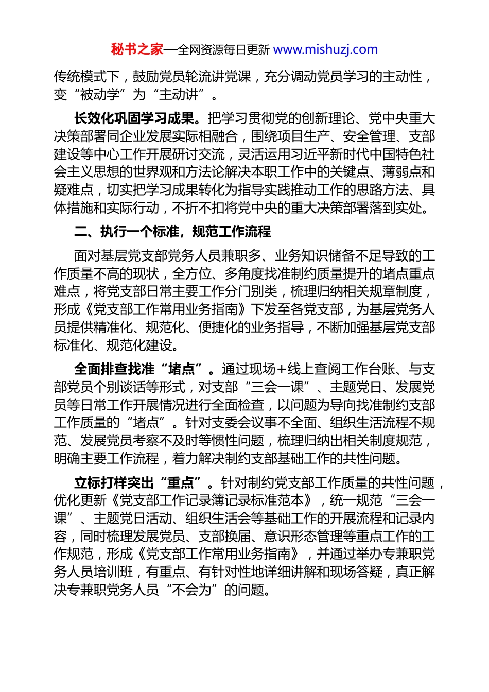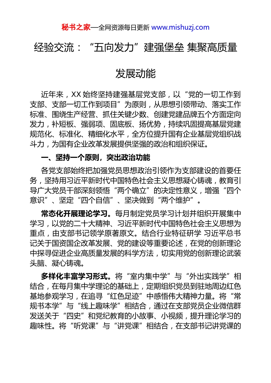 秘书之家—全网资源每日更新 www.mishuzj.com经验交流:“五向发力”建强堡垒 集聚高质量发展动能近年来,XX 始终坚持建强基层党支部,以“党的一切工作到支部、支部一切工作到项目”为原则,从思想引领带动、落实工作标准、围绕生产经营、抓住关键少数、创建党建品牌五个方面定向发力,补短板、强弱项、固底板、扬优势,持续巩固提高基层党建规范化、标准化、精细化水平,全方位提升国有企业基层党组织战斗力,为国有企业改革发展提供坚强的政治和组织保证。一、坚持一个原则,突出政治功能各党支部始终把加强党员思想政治引领作为支部建设的首要任务,坚持用习近平新时代中国特色社会主义思想凝心铸魂,教育引导广大党员干部深刻领悟“两个确立”的决定性意义,增强“四个意识”、坚定“四个自信”、坚决做到“两个维护”。常态化开展理论学习。每月制定党员学习计划并组织开展集中学习,以党的二十大精神、习近平新时代中国特色社会主义思想为重点,由支部书记领学原著原文。结合行业特征研学 习近平总书记关于国资国企改革发展、党的建设等重要论述,在党的创新理论中探寻促进企业高质量发展的科学方法,切实用党的创新理论武装头脑、凝心铸魂。多样化丰富学习形式。将“室内集中学”与“外出实践学”相结合,在每月集中学理论的基础上,定期组织党员到驻地周边红色基地参观学习,在追寻“红色足迹”中感悟伟大精神力量。将“常规书本学”与“线上趣味学”相结合,通过在支部党员企业微信群发送关于“四史”和党纪教育的小故事、小视频,提升理论学习的趣味性。将“听党课”与“讲党课”相结合,在支部书记讲党课的秘书之家—全网资源每日更新 www.mishuzj.com传统模式下,鼓励党员轮流讲党课,充分调动党员学习的主动性,变“被动学”为“主动讲”。长效化巩固学习成果。把学习贯彻党的创新理论、党中央重大决策部署同企业发展实际相融合,围绕项目生产、安全管理、支部建设等中心工作开展研讨交流,灵活运用习近平新时代中国特色社会主义思想的世界观和方法论解决本职工作中的关键点、薄弱点和疑难点,切实把学习成果转化为指导实践推动工作的思路方法、具体措施和实际行动,不折不扣将党中央的重大决策部署落到实处。二、执行一个标准,规范工作流程面对基层党支部党务人员兼职多、业务知识储备不足导致的工作质量不高的现状,全方位、多角度找准制约质量提升的堵点重点难点,将党支部日常主要工作分门别类,梳理归纳相关规章制度,形成《党支部工作常用业务指南》下发至各党支部,为基层党务人员提供精准化、规范化、便捷化的业务指导,不断加强基层党支部标准化、规范化建设。全面排查找准“堵点”。通过现场+线上查阅工作台账、与支部党员个别谈话等形式,对支部“三会一课”、主题党日、发展党员等日常工作开展情况进行全面检查,以问题为导向找准制约支部工作质量的“堵点”。针对支委会议事不全面、组织生活流程不规范、发展党员考察不及时等惯性问题,梳理归纳出相关制度规范,明确主要工作流程,着力解决制约支部基础工作的共性问题。立标打样突出“重点”。针对制约党支部工作质量的共性问题,优化更新《党支部工作记录簿记录标准范本》,统一规范“三会一课”、主题党日活动、组织生活会等基础工作的开展流程和记录内容,同时梳理发展党员、支部换届、意识形态管理等重点工作的工作规范,形成《党支部工作常用业务指南》,并通过举办专兼职党务人员培训班,有重点、有针对性地详细讲解和现场答疑,真正解决专兼职党务人员“不会为”的问题。秘书之家—全网资源每日更新 www.mishuzj.com实作演练攻破“难点”。为确保基层党务人员真正学懂弄通业务流程的关键环节和重点难点,在理论培训的基础上开展竞赛演练,通过设置竞赛抢答、模拟演练等环节,深度检验基层党务人员在接收党员、换届选举、组织生活会等关键业务上的实操能力,并对竞赛过程中反映出的“易错点”重点讲解,进一步检验培训效果、提高理论水平确保工作质量,引导专兼职党务人员真正将工作标准牢记于心、熟练掌握,持续推动基层党建工作规范化标准化。三、围绕一个中心,强化经营保障各党支部围...