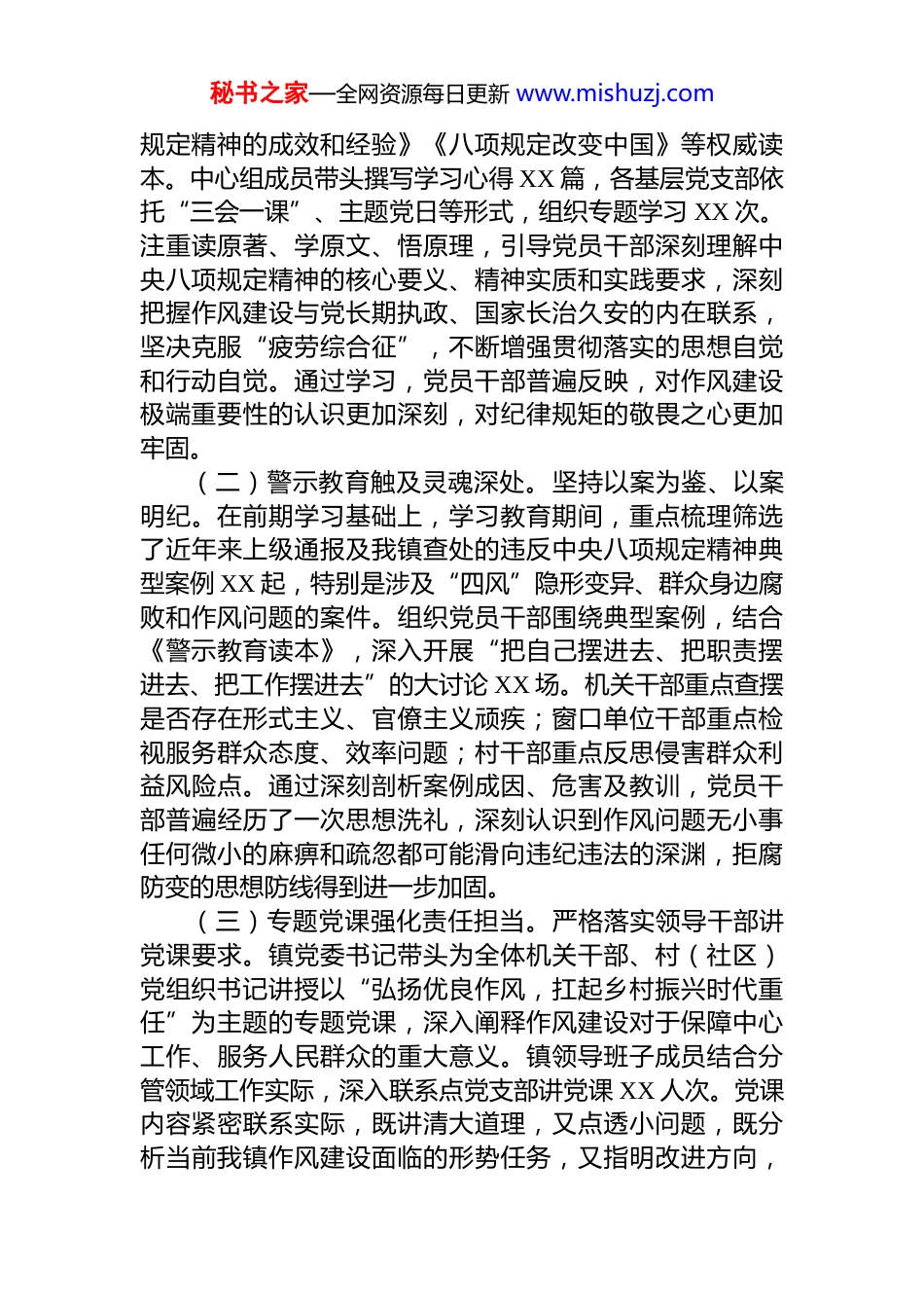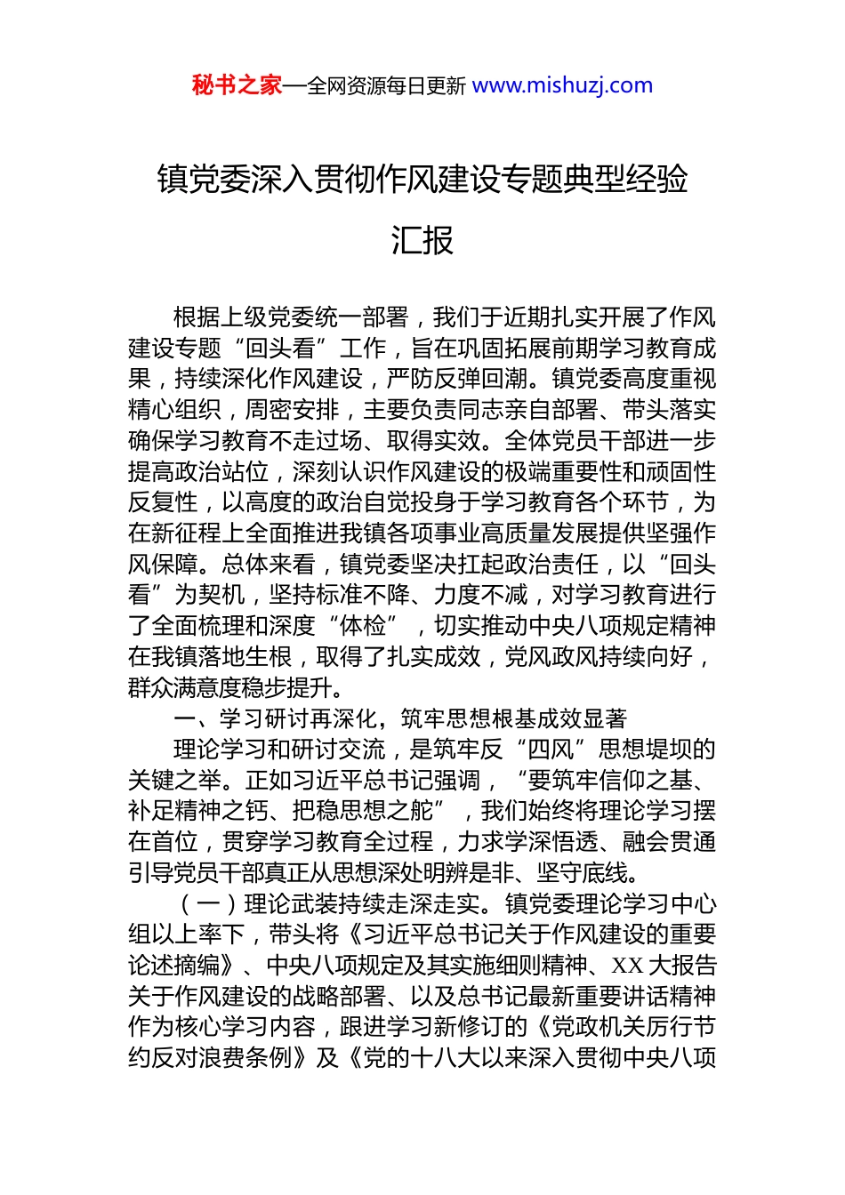 秘书之家—全网资源每日更新 www.mishuzj.com镇党委深入贯彻作风建设专题典型经验汇报根据上级党委统一部署,我们于近期扎实开展了作风建设专题“回头看”工作,旨在巩固拓展前期学习教育成果,持续深化作风建设,严防反弹回潮。镇党委高度重视精心组织,周密安排,主要负责同志亲自部署、带头落实确保学习教育不走过场、取得实效。全体党员干部进一步提高政治站位,深刻认识作风建设的极端重要性和顽固性反复性,以高度的政治自觉投身于学习教育各个环节,为在新征程上全面推进我镇各项事业高质量发展提供坚强作风保障。总体来看,镇党委坚决扛起政治责任,以“回头看”为契机,坚持标准不降、力度不减,对学习教育进行了全面梳理和深度“体检”,切实推动中央八项规定精神在我镇落地生根,取得了扎实成效,党风政风持续向好,群众满意度稳步提升。一、学习研讨再深化,筑牢思想根基成效显著理论学习和研讨交流,是筑牢反“四风”思想堤坝的关键之举。正如习近平总书记强调,“要筑牢信仰之基、补足精神之钙、把稳思想之舵”,我们始终将理论学习摆在首位,贯穿学习教育全过程,力求学深悟透、融会贯通引导党员干部真正从思想深处明辨是非、坚守底线。(一)理论武装持续走深走实。镇党委理论学习中心组以上率下,带头将《习近平总书记关于作风建设的重要论述摘编》、中央八项规定及其实施细则精神、XX 大报告关于作风建设的战略部署、以及总书记最新重要讲话精神作为核心学习内容,跟进学习新修订的《党政机关厉行节约反对浪费条例》及《党的十八大以来深入贯彻中央八项秘书之家—全网资源每日更新 www.mishuzj.com规定精神的成效和经验》《八项规定改变中国》等权威读本。中心组成员带头撰写学习心得 XX 篇,各基层党支部依托“三会一课”、主题党日等形式,组织专题学习 XX 次。注重读原著、学原文、悟原理,引导党员干部深刻理解中央八项规定精神的核心要义、精神实质和实践要求,深刻把握作风建设与党长期执政、国家长治久安的内在联系,坚决克服“疲劳综合征”,不断增强贯彻落实的思想自觉和行动自觉。通过学习,党员干部普遍反映,对作风建设极端重要性的认识更加深刻,对纪律规矩的敬畏之心更加牢固。(二)警示教育触及灵魂深处。坚持以案为鉴、以案明纪。在前期学习基础上,学习教育期间,重点梳理筛选了近年来上级通报及我镇查处的违反中央八项规定精神典型案例 XX 起,特别是涉及“四风”隐形变异、群众身边腐败和作风问题的案件。组织党员干部围绕典型案例,结合《警示教育读本》,深入开展“把自己摆进去、把职责摆进去、把工作摆进去”的大讨论 XX 场。机关干部重点查摆是否存在形式主义、官僚主义顽疾;窗口单位干部重点检视服务群众态度、效率问题;村干部重点反思侵害群众利益风险点。通过深刻剖析案例成因、危害及教训,党员干部普遍经历了一次思想洗礼,深刻认识到作风问题无小事任何微小的麻痹和疏忽都可能滑向违纪违法的深渊,拒腐防变的思想防线得到进一步加固。(三)专题党课强化责任担当。严格落实领导干部讲党课要求。镇党委书记带头为全体机关干部、村(社区)党组织书记讲授以“弘扬优良作风,扛起乡村振兴时代重任”为主题的专题党课,深入阐释作风建设对于保障中心工作、服务人民群众的重大意义。镇领导班子成员结合分管领域工作实际,深入联系点党支部讲党课 XX 人次。党课内容紧密联系实际,既讲清大道理,又点透小问题,既分析当前我镇作风建设面临的形势任务,又指明改进方向,秘书之家—全网资源每日更新 www.mishuzj.com有效传导了压力和责任。新提拔干部、年轻干部普遍反映通过领导干部讲党课,进一步明确了履职用权的边界和底线,增强了在新岗位上廉洁从政、担当作为的决心。此次学习教育领导干部讲党课覆盖率达 100%。(四)研讨交流碰撞思想火花。在深入学习理论和警示教育的基础上,各支部(总支)组织党员干部围绕“新时代如何更好践行中央八项规定精神”、“作风建设如何助力乡村全面振兴”等主题,开展深度研讨交流 XX 次。鼓励党员干部敞开心扉,谈认识、谈体会、谈差距、谈打算做到见人见事见思想。重点交流了...