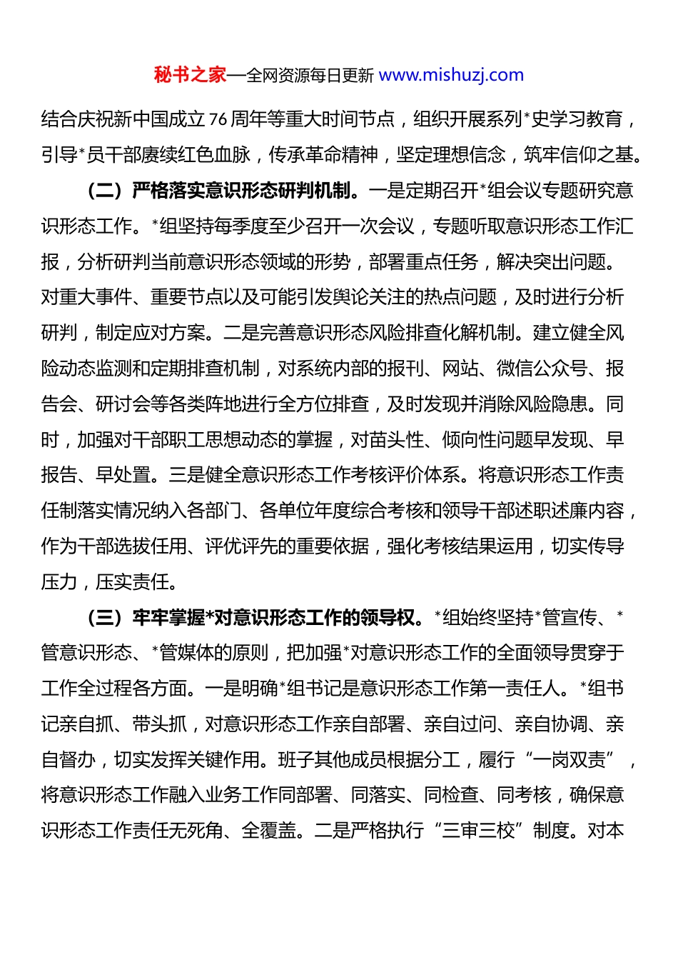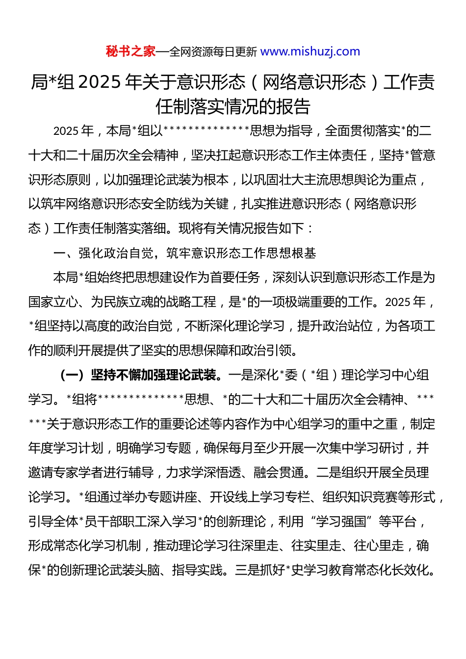 秘书之家—全网资源每日更新 www.mishuzj.com局*组 2025 年关于意识形态(网络意识形态)工作责任制落实情况的报告2025 年,本局*组以**************思想为指导,全面贯彻落实*的二十大和二十届历次全会精神,坚决扛起意识形态工作主体责任,坚持*管意识形态原则,以加强理论武装为根本,以巩固壮大主流思想舆论为重点,以筑牢网络意识形态安全防线为关键,扎实推进意识形态(网络意识形态)工作责任制落实落细。现将有关情况报告如下:一、强化政治自觉,筑牢意识形态工作思想根基本局*组始终把思想建设作为首要任务,深刻认识到意识形态工作是为国家立心、为民族立魂的战略工程,是*的一项极端重要的工作。2025 年,*组坚持以高度的政治自觉,不断深化理论学习,提升政治站位,为各项工作的顺利开展提供了坚实的思想保障和政治引领。(一)坚持不懈加强理论武装。一是深化*委(*组)理论学习中心组学习。*组将**************思想、*的二十大和二十届历次全会精神、******关于意识形态工作的重要论述等内容作为中心组学习的重中之重,制定年度学习计划,明确学习专题,确保每月至少开展一次集中学习研讨,并邀请专家学者进行辅导,力求学深悟透、融会贯通。二是组织开展全员理论学习。*组通过举办专题讲座、开设线上学习专栏、组织知识竞赛等形式,引导全体*员干部职工深入学习*的创新理论,利用“学习强国”等平台,形成常态化学习机制,推动理论学习往深里走、往实里走、往心里走,确保*的创新理论武装头脑、指导实践。三是抓好*史学习教育常态化长效化。秘书之家—全网资源每日更新 www.mishuzj.com结合庆祝新中国成立 76 周年等重大时间节点,组织开展系列*史学习教育,引导*员干部赓续红色血脉,传承革命精神,坚定理想信念,筑牢信仰之基。(二)严格落实意识形态研判机制。一是定期召开*组会议专题研究意识形态工作。*组坚持每季度至少召开一次会议,专题听取意识形态工作汇报,分析研判当前意识形态领域的形势,部署重点任务,解决突出问题。对重大事件、重要节点以及可能引发舆论关注的热点问题,及时进行分析研判,制定应对方案。二是完善意识形态风险排查化解机制。建立健全风险动态监测和定期排查机制,对系统内部的报刊、网站、微信公众号、报告会、研讨会等各类阵地进行全方位排查,及时发现并消除风险隐患。同时,加强对干部职工思想动态的掌握,对苗头性、倾向性问题早发现、早报告、早处置。三是健全意识形态工作考核评价体系。将意识形态工作责任制落实情况纳入各部门、各单位年度综合考核和领导干部述职述廉内容,作为干部选拔任用、评优评先的重要依据,强化考核结果运用,切实传导压力,压实责任。(三)牢牢掌握*对意识形态工作的领导权。*组始终坚持*管宣传、*管意识形态、*管媒体的原则,把加强*对意识形态工作的全面领导贯穿于工作全过程各方面。一是明确*组书记是意识形态工作第一责任人。*组书记亲自抓、带头抓,对意识形态工作亲自部署、亲自过问、亲自协调、亲自督办,切实发挥关键作用。班子其他成员根据分工,履行“一岗双责”,将意识形态工作融入业务工作同部署、同落实、同检查、同考核,确保意识形态工作责任无死角、全覆盖。二是严格执行“三审三校”制度。对本秘书之家—全网资源每日更新 www.mishuzj.com局发布的各类信息、宣传材料、内部刊物等,严格执行政治性、政策性、导向性审查,确保内容导向正确、表述准确、权威可靠。三是加强对意识形态阵地的管理。对本局主办的报刊、网站、微信公众号、微博等各类宣传平台,严格实行备案管理、主管负责制度,确保所有阵地都在*的领导下规范运行。二、全面落实主体责任,构建意识形态工作坚强防线本局*组坚持把落实意识形态工作责任制作为硬任务,构建科学严密的责任体系,确保各项工作有人抓、有人管、抓得实、有成效。(一)健全责任体系,层层压实责任链条。一是明确主体责任。*组作为本局意识形态工作的主体,对全局意识形态工作负总责。*组书记是第一责任人,对重要工作亲自部署,重要问题亲自过问,重要环节亲自协调,重要案件亲自督办。分管领导是直接责任人,按照职责分工抓好...