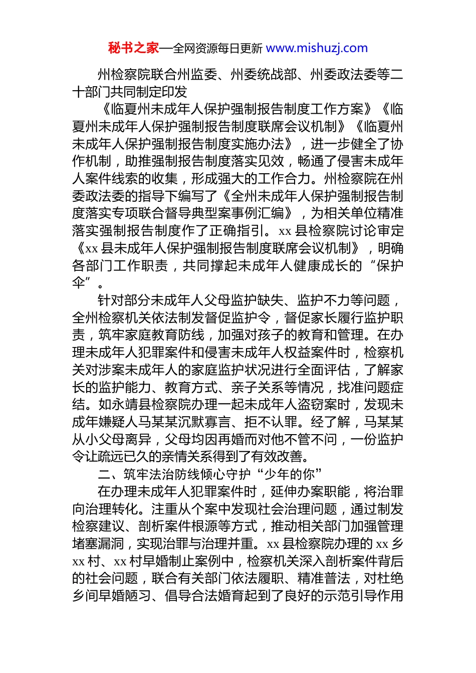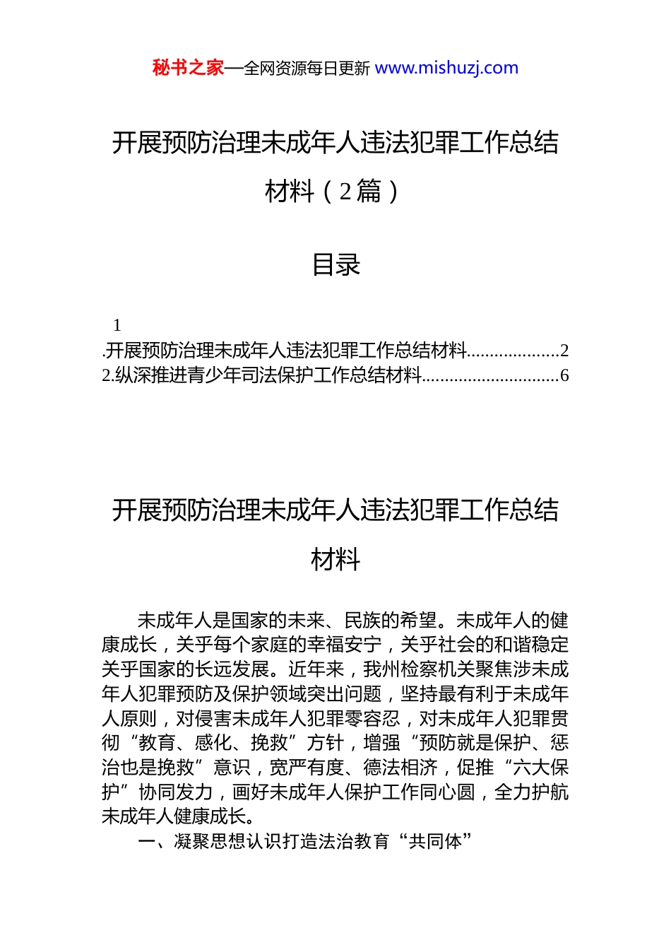 秘书之家—全网资源每日更新 www.mishuzj.com开展预防治理未成年人违法犯罪工作总结材料(2 篇)目录1.开展预防治理未成年人违法犯罪工作总结材料....................22.纵深推进青少年司法保护工作总结材料..............................6开展预防治理未成年人违法犯罪工作总结材料未成年人是国家的未来、民族的希望。未成年人的健康成长,关乎每个家庭的幸福安宁,关乎社会的和谐稳定关乎国家的长远发展。近年来,我州检察机关聚焦涉未成年人犯罪预防及保护领域突出问题,坚持最有利于未成年人原则,对侵害未成年人犯罪零容忍,对未成年人犯罪贯彻“教育、感化、挽救”方针,增强“预防就是保护、惩治也是挽救”意识,宽严有度、德法相济,促推“六大保护”协同发力,画好未成年人保护工作同心圆,全力护航未成年人健康成长。一、凝聚思想认识打造法治教育“共同体”秘书之家—全网资源每日更新 www.mishuzj.com州检察院联合州监委、州委统战部、州委政法委等二十部门共同制定印发《临夏州未成年人保护强制报告制度工作方案》《临夏州未成年人保护强制报告制度联席会议机制》《临夏州未成年人保护强制报告制度实施办法》,进一步健全了协作机制,助推强制报告制度落实见效,畅通了侵害未成年人案件线索的收集,形成强大的工作合力。州检察院在州委政法委的指导下编写了《全州未成年人保护强制报告制度落实专项联合督导典型案事例汇编》,为相关单位精准落实强制报告制度作了正确指引。xx 县检察院讨论审定《xx 县未成年人保护强制报告制度联席会议机制》,明确各部门工作职责,共同撑起未成年人健康成长的“保护伞”。针对部分未成年人父母监护缺失、监护不力等问题,全州检察机关依法制发督促监护令,督促家长履行监护职责,筑牢家庭教育防线,加强对孩子的教育和管理。在办理未成年人犯罪案件和侵害未成年人权益案件时,检察机关对涉案未成年人的家庭监护状况进行全面评估,了解家长的监护能力、教育方式、亲子关系等情况,找准问题症结。如永靖县检察院办理一起未成年人盗窃案时,发现未成年嫌疑人马某某沉默寡言、拒不认罪。经了解,马某某从小父母离异,父母均因再婚而对他不管不问,一份监护令让疏远已久的亲情关系得到了有效改善。二、筑牢法治防线倾心守护“少年的你”在办理未成年人犯罪案件时,延伸办案职能,将治罪向治理转化。注重从个案中发现社会治理问题,通过制发检察建议、剖析案件根源等方式,推动相关部门加强管理堵塞漏洞,实现治罪与治理并重。xx 县检察院办理的 xx 乡xx 村、xx 村早婚制止案例中,检察机关深入剖析案件背后的社会问题,联合有关部门依法履职、精准普法,对杜绝乡间早婚陋习、倡导合法婚育起到了良好的示范引导作用秘书之家—全网资源每日更新 www.mishuzj.com该案例入选临夏州委政法委典型案例选编和省检察院《民事检察工作情况反映》。xx 县检察院在办理某案件时,发现网吧、酒吧等娱乐场所违规接纳、招用未成年人等情况后,针对相关单位执行、监管不力、强制报告落实不到位的问题,及时制发检察建议,被建议单位及时整改回复,以检察建议推动行业治理。全州检察机关始终坚持“教育、感化、挽救”方针,惩护双向赋能,落实特殊保护制度,最大限度保护未成年人合法权益。对侵害未成年人的犯罪行为,坚持“零容忍”态度,依法从严、从快批捕、起诉,绝不姑息迁就,依法严惩侵害未成年人犯罪。在办理未成年人犯罪案件时严格落实未成年人刑事案件特别程序,如法律援助、法定代理人或合适成年人到场、社会调查、附条件不起诉、犯罪记录封存等,充分保障未成年人的诉讼权利。同时,建立健全未成年被害人关爱救助机制,对遭受侵害的未成年被害人,及时提供法律援助、心理疏导、司法救助等多元化救助措施,帮助他们走出心理阴影,恢复正常生活。三、主动履职尽责当好平安校园“护苗人”坚持“预防就是保护,惩治也是挽救”的理念,不断强化未成年人犯罪源头预防。持续加强未成年人法治教育优化预防措施,打造健康成长环境。临夏县检察院在临夏县漓水中学建成全州首个法治教育基地,研学学生累计达xxxx 多人次。全州检察机关同步推...
