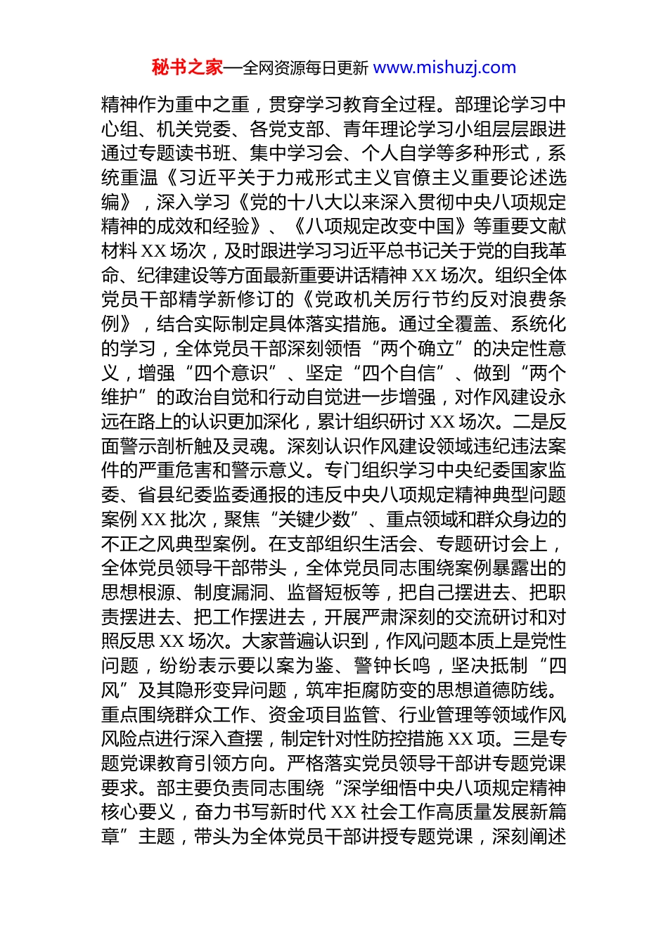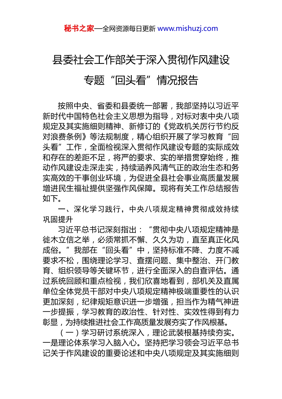 秘书之家—全网资源每日更新 www.mishuzj.com县委社会工作部关于深入贯彻作风建设专题“回头看”情况报告按照中央、省委和县委统一部署,我部坚持以习近平新时代中国特色社会主义思想为指导,对标对表中央八项规定及其实施细则精神、新修订的《党政机关厉行节约反对浪费条例》等法规制度,精心组织开展了学习教育“回头看”工作,全面检视深入贯彻作风建设专题的实际成效和存在的差距不足,将严的要求、实的举措贯穿始终,推动作风建设走深走实,持续涵养风清气正的政治生态和务实高效的干事创业环境,为促进全县社会事业高质量发展增进民生福祉提供坚强作风保障。现将有关工作总结报告如下。一、深化学习践行,中央八项规定精神贯彻成效持续巩固提升习近平总书记深刻指出:“贯彻中央八项规定精神是徙木立信之举,必须常抓不懈、久久为功,直至真正化风成俗。”我部在“回头看”中,坚持标准不降、力度不减要求不松,围绕理论学习、查摆问题、集中整治、开门教育、组织领导等关键环节,进行全面深入的自查评估。通过系统回顾和重点检视,我们欣喜地看到,部机关及直属单位全体党员干部对中央八项规定精神极端重要性的认识更加深刻,纪律规矩意识进一步增强,担当作为精气神进一步提振,学习教育的政治性、针对性、实效性得到有力彰显,为持续推进社会工作高质量发展夯实了作风根基。(一)学习研讨系统深入,理论武装根基持续夯实。一是理论体系学习入脑入心。坚持把学习领会习近平总书记关于作风建设的重要论述和中央八项规定及其实施细则秘书之家—全网资源每日更新 www.mishuzj.com精神作为重中之重,贯穿学习教育全过程。部理论学习中心组、机关党委、各党支部、青年理论学习小组层层跟进通过专题读书班、集中学习会、个人自学等多种形式,系统重温《习近平关于力戒形式主义官僚主义重要论述选编》,深入学习《党的十八大以来深入贯彻中央八项规定精神的成效和经验》、《八项规定改变中国》等重要文献材料 XX 场次,及时跟进学习习近平总书记关于党的自我革命、纪律建设等方面最新重要讲话精神 XX 场次。组织全体党员干部精学新修订的《党政机关厉行节约反对浪费条例》,结合实际制定具体落实措施。通过全覆盖、系统化的学习,全体党员干部深刻领悟“两个确立”的决定性意义,增强“四个意识”、坚定“四个自信”、做到“两个维护”的政治自觉和行动自觉进一步增强,对作风建设永远在路上的认识更加深化,累计组织研讨 XX 场次。二是反面警示剖析触及灵魂。深刻认识作风建设领域违纪违法案件的严重危害和警示意义。专门组织学习中央纪委国家监委、省县纪委监委通报的违反中央八项规定精神典型问题案例 XX 批次,聚焦“关键少数”、重点领域和群众身边的不正之风典型案例。在支部组织生活会、专题研讨会上,全体党员领导干部带头,全体党员同志围绕案例暴露出的思想根源、制度漏洞、监督短板等,把自己摆进去、把职责摆进去、把工作摆进去,开展严肃深刻的交流研讨和对照反思 XX 场次。大家普遍认识到,作风问题本质上是党性问题,纷纷表示要以案为鉴、警钟长鸣,坚决抵制“四风”及其隐形变异问题,筑牢拒腐防变的思想道德防线。重点围绕群众工作、资金项目监管、行业管理等领域作风风险点进行深入查摆,制定针对性防控措施 XX 项。三是专题党课教育引领方向。严格落实党员领导干部讲专题党课要求。部主要负责同志围绕“深学细悟中央八项规定精神核心要义,奋力书写新时代 XX 社会工作高质量发展新篇章”主题,带头为全体党员干部讲授专题党课,深刻阐述秘书之家—全网资源每日更新 www.mishuzj.com中央八项规定精神的深远意义、核心内容和实践要求,并结合社会工作职责定位提出明确落实要求。部领导班子其他成员分别在分管领域、所在支部讲授专题党课,联系工作实际谈认识、讲体会、提要求,强调社会工作服务群众的特殊重要性,要求每一位党员干部都必须成为优良作风的坚定践行者和守护者。XX 名处级以上党员领导干部按要求讲专题党课 XX 次,覆盖党员干部 XX 人次,起到了统一思想、深化认识、凝聚力量的良好效果。四是知行合一导向更加鲜明。坚持把...