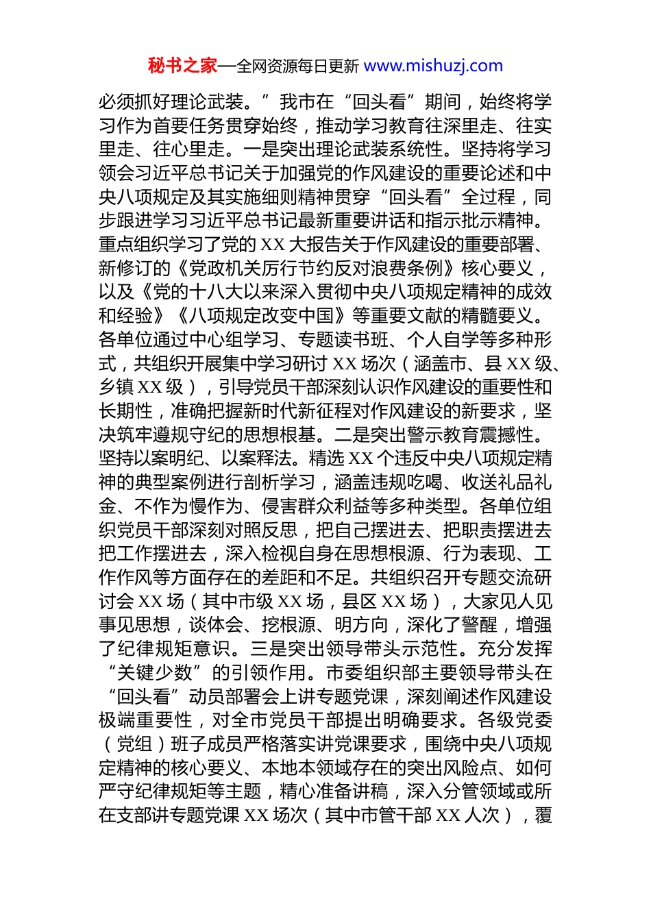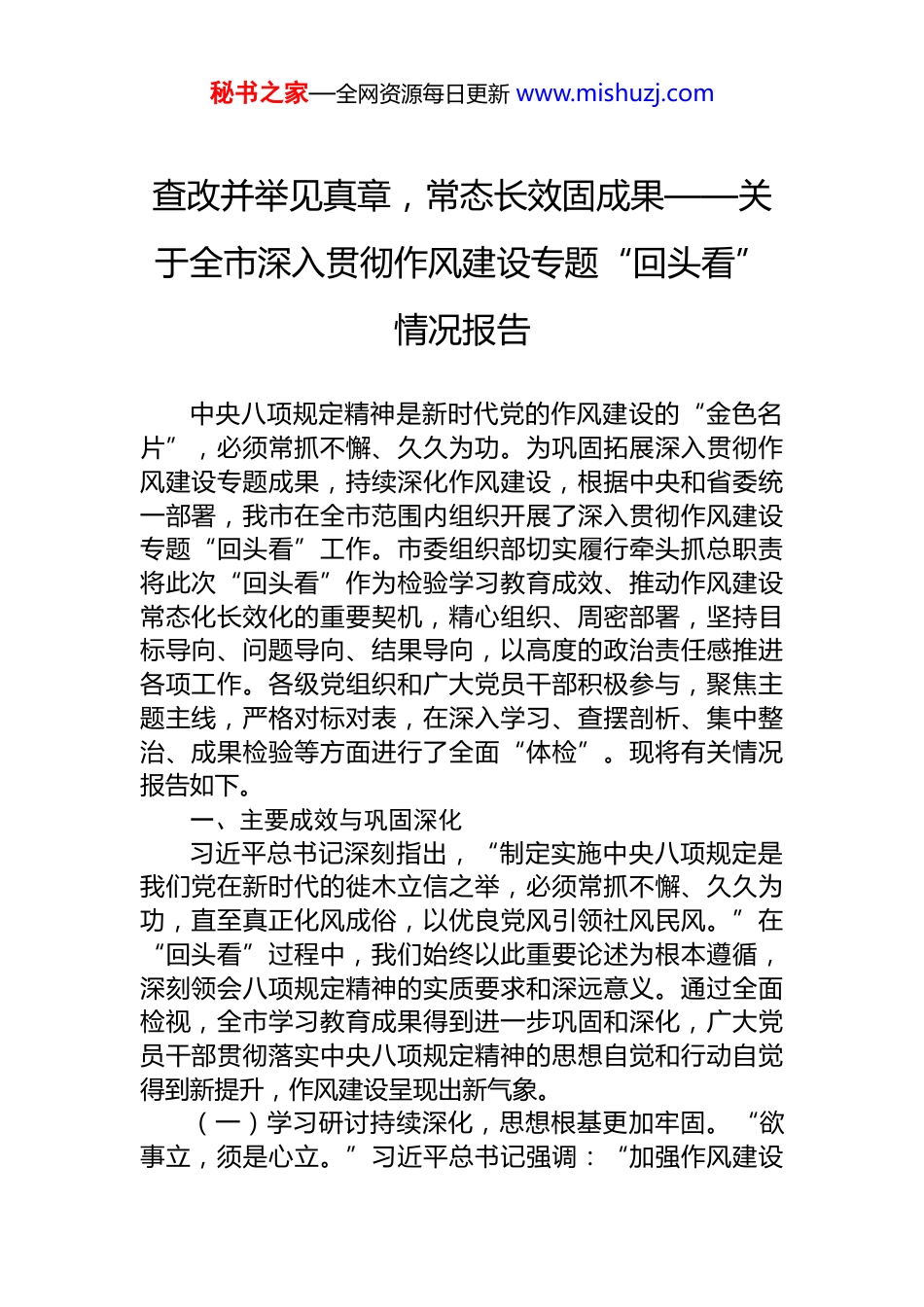 秘书之家—全网资源每日更新 www.mishuzj.com查改并举见真章,常态长效固成果——关于全市深入贯彻作风建设专题“回头看”情况报告中央八项规定精神是新时代党的作风建设的“金色名片”,必须常抓不懈、久久为功。为巩固拓展深入贯彻作风建设专题成果,持续深化作风建设,根据中央和省委统一部署,我市在全市范围内组织开展了深入贯彻作风建设专题“回头看”工作。市委组织部切实履行牵头抓总职责将此次“回头看”作为检验学习教育成效、推动作风建设常态化长效化的重要契机,精心组织、周密部署,坚持目标导向、问题导向、结果导向,以高度的政治责任感推进各项工作。各级党组织和广大党员干部积极参与,聚焦主题主线,严格对标对表,在深入学习、查摆剖析、集中整治、成果检验等方面进行了全面“体检”。现将有关情况报告如下。一、主要成效与巩固深化习近平总书记深刻指出,“制定实施中央八项规定是我们党在新时代的徙木立信之举,必须常抓不懈、久久为功,直至真正化风成俗,以优良党风引领社风民风。”在“回头看”过程中,我们始终以此重要论述为根本遵循,深刻领会八项规定精神的实质要求和深远意义。通过全面检视,全市学习教育成果得到进一步巩固和深化,广大党员干部贯彻落实中央八项规定精神的思想自觉和行动自觉得到新提升,作风建设呈现出新气象。(一)学习研讨持续深化,思想根基更加牢固。“欲事立,须是心立。”习近平总书记强调:“加强作风建设秘书之家—全网资源每日更新 www.mishuzj.com必须抓好理论武装。”我市在“回头看”期间,始终将学习作为首要任务贯穿始终,推动学习教育往深里走、往实里走、往心里走。一是突出理论武装系统性。坚持将学习领会习近平总书记关于加强党的作风建设的重要论述和中央八项规定及其实施细则精神贯穿“回头看”全过程,同步跟进学习习近平总书记最新重要讲话和指示批示精神。重点组织学习了党的 XX 大报告关于作风建设的重要部署、新修订的《党政机关厉行节约反对浪费条例》核心要义,以及《党的十八大以来深入贯彻中央八项规定精神的成效和经验》《八项规定改变中国》等重要文献的精髓要义。各单位通过中心组学习、专题读书班、个人自学等多种形式,共组织开展集中学习研讨 XX 场次(涵盖市、县 XX 级、乡镇 XX 级),引导党员干部深刻认识作风建设的重要性和长期性,准确把握新时代新征程对作风建设的新要求,坚决筑牢遵规守纪的思想根基。二是突出警示教育震撼性。坚持以案明纪、以案释法。精选 XX 个违反中央八项规定精神的典型案例进行剖析学习,涵盖违规吃喝、收送礼品礼金、不作为慢作为、侵害群众利益等多种类型。各单位组织党员干部深刻对照反思,把自己摆进去、把职责摆进去把工作摆进去,深入检视自身在思想根源、行为表现、工作作风等方面存在的差距和不足。共组织召开专题交流研讨会 XX 场(其中市级 XX 场,县区 XX 场),大家见人见事见思想,谈体会、挖根源、明方向,深化了警醒,增强了纪律规矩意识。三是突出领导带头示范性。充分发挥“关键少数”的引领作用。市委组织部主要领导带头在“回头看”动员部署会上讲专题党课,深刻阐述作风建设极端重要性,对全市党员干部提出明确要求。各级党委(党组)班子成员严格落实讲党课要求,围绕中央八项规定精神的核心要义、本地本领域存在的突出风险点、如何严守纪律规矩等主题,精心准备讲稿,深入分管领域或所在支部讲专题党课 XX 场次(其中市管干部 XX 人次),覆秘书之家—全网资源每日更新 www.mishuzj.com盖党员干部 XX 人次,有效引导广大党员干部知敬畏、存戒惧、守底线。四是突出成果转化实效性。推动学思用贯通知信行统一。通过学习研讨和警示教育,党员干部普遍反映,对八项规定精神的理解更加深刻,纪律“红线”更加清晰,廉洁用权的自觉性进一步增强。XX%的参学人员在心得体会中明确表示,要以案为鉴,时刻绷紧纪律之弦,自觉净化社交圈、生活圈、朋友圈。理论学习成果正持续转化为推动工作、改进作风的实际成效,体现在日常管理的细微之处和为民服务的具体实践中。(二)问题查摆刀刃向内,自我画像更加精准。“天下之...