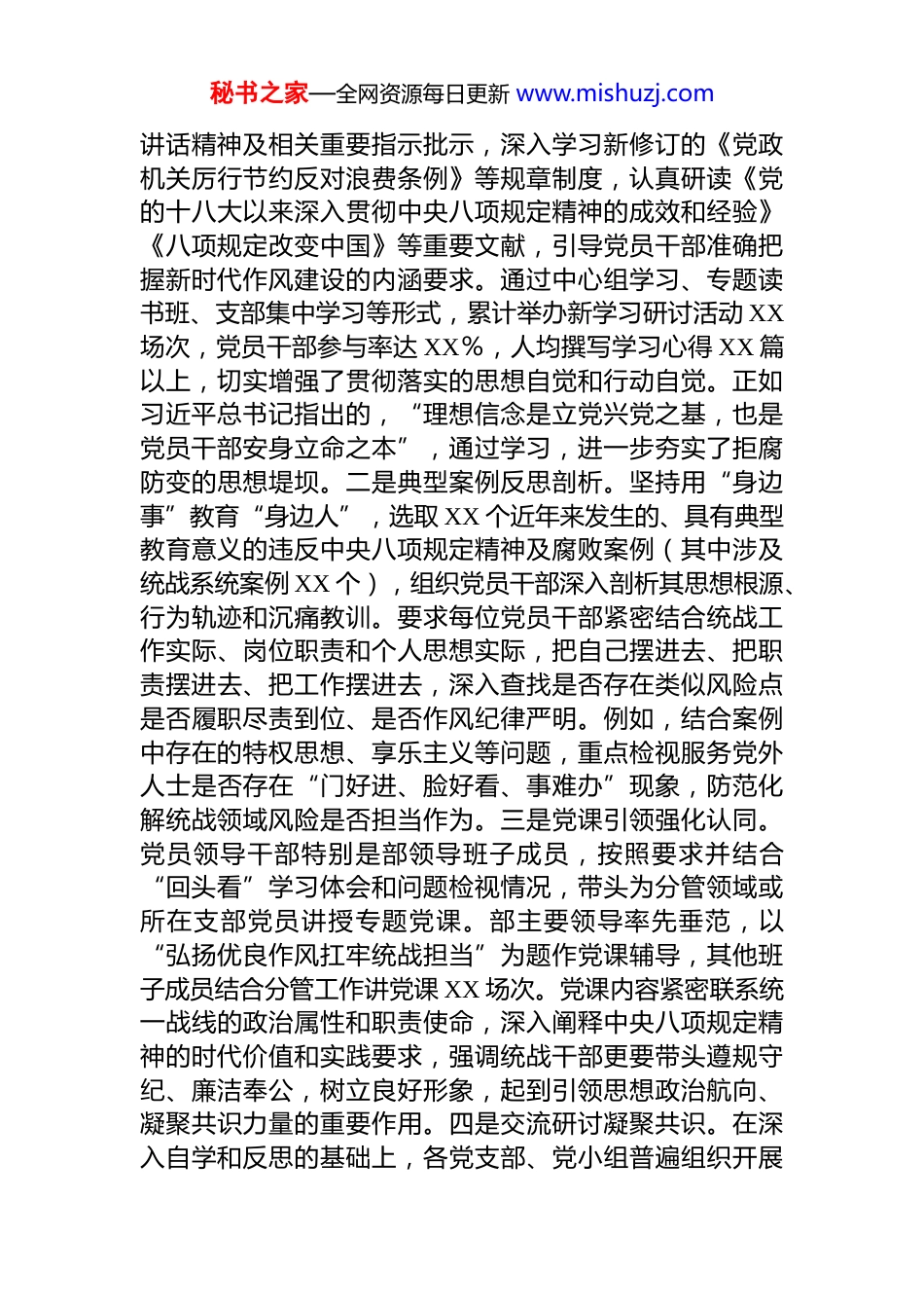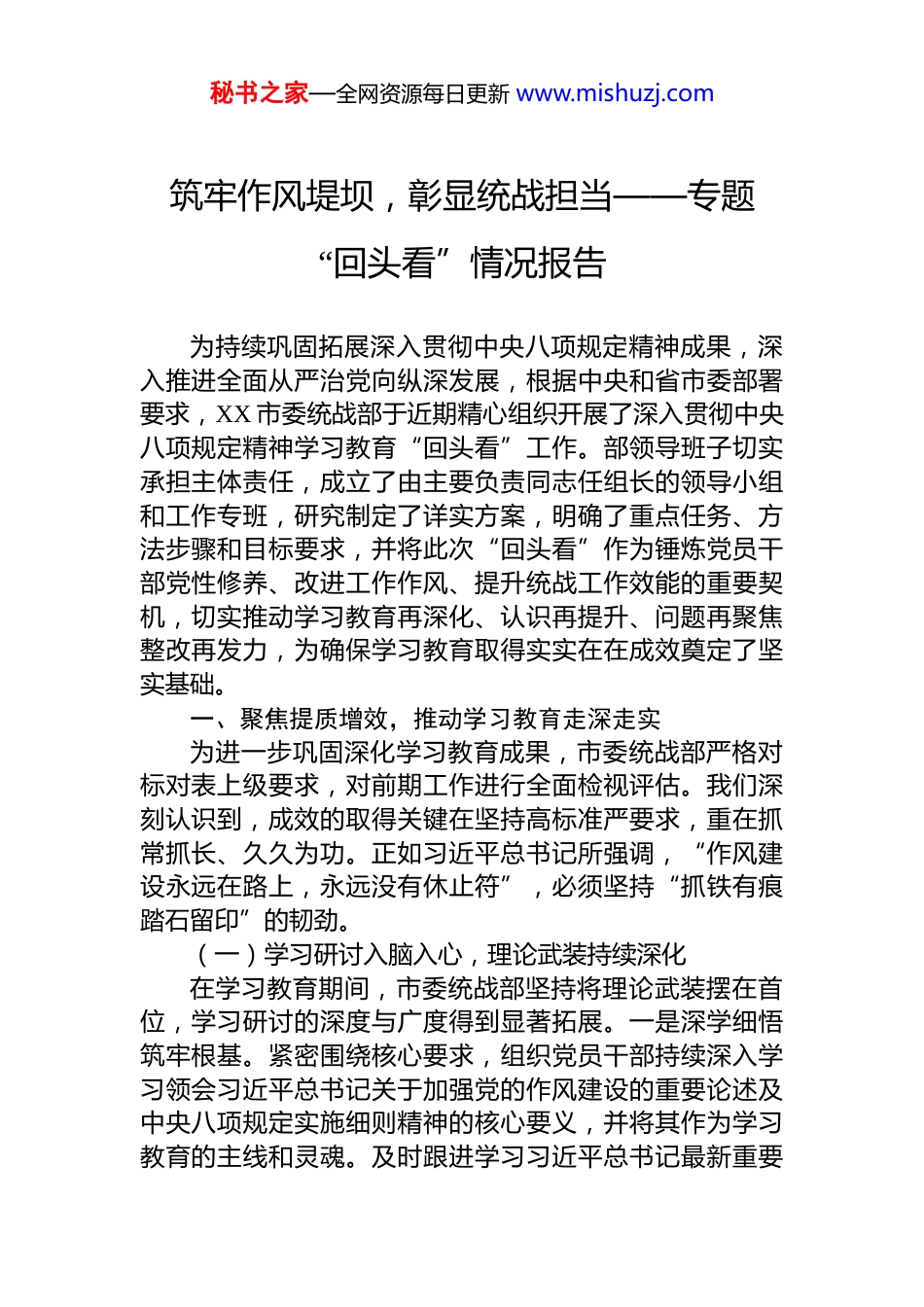 秘书之家—全网资源每日更新 www.mishuzj.com筑牢作风堤坝,彰显统战担当——专题“回头看”情况报告为持续巩固拓展深入贯彻中央八项规定精神成果,深入推进全面从严治党向纵深发展,根据中央和省市委部署要求,XX 市委统战部于近期精心组织开展了深入贯彻中央八项规定精神学习教育“回头看”工作。部领导班子切实承担主体责任,成立了由主要负责同志任组长的领导小组和工作专班,研究制定了详实方案,明确了重点任务、方法步骤和目标要求,并将此次“回头看”作为锤炼党员干部党性修养、改进工作作风、提升统战工作效能的重要契机,切实推动学习教育再深化、认识再提升、问题再聚焦整改再发力,为确保学习教育取得实实在在成效奠定了坚实基础。一、聚焦提质增效,推动学习教育走深走实为进一步巩固深化学习教育成果,市委统战部严格对标对表上级要求,对前期工作进行全面检视评估。我们深刻认识到,成效的取得关键在坚持高标准严要求,重在抓常抓长、久久为功。正如习近平总书记所强调,“作风建设永远在路上,永远没有休止符”,必须坚持“抓铁有痕踏石留印”的韧劲。(一)学习研讨入脑入心,理论武装持续深化在学习教育期间,市委统战部坚持将理论武装摆在首位,学习研讨的深度与广度得到显著拓展。一是深学细悟筑牢根基。紧密围绕核心要求,组织党员干部持续深入学习领会习近平总书记关于加强党的作风建设的重要论述及中央八项规定实施细则精神的核心要义,并将其作为学习教育的主线和灵魂。及时跟进学习习近平总书记最新重要秘书之家—全网资源每日更新 www.mishuzj.com讲话精神及相关重要指示批示,深入学习新修订的《党政机关厉行节约反对浪费条例》等规章制度,认真研读《党的十八大以来深入贯彻中央八项规定精神的成效和经验》《八项规定改变中国》等重要文献,引导党员干部准确把握新时代作风建设的内涵要求。通过中心组学习、专题读书班、支部集中学习等形式,累计举办新学习研讨活动 XX场次,党员干部参与率达 XX%,人均撰写学习心得 XX 篇以上,切实增强了贯彻落实的思想自觉和行动自觉。正如习近平总书记指出的,“理想信念是立党兴党之基,也是党员干部安身立命之本”,通过学习,进一步夯实了拒腐防变的思想堤坝。二是典型案例反思剖析。坚持用“身边事”教育“身边人”,选取 XX 个近年来发生的、具有典型教育意义的违反中央八项规定精神及腐败案例(其中涉及统战系统案例 XX 个),组织党员干部深入剖析其思想根源、行为轨迹和沉痛教训。要求每位党员干部紧密结合统战工作实际、岗位职责和个人思想实际,把自己摆进去、把职责摆进去、把工作摆进去,深入查找是否存在类似风险点是否履职尽责到位、是否作风纪律严明。例如,结合案例中存在的特权思想、享乐主义等问题,重点检视服务党外人士是否存在“门好进、脸好看、事难办”现象,防范化解统战领域风险是否担当作为。三是党课引领强化认同。党员领导干部特别是部领导班子成员,按照要求并结合“回头看”学习体会和问题检视情况,带头为分管领域或所在支部党员讲授专题党课。部主要领导率先垂范,以“弘扬优良作风扛牢统战担当”为题作党课辅导,其他班子成员结合分管工作讲党课 XX 场次。党课内容紧密联系统一战线的政治属性和职责使命,深入阐释中央八项规定精神的时代价值和实践要求,强调统战干部更要带头遵规守纪、廉洁奉公,树立良好形象,起到引领思想政治航向、凝聚共识力量的重要作用。四是交流研讨凝聚共识。在深入自学和反思的基础上,各党支部、党小组普遍组织开展秘书之家—全网资源每日更新 www.mishuzj.com了“回头看”专题交流研讨活动 XX 次。党员干部结合学习心得、案例剖析和个人思想工作实际,围绕“如何坚守底线、廉洁履职”、“如何改进作风、提升服务”、“如何担当作为、防范风险”等主题进行热烈讨论,发言聚焦问题、触及思想、碰撞火花。共形成研讨交流材料 XX 份,梳理出需在下一阶段重点关注的潜在风险点 XX 条,有效深化了对纪律规矩的敬畏之心、对廉洁用权的行动自觉。(二)查摆问题刀刃向内,找准病灶精准发力在深化学习教育基础上,查摆问题坚持从严从...