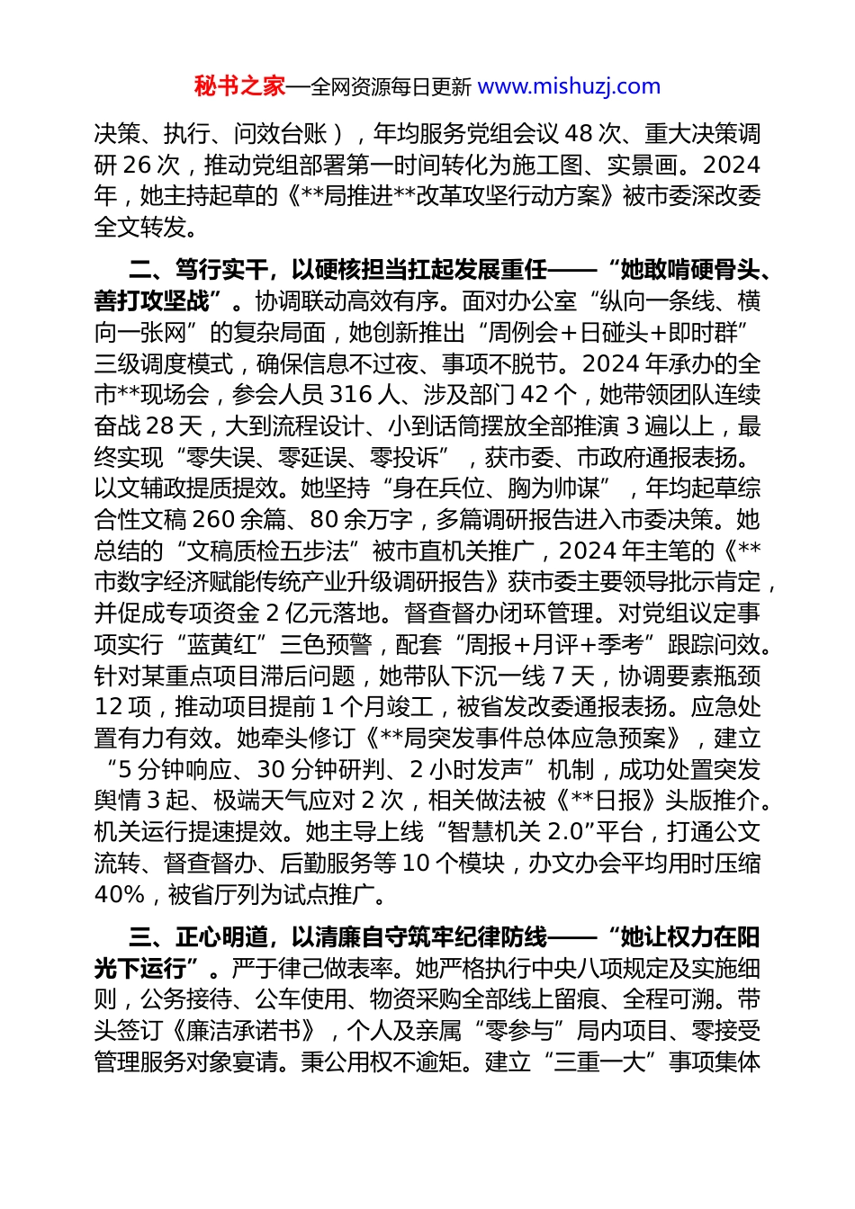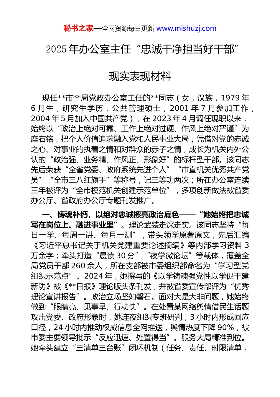 秘书之家—全网资源每日更新 www.mishuzj.com 2025 年办公室主任“忠诚干净担当好干部”现实表现材料现任**市**局党政办公室主任的**同志(女,汉族,1979 年6 月生,研究生学历,公共管理硕士,2001 年 7 月参加工作,2004 年 5 月加入中国共产党),在 2023 年 4 月调任现职以来,始终以“政治上绝对可靠、工作上绝对过硬、作风上绝对严谨”为座右铭,把个人价值追求融入党和人民事业大局,凭借对党的赤诚之心、对事业的执着之情和对群众的赤子之情,成长为机关内外公认的“政治强、业务精、作风正、形象好”的标杆型干部。该同志先后荣获“全省党委、政府系统先进个人”“市直机关优秀共产党员”“全市三八红旗手”等称号,记三等功两次;所在办公室连续三年被评为“全市模范机关创建示范单位”,多项创新做法被省委办公厅、省政府办公厅专题刊发推广。一、铸魂补钙,以绝对忠诚擦亮政治底色——“她始终把忠诚写在岗位上、融进事业里”。理论武装走深走实。该同志坚持“每日一学、每周一讲、每月一测”,带头领学原著原文,先后汇编《习近平总书记关于机关党建重要论述摘编》等内部学习资料 3万余字;牵头打造“晨读 30 分”“夜学微论坛”等载体,覆盖全局党员干部 260 余人,所在支部被市委组织部命名为“学习型党组织示范点”。2024 年,她撰写的《以学铸魂强党性以学促干建新功》被《**日报》理论版头条刊发,并被省委宣传部评为“优秀理论宣讲报告”。政治立场坚如磐石。面对大是大非问题,她始终做到“眼睛亮、见事早、行动快”。在处置某网络舆情借民生话题攻击党委、政府形象时,她连夜组织专班研判,3 小时内形成回应口径,24 小时内推动权威信息全网推送,舆情热度下降 90%,被市委主要领导批示“反应迅速、处置得当”。服务大局精准到位。她牵头建立“三清单三台账”闭环机制(任务、责任、时限清单,秘书之家—全网资源每日更新 www.mishuzj.com决策、执行、问效台账),年均服务党组会议 48 次、重大决策调研 26 次,推动党组部署第一时间转化为施工图、实景画。2024年,她主持起草的《**局推进**改革攻坚行动方案》被市委深改委全文转发。二、笃行实干,以硬核担当扛起发展重任——“她敢啃硬骨头、善打攻坚战”。协调联动高效有序。面对办公室“纵向一条线、横向一张网”的复杂局面,她创新推出“周例会+日碰头+即时群”三级调度模式,确保信息不过夜、事项不脱节。2024 年承办的全市**现场会,参会人员 316 人、涉及部门 42 个,她带领团队连续奋战 28 天,大到流程设计、小到话筒摆放全部推演 3 遍以上,最终实现“零失误、零延误、零投诉”,获市委、市政府通报表扬。以文辅政提质提效。她坚持“身在兵位、胸为帅谋”,年均起草综合性文稿 260 余篇、80 余万字,多篇调研报告进入市委决策。她总结的“文稿质检五步法”被市直机关推广,2024 年主笔的《**市数字经济赋能传统产业升级调研报告》获市委主要领导批示肯定,并促成专项资金 2 亿元落地。督查督办闭环管理。对党组议定事项实行“蓝黄红”三色预警,配套“周报+月评+季考”跟踪问效。针对某重点项目滞后问题,她带队下沉一线 7 天,协调要素瓶颈12 项,推动项目提前 1 个月竣工,被省发改委通报表扬。应急处置有力有效。她牵头修订《**局突发事件总体应急预案》,建立“5 分钟响应、30 分钟研判、2 小时发声”机制,成功处置突发舆情 3 起、极端天气应对 2 次,相关做法被《**日报》头版推介。机关运行提速提效。她主导上线“智慧机关 2.0”平台,打通公文流转、督查督办、后勤服务等 10 个模块,办文办会平均用时压缩40%,被省厅列为试点推广。三、正心明道,以清廉自守筑牢纪律防线——“她让权力在阳光下运行”。严于律己做表率。她严格执行中央八项规定及实施细则,公务接待、公车使用、物资采购全部线上留痕、全程可溯。带头签订《廉洁承诺书》,个人及亲属“零参与”局内项目、零接受管理服务对象宴请。秉公用权不逾矩。建立“三重一大”事项集体秘书之家—全网资源每日更新 www.mishuzj.com研究、法律顾问前置把关、纪检部门全...