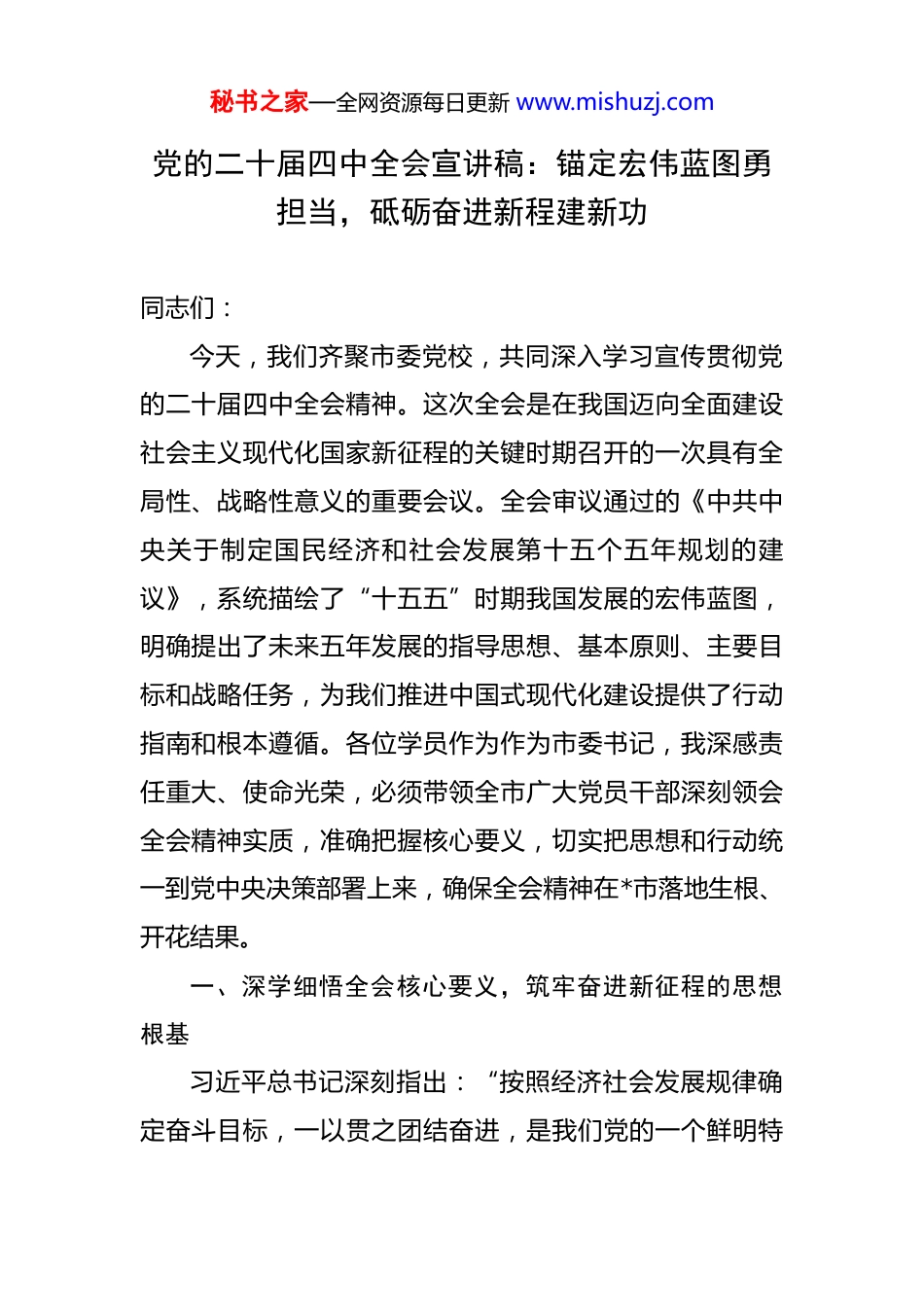 秘书之家—全网资源每日更新 www.mishuzj.com党的二十届四中全会宣讲稿:锚定宏伟蓝图勇担当,砥砺奋进新程建新功 同志们:今天,我们齐聚市委党校,共同深入学习宣传贯彻党的二十届四中全会精神。这次全会是在我国迈向全面建设社会主义现代化国家新征程的关键时期召开的一次具有全局性、战略性意义的重要会议。全会审议通过的《中共中央关于制定国民经济和社会发展第十五个五年规划的建议》,系统描绘了“十五五”时期我国发展的宏伟蓝图,明确提出了未来五年发展的指导思想、基本原则、主要目标和战略任务,为我们推进中国式现代化建设提供了行动指南和根本遵循。各位学员作为作为市委书记,我深感责任重大、使命光荣,必须带领全市广大党员干部深刻领会全会精神实质,准确把握核心要义,切实把思想和行动统一到党中央决策部署上来,确保全会精神在*市落地生根、开花结果。一、深学细悟全会核心要义,筑牢奋进新征程的思想根基习近平总书记深刻指出:“按照经济社会发展规律确定奋斗目标,一以贯之团结奋进,是我们党的一个鲜明特秘书之家—全网资源每日更新 www.mishuzj.com点和独特优势。”这一重要论述揭示了党和国家事业发展的内在规律,为我们深刻理解党的二十届四中全会的重大意义提供了根本遵循。全会系统总结了“十四五”时期的辉煌成就,科学分析了“十五五”时期面临的新形势新任务,全面部署了未来五年的发展战略,凝聚了全党全国各族人民的共识,展现了党中央高瞻远瞩的战略眼光和驾驭复杂局面的卓越能力。我们必须站在党和国家事业发展全局的高度,深刻领会全会的重大政治意义、理论意义和实践意义,不断增强学习贯彻的思想自觉、政治自觉和行动自觉,为全面建设社会主义现代化国家贡献*力量。(一)深刻领会全会的时代背景与战略意义党的二十届四中全会召开于我国发展进入战略机遇和风险挑战并存、不确定难预料因素增多的时期。全会准确把握“十五五”时期党和国家事业发展所处历史方位,深入分析我国发展环境面临的深刻复杂变化,对未来五年发展作出顶层设计和战略擘画。习近平总书记强调,“十五五”时期是基本实现社会主义现代化夯实基础、全面发力的关键时期,在基本实现社会主义现代化进程中具有承前启后的重要地位。这一重大判断体现了党中央对时代特征的精准把握和对发展规律的深刻认识。全会通过的《建议》是指导“十五五”时期经济社会发展的纲领性文件,秘书之家—全网资源每日更新 www.mishuzj.com充分体现了习近平新时代中国特色社会主义思想的世界观和方法论,贯穿了立足新发展阶段、完整准确全面贯彻新发展理念、构建新发展格局的内在要求。我们要深刻认识到,学习贯彻全会精神是当前和今后一个时期全党全国的重大政治任务,必须精心组织、周密部署,确保全会精神入脑入心、见行见效。“十四五”时期我国发展历程极不寻常、极不平凡。面对错综复杂的国际形势和艰巨繁重的国内改革发展稳定任务,以习近平同志为核心的党中央团结带领全党全国各族人民,迎难而上、砥砺前行,推动党和国家事业取得新的重大成就。我国经济实力、科技实力、综合国力跃上新台阶,中国式现代化迈出新的坚实步伐。经济总量连续跨越110 万亿元、120 万亿元、130 万亿元台阶,预计 2025年底达到 140 万亿元左右;全球创新指数排名跃升至第 10名,成为创新力提升最快的经济体之一;人均国内生产总值连续两年超过 1.3 万美元。这些成就的取得,根本在于习近平总书记掌舵领航,在于习近平新时代中国特色社会主义思想科学指引。实践证明,“两个确立”对于我们应对各种风险挑战、推进中国式现代化具有决定性意义,是新时代新征程推进中国式现代化、续写两大奇迹新篇章的根本政治保证。秘书之家—全网资源每日更新 www.mishuzj.com(二)准确把握“十五五”时期的指导原则与目标任务“十五五”时期经济社会发展必须坚持马克思列宁主义、毛泽东思想、邓小平理论、“三个代表”重要思想、科学发展观,全面贯彻习近平新时代中国特色社会主义思想,深入贯彻党的二十大和二十届历次全会精神。全会提出的“五个以”“两个推动”“一个确保”要求,构成了有机统一的整体,明...