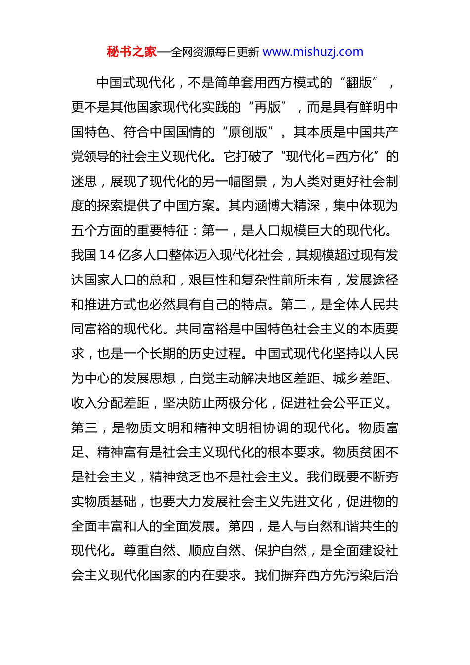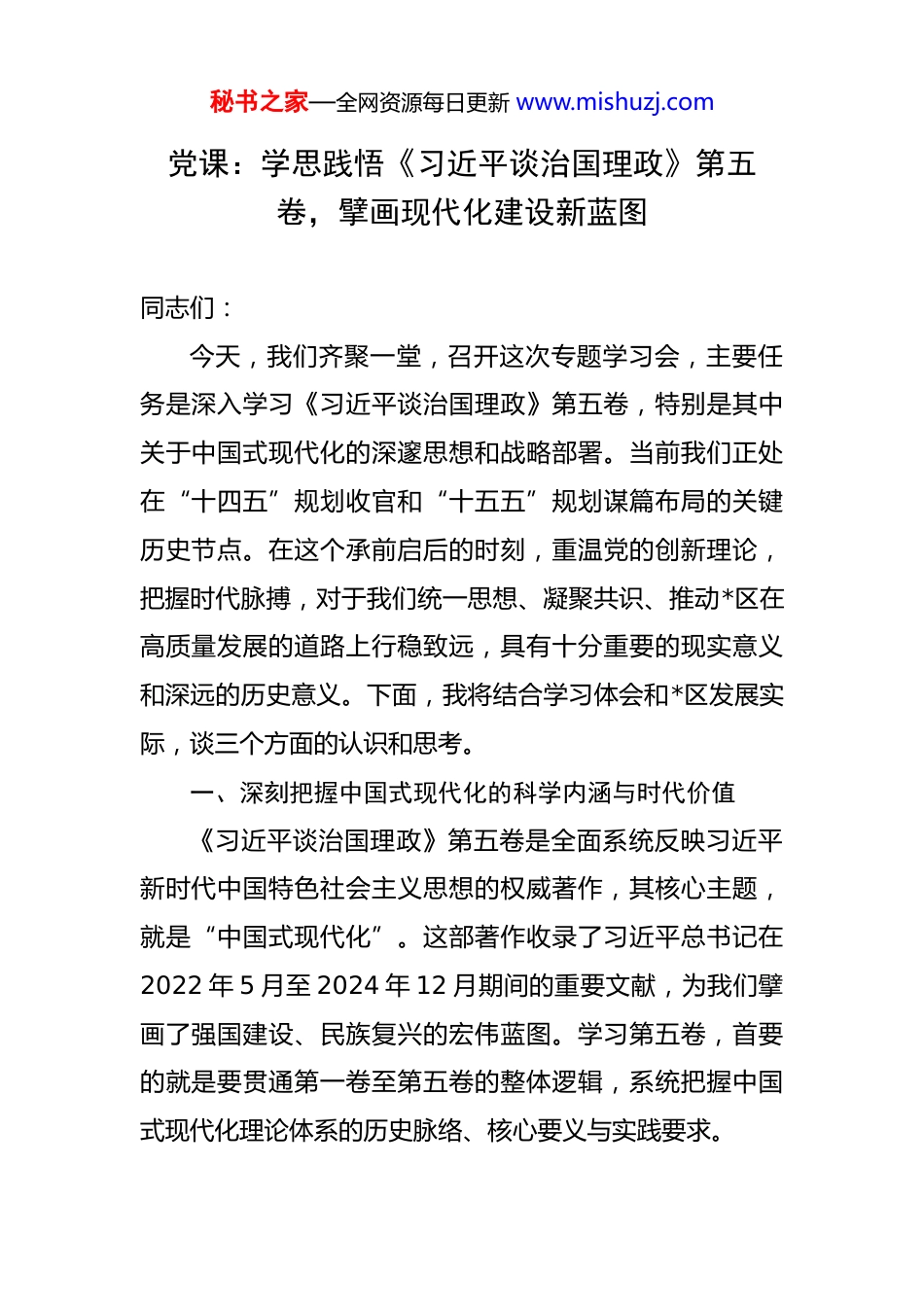 秘书之家—全网资源每日更新 www.mishuzj.com党课:学思践悟《习近平谈治国理政》第五卷,擘画现代化建设新蓝图 同志们:今天,我们齐聚一堂,召开这次专题学习会,主要任务是深入学习《习近平谈治国理政》第五卷,特别是其中关于中国式现代化的深邃思想和战略部署。当前我们正处在“十四五”规划收官和“十五五”规划谋篇布局的关键历史节点。在这个承前启后的时刻,重温党的创新理论,把握时代脉搏,对于我们统一思想、凝聚共识、推动*区在高质量发展的道路上行稳致远,具有十分重要的现实意义和深远的历史意义。下面,我将结合学习体会和*区发展实际,谈三个方面的认识和思考。一、深刻把握中国式现代化的科学内涵与时代价值《习近平谈治国理政》第五卷是全面系统反映习近平新时代中国特色社会主义思想的权威著作,其核心主题,就是“中国式现代化”。这部著作收录了习近平总书记在2022 年 5 月至 2024 年 12 月期间的重要文献,为我们擘画了强国建设、民族复兴的宏伟蓝图。学习第五卷,首要的就是要贯通第一卷至第五卷的整体逻辑,系统把握中国式现代化理论体系的历史脉络、核心要义与实践要求。秘书之家—全网资源每日更新 www.mishuzj.com中国式现代化,不是简单套用西方模式的“翻版”,更不是其他国家现代化实践的“再版”,而是具有鲜明中国特色、符合中国国情的“原创版”。其本质是中国共产党领导的社会主义现代化。它打破了“现代化=西方化”的迷思,展现了现代化的另一幅图景,为人类对更好社会制度的探索提供了中国方案。其内涵博大精深,集中体现为五个方面的重要特征:第一,是人口规模巨大的现代化。我国 14 亿多人口整体迈入现代化社会,其规模超过现有发达国家人口的总和,艰巨性和复杂性前所未有,发展途径和推进方式也必然具有自己的特点。第二,是全体人民共同富裕的现代化。共同富裕是中国特色社会主义的本质要求,也是一个长期的历史过程。中国式现代化坚持以人民为中心的发展思想,自觉主动解决地区差距、城乡差距、收入分配差距,坚决防止两极分化,促进社会公平正义。第三,是物质文明和精神文明相协调的现代化。物质富足、精神富有是社会主义现代化的根本要求。物质贫困不是社会主义,精神贫乏也不是社会主义。我们既要不断夯实物质基础,也要大力发展社会主义先进文化,促进物的全面丰富和人的全面发展。第四,是人与自然和谐共生的现代化。尊重自然、顺应自然、保护自然,是全面建设社会主义现代化国家的内在要求。我们摒弃西方先污染后治秘书之家—全网资源每日更新 www.mishuzj.com理的老路,坚持可持续发展,坚定不移走生产发展、生活富裕、生态良好的文明发展道路。第五,是走和平发展道路的现代化。我国不走一些国家通过战争、殖民、掠夺等方式实现现代化的老路,而是强调同世界各国互利共赢,推动构建人类命运共同体,努力为人类和平与发展贡献中国智慧和中国力量。这五个特征,既是理论概括,也是实践要求。深刻理解其内涵,才能在面对纷繁复杂的内外部环境时,保持战略定力,明确前进方向,确保*区的现代化建设始终沿着正确的轨道前进。二、立足*区实际,找准推进中国式现代化的实践路径理论的价值在于指导实践。学习的最终目的,是把蕴含其中的立场、观点、方法转化为推动本职工作的实际能力,做到学以致用、知行合一。对照中国式现代化的宏伟蓝图,*区既有坚实的基础,也面临着不容忽视的挑战。我们必须把宏大的理论体系,细化为*区可操作、可落地的具体行动。首先,要在推动高质量发展上展现新作为。高质量发展是全面建设社会主义现代化国家的首要任务。当前,*区正处在产业结构转型升级的关键期。我们不能满足于传统产业的存量,更要瞄准“新质生产力”的增量。这就要求我们:一是做强做优实体经济。围绕区内主导产业,实施秘书之家—全网资源每日更新 www.mishuzj.com产业链延链补链强链行动。假设我们有“*区传统制造业智能化改造项目”,就要集中资源支持企业进行设备更新、工艺升级和数字赋能,提升全要素生产率。2025 年,我们的目标是推动至少 50 家规上企业完成智能化改造,单位工业增加值能耗下降 5%。二是抢...