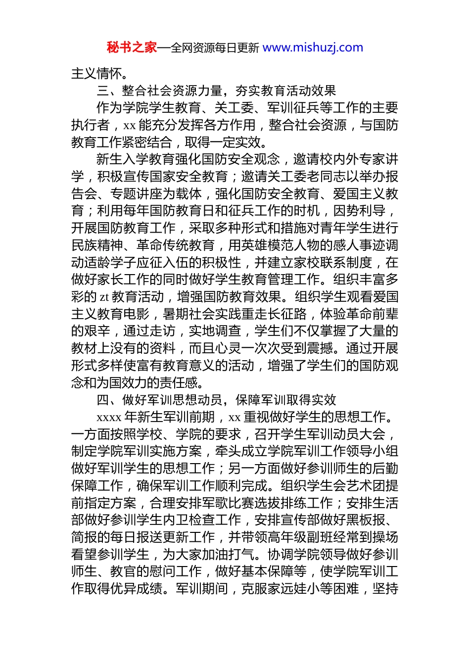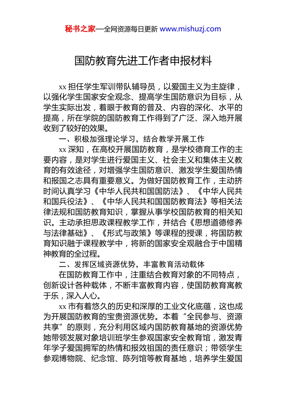 秘书之家—全网资源每日更新 www.mishuzj.com国防教育先进工作者申报材料xx 担任学生军训带队辅导员,以爱国主义为主旋律,以强化学生国家安全观念、提高学生国防意识为目标,从学生实际出发,着眼于教育的普及、内容的深化、水平的提高,所在学院的国防教育工作得到了广泛、深入地开展收到了较好的效果。一、积极加强理论学习,结合教学开展工作xx 深知,在高校开展国防教育,是学校德育工作的主要内容,是对学生进行爱国主义、社会主义和集体主义教育的有效途径,对增强学生国防意识、激发学生爱国热情和报国之志具有重要意义。为做好国防教育工作,主动挤时间认真学习《中华人民共和国国防法》、《中华人民共和国兵役法》、《中华人民共和国国防教育法》等相关法律法规和国防教育知识,掌握从事学校国防教育的相关知识。主动承担思政课程教学工作,并结合《思想道德修养与法律基础》、《形式与政策》等课程的授课,将国防教育知识融于课程教学中,将新的国家安全观融合于中国精神教育的全过程。二、发挥区域资源优势,丰富教育活动载体在国防教育工作中,注重结合教育对象的不同特点,创新设计各种载体,不断丰富教育内容,使国防教育寓教于乐,深入人心。xx 市有着悠久的历史和深厚的工业文化底蕴,这也成为开展国防教育的宝贵资源优势。本着“全民参与、资源共享”的原则,充分利用区域内国防教育基地的资源优势她带领发展对象培训班学生参观国家安全教育馆,激发青年学子爱国拥军的热情和报效祖国的责任意识;带领学生参观博物院、纪念馆、陈列馆等教育基地,培养学生爱国秘书之家—全网资源每日更新 www.mishuzj.com主义情怀。三、整合社会资源力量,夯实教育活动效果作为学院学生教育、关工委、军训征兵等工作的主要执行者,xx 能充分发挥各方作用,整合社会资源,与国防教育工作紧密结合,取得一定实效。新生入学教育强化国防安全观念,邀请校内外专家讲学,积极宣传国家安全教育;邀请关工委老同志以举办报告会、专题讲座为载体,强化国防安全教育、爱国主义教育;利用每年国防教育日和征兵工作的时机,因势利导,开展国防教育工作,采取多种形式和措施对青年学生进行民族精神、革命传统教育,用英雄模范人物的感人事迹调动适龄学子应征入伍的积极性,并建立家校联系制度,在做好家长工作的同时做好学生教育管理工作。组织丰富多彩的 zt 教育活动,增强国防教育效果。组织学生观看爱国主义教育电影,暑期社会实践重走长征路,体验革命前辈的艰辛,通过走访,实地调查,学生们不仅掌握了大量的教材上没有的资料,而且心灵一次次受到震撼。通过开展形式多样使富有教育意义的活动,增强了学生们的国防观念和为国效力的责任感。四、做好军训思想动员,保障军训取得实效xxxx 年新生军训前期,xx 重视做好学生的思想工作。一方面按照学校、学院的要求,召开学生军训动员大会,制定学院军训实施方案,牵头成立学院军训工作领导小组做好军训学生的思想工作;另一方面做好参训师生的后勤保障工作,确保军训工作顺利完成。组织学生会艺术团提前指定方案,合理安排军歌比赛选拔排练工作;安排生活部做好参训学生内卫检查工作,安排宣传部做好黑板报、简报的每日报送更新工作,并带领高年级副班经常到操场看望参训学生,为大家加油打气。协调学院领导做好参训师生、教官的慰问工作,做好基本保障等,使学院军训工作取得优异成绩。军训期间,克服家远娃小等困难,坚持秘书之家—全网资源每日更新 www.mishuzj.com每天起早贪黑到场陪训,积极与参训教官和人武部沟通,及时解决学生出现的各种问题和困难。学院在 xx 比赛中,获得“优秀”的好成绩;xx 比赛充分展示了学子的精神风貌,荣获“xx 奖”;发布军训黑板报 x 期,军训工作汇报 x期;组建 xx 人汇报方队,综合评分名列全校前茅。参训期间全院无一人掉队请假观训,圆满完成了各项任务。xx 通过扎实有效、潜移默化的教育工作,增强了学院师生的国防观念,促进了良好学风、院风的养成,为提升学校的治理水平和教育质量创造了条件。近年来,我院学生积极踊跃报名应征入伍,在征兵工作和军训工作中均取得佳绩。