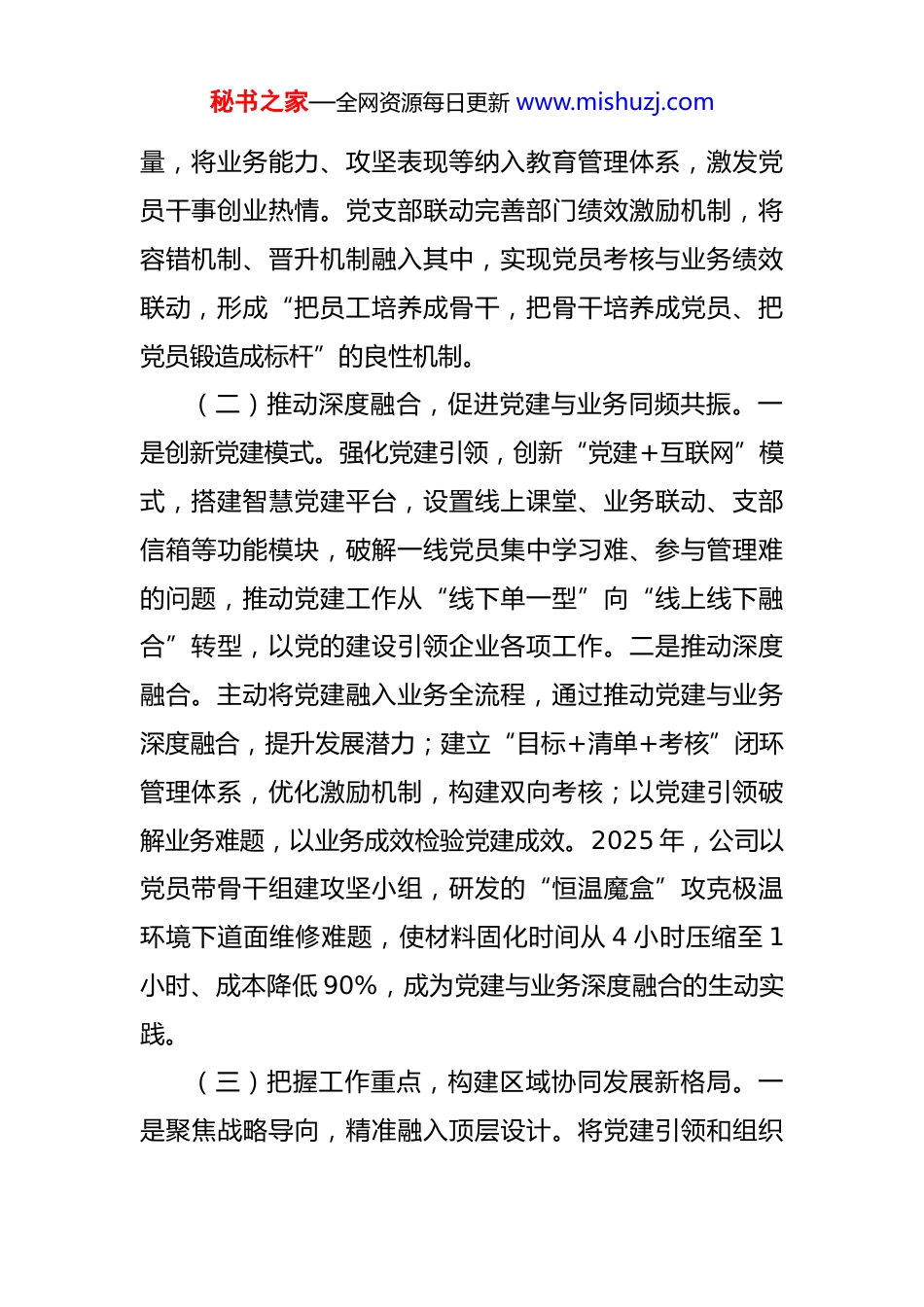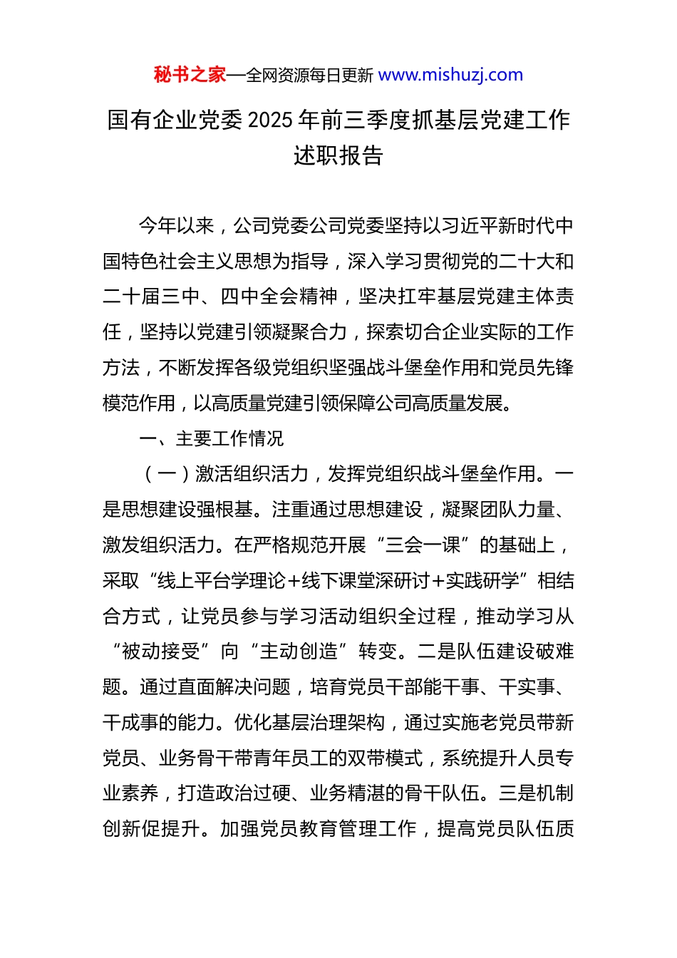 秘书之家—全网资源每日更新 www.mishuzj.com国有企业党委 2025 年前三季度抓基层党建工作述职报告 今年以来,公司党委公司党委坚持以习近平新时代中国特色社会主义思想为指导,深入学习贯彻党的二十大和二十届三中、四中全会精神,坚决扛牢基层党建主体责任,坚持以党建引领凝聚合力,探索切合企业实际的工作方法,不断发挥各级党组织坚强战斗堡垒作用和党员先锋模范作用,以高质量党建引领保障公司高质量发展。一、主要工作情况(一)激活组织活力,发挥党组织战斗堡垒作用。一是思想建设强根基。注重通过思想建设,凝聚团队力量、激发组织活力。在严格规范开展“三会一课”的基础上,采取“线上平台学理论+线下课堂深研讨+实践研学”相结合方式,让党员参与学习活动组织全过程,推动学习从“被动接受”向“主动创造”转变。二是队伍建设破难题。通过直面解决问题,培育党员干部能干事、干实事、干成事的能力。优化基层治理架构,通过实施老党员带新党员、业务骨干带青年员工的双带模式,系统提升人员专业素养,打造政治过硬、业务精湛的骨干队伍。三是机制创新促提升。加强党员教育管理工作,提高党员队伍质秘书之家—全网资源每日更新 www.mishuzj.com量,将业务能力、攻坚表现等纳入教育管理体系,激发党员干事创业热情。党支部联动完善部门绩效激励机制,将容错机制、晋升机制融入其中,实现党员考核与业务绩效联动,形成“把员工培养成骨干,把骨干培养成党员、把党员锻造成标杆”的良性机制。(二)推动深度融合,促进党建与业务同频共振。一是创新党建模式。强化党建引领,创新“党建+互联网”模式,搭建智慧党建平台,设置线上课堂、业务联动、支部信箱等功能模块,破解一线党员集中学习难、参与管理难的问题,推动党建工作从“线下单一型”向“线上线下融合”转型,以党的建设引领企业各项工作。二是推动深度融合。主动将党建融入业务全流程,通过推动党建与业务深度融合,提升发展潜力;建立“目标+清单+考核”闭环管理体系,优化激励机制,构建双向考核;以党建引领破解业务难题,以业务成效检验党建成效。2025 年,公司以党员带骨干组建攻坚小组,研发的“恒温魔盒”攻克极温环境下道面维修难题,使材料固化时间从 4 小时压缩至 1小时、成本降低 90%,成为党建与业务深度融合的生动实践。(三)把握工作重点,构建区域协同发展新格局。一是聚焦战略导向,精准融入顶层设计。将党建引领和组织秘书之家—全网资源每日更新 www.mishuzj.com目标深度关联,顶层设计分解为党建铸魂、文化聚力、队伍赋能、业务提质“四大工程”,以“清单式计划定任务、项目化管理抓落实”推动落地;压实党建责任,攻坚小组通过改造报废设备,实现资产循环利用,以党建优势保障战略实施。二是聚焦协同联动,有效打破部门壁垒。建立跨部门“党建业务融合推进会”制度,锚定共同目标、搭建协作桥梁、压实协同责任,统筹解决融合堵点。协同联动有效打破部门壁垒,以整体效能最大化应对复杂问题,最终提升公司组织运行效率与目标达成质量。三是聚焦能力提升,精心培育复合型人才。围绕组织发展需求,构建“党务+业务”双提升培养体系。公司党委建立“党建业务双讲”机制,紧紧结合业务特点开展主题鲜明的活动,培养党务干部不仅能讲党务知识,更能进项目、进现场,业务骨干不仅能干出成绩,还能分享经验,“双讲”机制为公司培育出既懂党建又精业务的复合型人才。(四)强化“四维”驱动,营造高质量发展良好氛围。一是强化党建引领,聚合力促发展。实施“价值共生计划”。以党建引领企业文化建设,确保发展行稳致远不偏航;融合党员先锋岗与优秀员工评选标准,推动党员在一线带头攻坚,形成“心往一处想、劲往一处使”的氛围。二是强化创先争优,树标杆强示范。搭建比学赶帮超秘书之家—全网资源每日更新 www.mishuzj.com平台,选树典型强化先进示范作用。精准设“赛”让争先创优有方向,设立“党员示范岗”,明确“政治觉悟高、业务技能精、服务质量优”的量化标准。服务岗设立“明星墙”,让竞赛融入日常工作;多维立“标”让示范作用见实效,“宣传+推广+联动”让标杆效应更加...