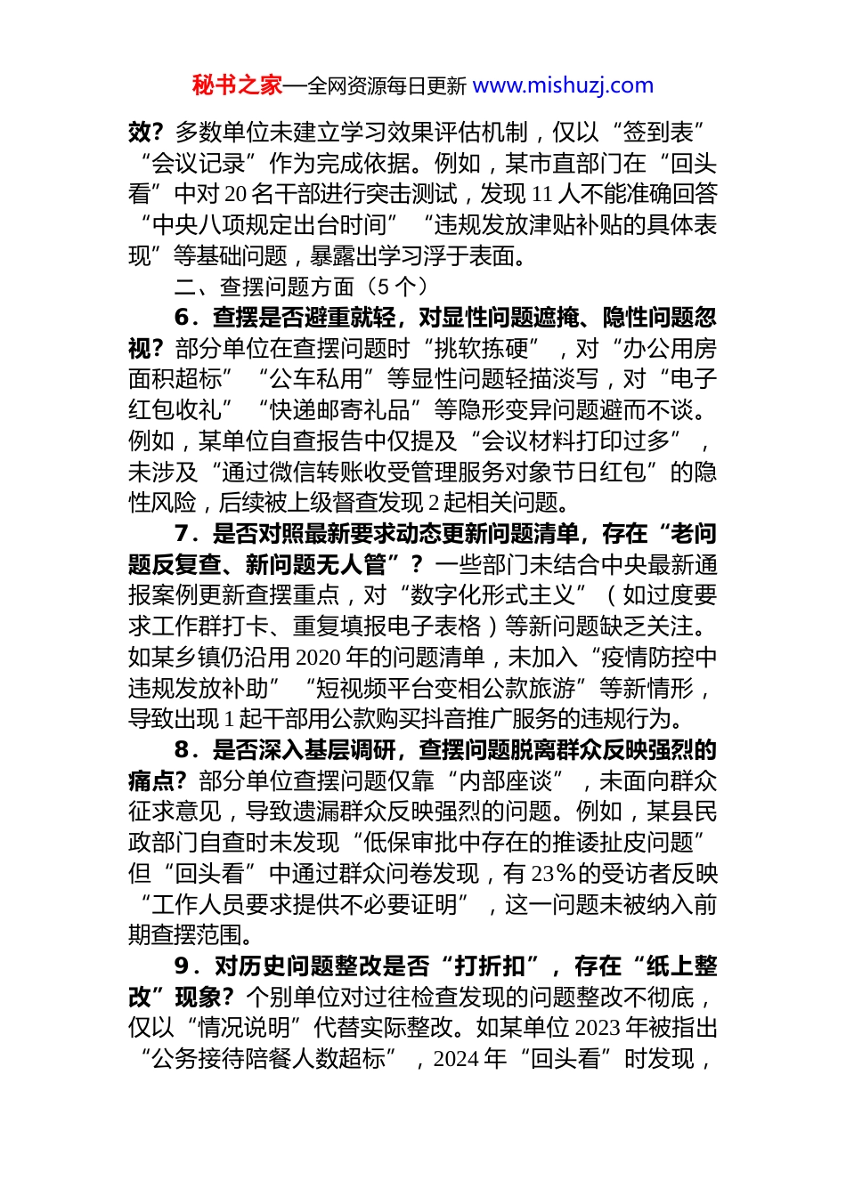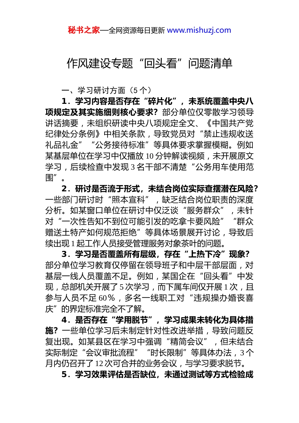 秘书之家—全网资源每日更新 www.mishuzj.com作风建设专题“回头看”问题清单一、学习研讨方面(5 个)1.学习内容是否存在“碎片化”,未系统覆盖中央八项规定及其实施细则核心要求?部分单位仅零散学习领导讲话摘要,未组织研读中央八项规定全文、《中国共产党纪律处分条例》中相关条款,导致党员对“禁止违规收送礼品礼金”“公务接待标准”等具体要求掌握模糊。例如某基层单位在学习中仅播放 10 分钟解读视频,未开展原文学习,后续检查中发现 3 名干部不清楚“公务用车使用范围”。2.研讨是否流于形式,未结合岗位实际查摆潜在风险?一些部门研讨时“照本宣科”,缺乏结合岗位职责的深度分析。如某窗口单位在研讨中仅泛谈“服务群众”,未针对“一次性告知不到位可能引发的吃拿卡要风险”“群众赠送土特产如何规范拒绝”等具体场景展开讨论,导致后续出现 1 起工作人员接受管理服务对象茶叶的问题。3.学习是否覆盖所有层级,存在“上热下冷”现象?部分单位学习教育仅停留在领导班子和中层干部层面,对基层一线人员覆盖不足。例如,某国企在“回头看”中发现,总部机关开展了 5 次学习,而下属车间仅开展 1 次,且参与人员不足 60%,多名一线职工对“违规操办婚丧喜庆”的界定标准完全不了解。4.是否存在“学用脱节”,学习成果未转化为具体措施?一些单位学习后未制定针对性改进举措,导致问题反复出现。如某县区在学习中强调“精简会议”,但未结合实际制定“会议审批流程”“时长限制”等具体办法,3 个月内仍召开了 12 次可合并的业务会议,与学习要求脱节。5.学习效果评估是否缺位,未通过测试等方式检验成秘书之家—全网资源每日更新 www.mishuzj.com效?多数单位未建立学习效果评估机制,仅以“签到表”“会议记录”作为完成依据。例如,某市直部门在“回头看”中对 20 名干部进行突击测试,发现 11 人不能准确回答“中央八项规定出台时间”“违规发放津贴补贴的具体表现”等基础问题,暴露出学习浮于表面。二、查摆问题方面(5 个)6.查摆是否避重就轻,对显性问题遮掩、隐性问题忽视?部分单位在查摆问题时“挑软拣硬”,对“办公用房面积超标”“公车私用”等显性问题轻描淡写,对“电子红包收礼”“快递邮寄礼品”等隐形变异问题避而不谈。例如,某单位自查报告中仅提及“会议材料打印过多”,未涉及“通过微信转账收受管理服务对象节日红包”的隐性风险,后续被上级督查发现 2 起相关问题。7.是否对照最新要求动态更新问题清单,存在“老问题反复查、新问题无人管”?一些部门未结合中央最新通报案例更新查摆重点,对“数字化形式主义”(如过度要求工作群打卡、重复填报电子表格)等新问题缺乏关注。如某乡镇仍沿用 2020 年的问题清单,未加入“疫情防控中违规发放补助”“短视频平台变相公款旅游”等新情形,导致出现 1 起干部用公款购买抖音推广服务的违规行为。8.是否深入基层调研,查摆问题脱离群众反映强烈的痛点?部分单位查摆问题仅靠“内部座谈”,未面向群众征求意见,导致遗漏群众反映强烈的问题。例如,某县民政部门自查时未发现“低保审批中存在的推诿扯皮问题”但“回头看”中通过群众问卷发现,有 23%的受访者反映“工作人员要求提供不必要证明”,这一问题未被纳入前期查摆范围。9.对历史问题整改是否“打折扣”,存在“纸上整改”现象?个别单位对过往检查发现的问题整改不彻底,仅以“情况说明”代替实际整改。如某单位 2023 年被指出“公务接待陪餐人数超标”,2024 年“回头看”时发现,秘书之家—全网资源每日更新 www.mishuzj.com该单位仅修订了制度,但未对相关责任人进行教育提醒,且 2024 年 1-5 月仍有 3 次陪餐人数超标的记录。10.是否存在“选择性查摆”,对“关键少数”监督缺位?一些部门查摆问题时侧重普通干部,对领导干部特别是“一把手”的监督存在盲区。例如,某局在自查中仅指出科员“加班餐超标”,未查摆局长“违规使用单位车辆回家探亲”“在私人会所接待客商”等问题,直到上级巡察时才被发现。三、组织领导方面(5 个)11.“第一责任人”是否切实履责,存在“甩...