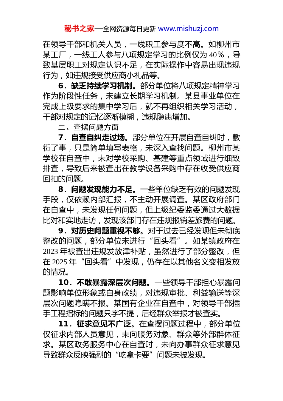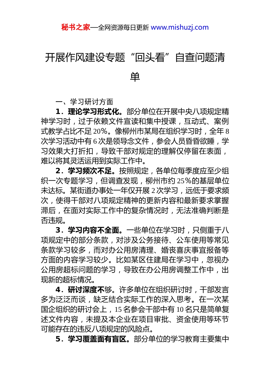 秘书之家—全网资源每日更新 www.mishuzj.com开展作风建设专题“回头看”自查问题清单一、学习研讨方面1.理论学习形式化。部分单位在开展中央八项规定精神学习时,过于依赖文件宣读和集中授课,互动式、案例式教学占比不足 20%。像柳州市某局在组织学习时,全年 8次学习活动中有 6 次是领导念文件,参会人员昏昏欲睡,学习效果大打折扣,导致干部对规定的理解仅停留在表面,难以将其灵活运用到实际工作中。2.学习频次不足。按照规定,各单位每季度应至少组织一次专题学习,但调查发现,柳州市约 25%的基层单位未达标。某街道办事处一年仅开展 2 次学习,远低于要求频次,使得干部对八项规定精神的更新内容和最新要求掌握滞后,在面对实际工作中的复杂情况时,无法准确判断是否违规。3.学习内容不全面。一些单位在学习时,只侧重于八项规定中的部分条款,对涉及公务接待、公车使用等常见条款学习较多,而对办公用房清理、婚丧喜庆事宜报备等方面的内容学习较少。比如某区住建局在学习中,忽视办公用房超标问题的学习,导致在办公用房调整工作中,出现新的超标情况。4.研讨深度不够。许多单位在组织研讨时,干部发言多为泛泛而谈,缺乏结合实际工作的深入思考。在一次某国企组织的研讨会上,15 名参会干部中有 10 名只是简单复述文件内容,未提及本企业在项目审批、资金使用等环节可能存在的违反八项规定的风险点。5.学习覆盖面有盲区。部分单位的学习教育主要集中秘书之家—全网资源每日更新 www.mishuzj.com在领导干部和机关人员,一线职工参与度不高。如柳州市某工厂,一线工人参与八项规定学习的比例仅为 40%,导致基层职工对规定认识不足,在实际操作中容易出现违规行为,如违规接受供应商小礼品等。6.缺乏持续学习机制。部分单位将八项规定精神学习作为阶段性任务,未建立长期学习机制。某县事业单位在完成上级要求的集中学习后,就不再组织相关学习活动,干部对规定的记忆逐渐模糊,违规隐患增加。二、查摆问题方面7.自查自纠走过场。部分单位在开展自查自纠时,敷衍了事,只是简单填写表格,未深入查找问题。柳州市某学校在自查中,未对学校采购、基建等重点领域进行细致排查,导致后来被查出在教学设备采购中存在收受供应商回扣的问题。8.问题发现能力不足。一些单位缺乏有效的问题发现手段,仅依赖内部汇报,不主动开展调查。某区政府部门在自查中,未发现任何问题,但上级纪委监委通过大数据比对和实地走访,发现该部门存在违规报销差旅费的问题。9.对历史问题重视不够。对于过去已经发现但未彻底整改的问题,部分单位未进行“回头看”。如某镇政府在2023 年被查出违规发放津补贴,虽然进行了部分整改,但在 2025 年“回头看”中发现,仍存在以其他名义变相发放的情况。10.不敢暴露深层次问题。一些领导干部担心暴露问题影响单位形象或自身政绩,对违规审批、利益输送等深层次问题隐瞒不报。某国有企业在自查中,对领导干部插手工程招标的问题只字不提,后经群众举报才被查实。11.征求意见不广泛。在查摆问题过程中,部分单位仅征求内部人员意见,未向服务对象、群众等外部群体征求。某区政务服务中心在自查时,未向办事群众征求意见导致群众反映强烈的“吃拿卡要”问题未被发现。秘书之家—全网资源每日更新 www.mishuzj.com12.问题分析不透彻。对于查摆出的问题,一些单位只分析表面原因,未深挖背后的制度漏洞和思想根源。某单位在发现公务接待超标问题后,仅认为是工作人员疏忽未反思接待审批制度的缺陷。三、集中整治方面13.整改措施缺乏针对性。部分单位针对查摆出的问题,制定的整改措施笼统、模糊,缺乏可操作性。某单位在发现公车私用问题后,仅提出“加强公车管理”的整改措施,未明确具体的管理办法和处罚机制,导致问题未得到有效解决。14.整改落实进度缓慢。一些单位在整改过程中,拖延现象严重,未按照规定的时间节点完成整改任务。某区住建局在被要求整改办公用房超标问题后,半年过去了仍未完成整改,影响了整体工作进度。15.整治效果不明显。部分单位虽然开展了集中整治,但违规问题仍时有发生。如某县在整治违规吃...