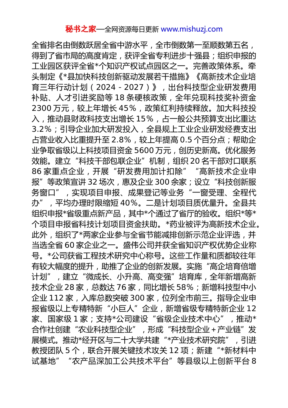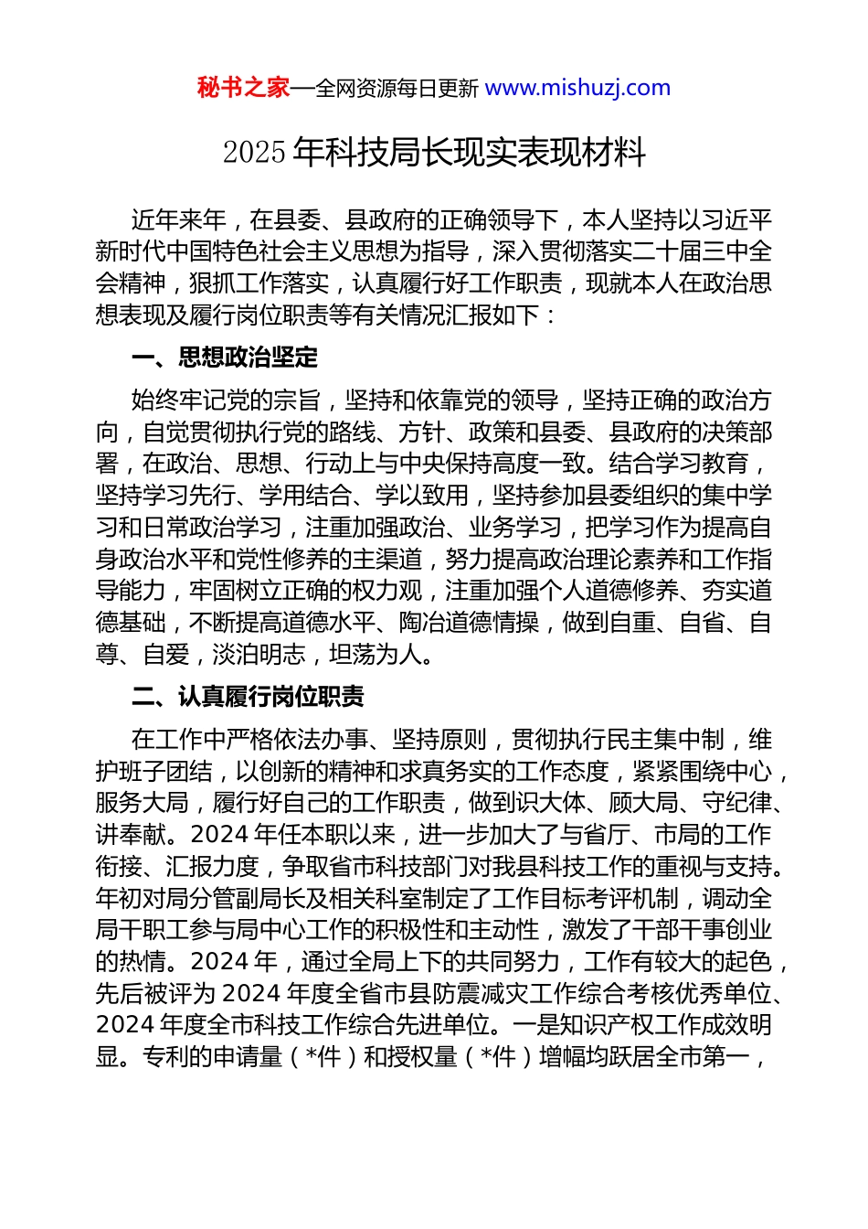 秘书之家—全网资源每日更新 www.mishuzj.com2025 年科技局长现实表现材料近年来年,在县委、县政府的正确领导下,本人坚持以习近平新时代中国特色社会主义思想为指导,深入贯彻落实二十届三中全会精神,狠抓工作落实,认真履行好工作职责,现就本人在政治思想表现及履行岗位职责等有关情况汇报如下:一、思想政治坚定始终牢记党的宗旨,坚持和依靠党的领导,坚持正确的政治方向,自觉贯彻执行党的路线、方针、政策和县委、县政府的决策部署,在政治、思想、行动上与中央保持高度一致。结合学习教育,坚持学习先行、学用结合、学以致用,坚持参加县委组织的集中学习和日常政治学习,注重加强政治、业务学习,把学习作为提高自身政治水平和党性修养的主渠道,努力提高政治理论素养和工作指导能力,牢固树立正确的权力观,注重加强个人道德修养、夯实道德基础,不断提高道德水平、陶冶道德情操,做到自重、自省、自尊、自爱,淡泊明志,坦荡为人。二、认真履行岗位职责在工作中严格依法办事、坚持原则,贯彻执行民主集中制,维护班子团结,以创新的精神和求真务实的工作态度,紧紧围绕中心,服务大局,履行好自己的工作职责,做到识大体、顾大局、守纪律、讲奉献。2024 年任本职以来,进一步加大了与省厅、市局的工作衔接、汇报力度,争取省市科技部门对我县科技工作的重视与支持。年初对局分管副局长及相关科室制定了工作目标考评机制,调动全局干职工参与局中心工作的积极性和主动性,激发了干部干事创业的热情。2024 年,通过全局上下的共同努力,工作有较大的起色,先后被评为 2024 年度全省市县防震减灾工作综合考核优秀单位、2024 年度全市科技工作综合先进单位。一是知识产权工作成效明显。专利的申请量(*件)和授权量(*件)增幅均跃居全市第一,秘书之家—全网资源每日更新 www.mishuzj.com全省排名由倒数跃居全省中游水平,全市倒数第一至顺数第五名,得到了省市局的高度肯定,获评全省专利进步十强县;组织申报的工业园区获评全省*个知识产权试点园区之一。完善政策体系。牵头制定《*县加快科技创新驱动发展若干措施》《高新技术企业培育三年行动计划(2024-2027)》,出台科技型企业研发费用补贴、人才引进奖励等 18 条硬核政策,全年兑现科技奖补资金2300 万元,较上年增长 45%,政策红利持续释放。加大科技投入,推动县财政科技支出增长 15%,占一般公共预算支出比重达3.2%;引导企业加大研发投入,全县规上工业企业研发经费支出占营业收入比重提升至 2.8%,较上年提高 0.5 个百分点;帮助企业争取省级以上科技项目资金 5600 万元,创历史新高。优化服务效能。建立“科技干部包联企业”机制,组织 20 名干部对口联系86 家重点企业,开展“研发费用加计扣除”“高新技术企业申报”等政策宣讲 32 场次,惠及企业 300 余家;设立“科技创新服务窗口”,实现项目申报、成果登记等业务“一窗受理、全程代办”,平均办理时限缩短 40%。二是计划项目质优量升。全县共组织申报*省级重点新产品,其中*个通过了省厅的验收。组织*等*个项目申报省科技计划项目资金扶助。*药业被评为高新技术企业。此外,组织了*两家企业参与全省节能减排创新示范企业评选,并当选全省 60 家企业之一。盛伟公司并获全省知识产权优势企业称号。*公司获省工程技术研究中心称号。这些工作量和质都较往年有较大幅度的提升,助推了企业的创新发展。实施“高企培育倍增计划”,建立“微成长、小升高、高变强”培育库,全年新增高新技术企业 28 家,总数达 76 家,同比增长 58%;新增科技型中小企业 112 家,入库总数突破 300 家,位列全市前三。指导企业申报省级以上专精特新“小巨人”企业,新增省级专精特新企业 12家、国家级 1 家;支持*公司建设“省级企业技术中心”,推动*合作社创建“农业科技型企业”,形成“科技型企业+产业链”发展模式。推动*经开区与二十大学共建“*产业技术研究院”,引进教授团队 5 个,联合开展关键技术攻关 12 项;新建“*新材料中试基地”“农产品深加工公共技术平台”等县级以上创新平台 8秘书之家—全网资源每...