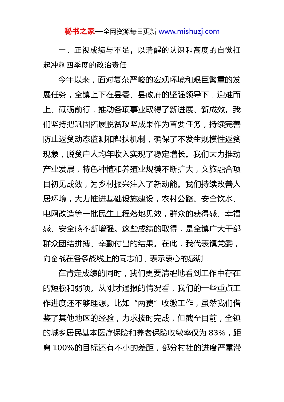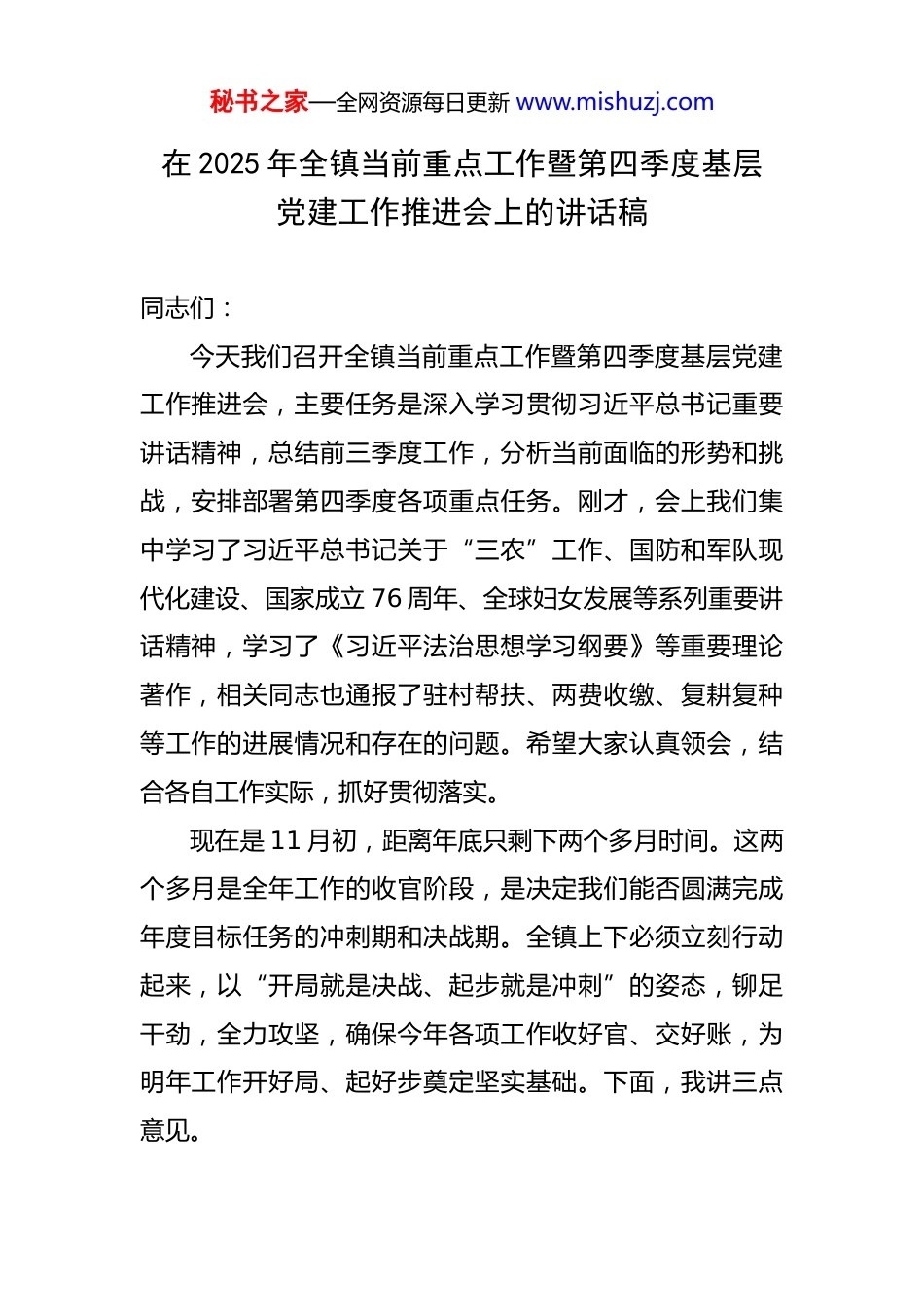 秘书之家—全网资源每日更新 www.mishuzj.com在 2025 年全镇当前重点工作暨第四季度基层党建工作推进会上的讲话稿 同志们:今天我们召开全镇当前重点工作暨第四季度基层党建工作推进会,主要任务是深入学习贯彻习近平总书记重要讲话精神,总结前三季度工作,分析当前面临的形势和挑战,安排部署第四季度各项重点任务。刚才,会上我们集中学习了习近平总书记关于“三农”工作、国防和军队现代化建设、国家成立 76 周年、全球妇女发展等系列重要讲话精神,学习了《习近平法治思想学习纲要》等重要理论著作,相关同志也通报了驻村帮扶、两费收缴、复耕复种等工作的进展情况和存在的问题。希望大家认真领会,结合各自工作实际,抓好贯彻落实。现在是 11 月初,距离年底只剩下两个多月时间。这两个多月是全年工作的收官阶段,是决定我们能否圆满完成年度目标任务的冲刺期和决战期。全镇上下必须立刻行动起来,以“开局就是决战、起步就是冲刺”的姿态,铆足干劲,全力攻坚,确保今年各项工作收好官、交好账,为明年工作开好局、起好步奠定坚实基础。下面,我讲三点意见。秘书之家—全网资源每日更新 www.mishuzj.com一、正视成绩与不足,以清醒的认识和高度的自觉扛起冲刺四季度的政治责任今年以来,面对复杂严峻的宏观环境和艰巨繁重的发展任务,全镇上下在县委、县政府的坚强领导下,迎难而上、砥砺前行,推动各项事业取得了新进展、新成效。我们坚持把巩固拓展脱贫攻坚成果作为首要任务,持续完善防止返贫动态监测和帮扶机制,确保了不发生规模性返贫现象,脱贫户人均年收入实现了稳定增长。我们大力推动产业发展,特色种植和养殖业规模不断扩大,文旅融合项目初见成效,为乡村振兴注入了新动能。我们持续改善人居环境,大力推进基础设施建设,农村公路、安全饮水、电网改造等一批民生工程落地见效,群众的获得感、幸福感、安全感不断增强。这些成绩的取得,是全镇广大干部群众团结拼搏、辛勤付出的结果。在此,我代表镇党委,向奋战在各条战线上的同志们,表示衷心的感谢!在肯定成绩的同时,我们更要清醒地看到工作中存在的短板和弱项。从刚才通报的情况看,我们的一些重点工作进度还不够理想。比如“两费”收缴工作,虽然我们借鉴了其他地区的经验,力求按时完成,但截至目前,全镇的城乡居民基本医疗保险和养老保险收缴率仅为 83%,距离 100%的目标还有不小的差距,部分村社的进度严重滞秘书之家—全网资源每日更新 www.mishuzj.com后。又比如复耕复种工作,虽然我们认识到这是保障粮食安全的“国之大者”,也出台了一些激励措施,但全镇尚有约 300 亩撂荒地未完成复耕,部分已复耕地块的种管水平不高,后续稳产增收压力很大。再比如地质灾害避险搬迁工作,这项工作直接关系到群众的生命财产安全,但目前仍有少数群众思想不通、顾虑重重,搬迁协议签订和旧房拆除工作进展缓慢。此外,在驻村帮扶督查中也发现了一些问题,个别驻村干部工作作风不实、帮扶措施不精准;在群众身边腐败和作风问题专项整治中,也暴露出个别村干部纪律意识淡薄,存在优亲厚友、虚报冒领等问题。这些问题,既有客观因素的影响,但更多的是我们主观努力不够,是一些干部思想上松了劲、行动上慢了拍、责任上缺了位。问题是时代的声音,也是我们工作的导向。全镇上下必须进一步提高政治站位,深刻认识到第四季度工作的极端重要性和紧迫性。要深刻理解,我们今天推进的每一项工作,无论是“两费”收缴、避险搬迁,还是复耕复种,都不是孤立的事务性工作,而是关系群众切身利益、关系粮食安全底线、关系社会大局稳定的政治任务。我们推动巩固拓展脱贫攻坚成果、谋划产业项目、建强项目库,是实现乡村全面振兴、促进共同富裕的关键支撑。我们狠抓的安全生产、森林防火、环境整治,是必须秘书之家—全网资源每日更新 www.mishuzj.com牢牢守住的发展底线和生命红线。我们加强的党建、党风廉政、意识形态、统战保密等工作,是为我们所有事业航船行稳致远提供方向指引和坚强保障的“压舱石”。全镇各级党组织和广大党员干部必须胸怀“国之大者”,心系“镇之大计”,自觉把思想和行动统一到县委、县...