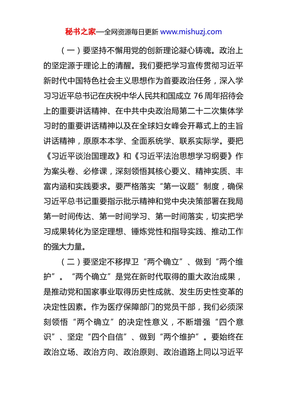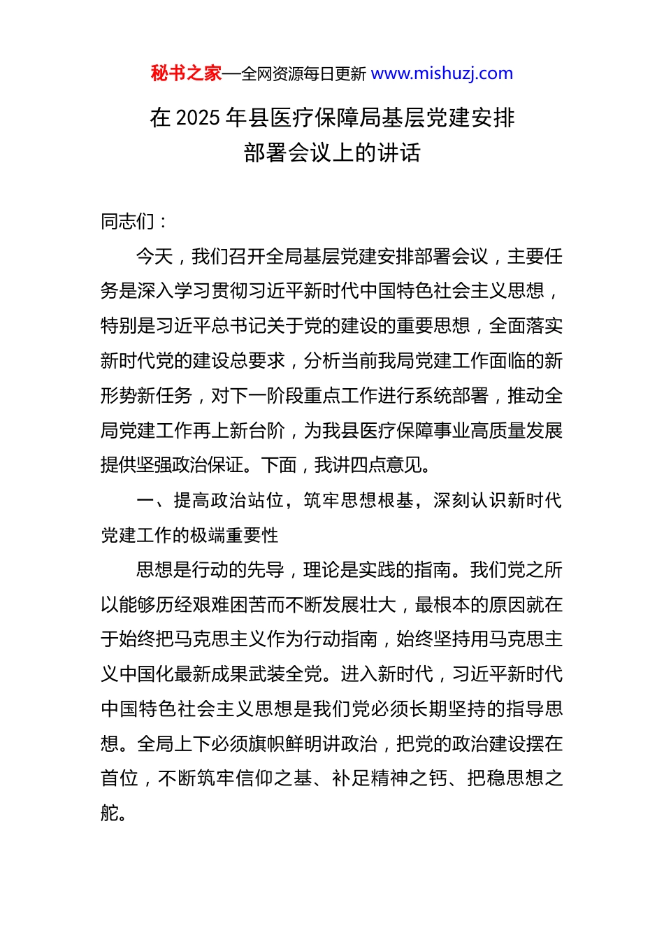秘书之家—全网资源每日更新 www.mishuzj.com在 2025 年县医疗保障局基层党建安排部署会议上的讲话 同志们:今天,我们召开全局基层党建安排部署会议,主要任务是深入学习贯彻习近平新时代中国特色社会主义思想,特别是习近平总书记关于党的建设的重要思想,全面落实新时代党的建设总要求,分析当前我局党建工作面临的新形势新任务,对下一阶段重点工作进行系统部署,推动全局党建工作再上新台阶,为我县医疗保障事业高质量发展提供坚强政治保证。下面,我讲四点意见。一、提高政治站位,筑牢思想根基,深刻认识新时代党建工作的极端重要性思想是行动的先导,理论是实践的指南。我们党之所以能够历经艰难困苦而不断发展壮大,最根本的原因就在于始终把马克思主义作为行动指南,始终坚持用马克思主义中国化最新成果武装全党。进入新时代,习近平新时代中国特色社会主义思想是我们党必须长期坚持的指导思想。全局上下必须旗帜鲜明讲政治,把党的政治建设摆在首位,不断筑牢信仰之基、补足精神之钙、把稳思想之舵。秘书之家—全网资源每日更新 www.mishuzj.com(一)要坚持不懈用党的创新理论凝心铸魂。政治上的坚定源于理论上的清醒。我们要把学习宣传贯彻习近平新时代中国特色社会主义思想作为首要政治任务,深入学习习近平总书记在庆祝中华人民共和国成立 76 周年招待会上的重要讲话精神、在中共中央政治局第二十二次集体学习时的重要讲话精神以及在全球妇女峰会开幕式上的主旨讲话精神,原原本本学、全面系统学、联系实际学。要把《习近平谈治国理政》和《习近平法治思想学习纲要》作为案头卷、必修课,深刻领悟其核心要义、精神实质、丰富内涵和实践要求。要严格落实“第一议题”制度,确保习近平总书记重要指示批示精神和党中央决策部署在我局第一时间传达、第一时间学习、第一时间落实,切实把学习成果转化为坚定理想、锤炼党性和指导实践、推动工作的强大力量。(二)要坚定不移捍卫“两个确立”、做到“两个维护”。“两个确立”是党在新时代取得的重大政治成果,是推动党和国家事业取得历史性成就、发生历史性变革的决定性因素。作为医疗保障部门的党员干部,我们必须深刻领悟“两个确立”的决定性意义,不断增强“四个意识”、坚定“四个自信”、做到“两个维护”。要始终在政治立场、政治方向、政治原则、政治道路上同以习近平秘书之家—全网资源每日更新 www.mishuzj.com同志为核心的党中央保持高度一致,不断提高政治判断力、政治领悟力、政治执行力。要自觉将医保工作融入党和国家事业发展大局,确保党的路线方针政策在医保领域不折不扣得到贯彻执行。(三)要持之以恒严肃党内政治生活。党内政治生活是锻炼党性、提高思想觉悟的熔炉。我们要严格执行《关于新形势下党内政治生活的若干准则》,认真落实“三会一课”、组织生活会、民主评议党员、谈心谈话等制度,让党员干部在严格的党内政治生活中反复淬炼,不断增强党性修养。要高质量开展主题党日活动,结合医保工作实际,创新活动形式,丰富活动内容,让主题党日成为党员学习教育的阵地、思想交流的平台、党性锻炼的熔炉。要发展积极健康的党内政治文化,大力弘扬忠诚老实、公道正派、实事求是、清正廉洁等价值观,营造风清气正的良好政治生态。二、聚焦组织建设,夯实战斗堡垒,以高质量党建引领医保事业创新发展基层党组织是党的全部工作和战斗力的基础。只有把基层党组织建设得坚强有力,党的执政基础才能坚如磐石。我们要树立大抓基层的鲜明导向,以提升组织力为重点,突出政治功能,推动基层党组织全面进步、全面过秘书之家—全网资源每日更新 www.mishuzj.com硬。(一)要着力建强支部战斗堡垒。党支部是党组织开展工作的基本单元。要以创建“五星党支部”为抓手,持续推进党支部标准化规范化建设,选优配强支部书记和支部委员,打造一支政治强、业务精、作风硬的党务工作者队伍。要充分发挥党支部战斗堡垒作用和党员先锋模范作用,在医保支付方式改革、基金监管、经办服务等重点工作中,设立“党员先锋岗”、组建“党员突击队”,让党旗在医保一线高高飘扬。要加强对党员的教育、管理、监督和服务,...