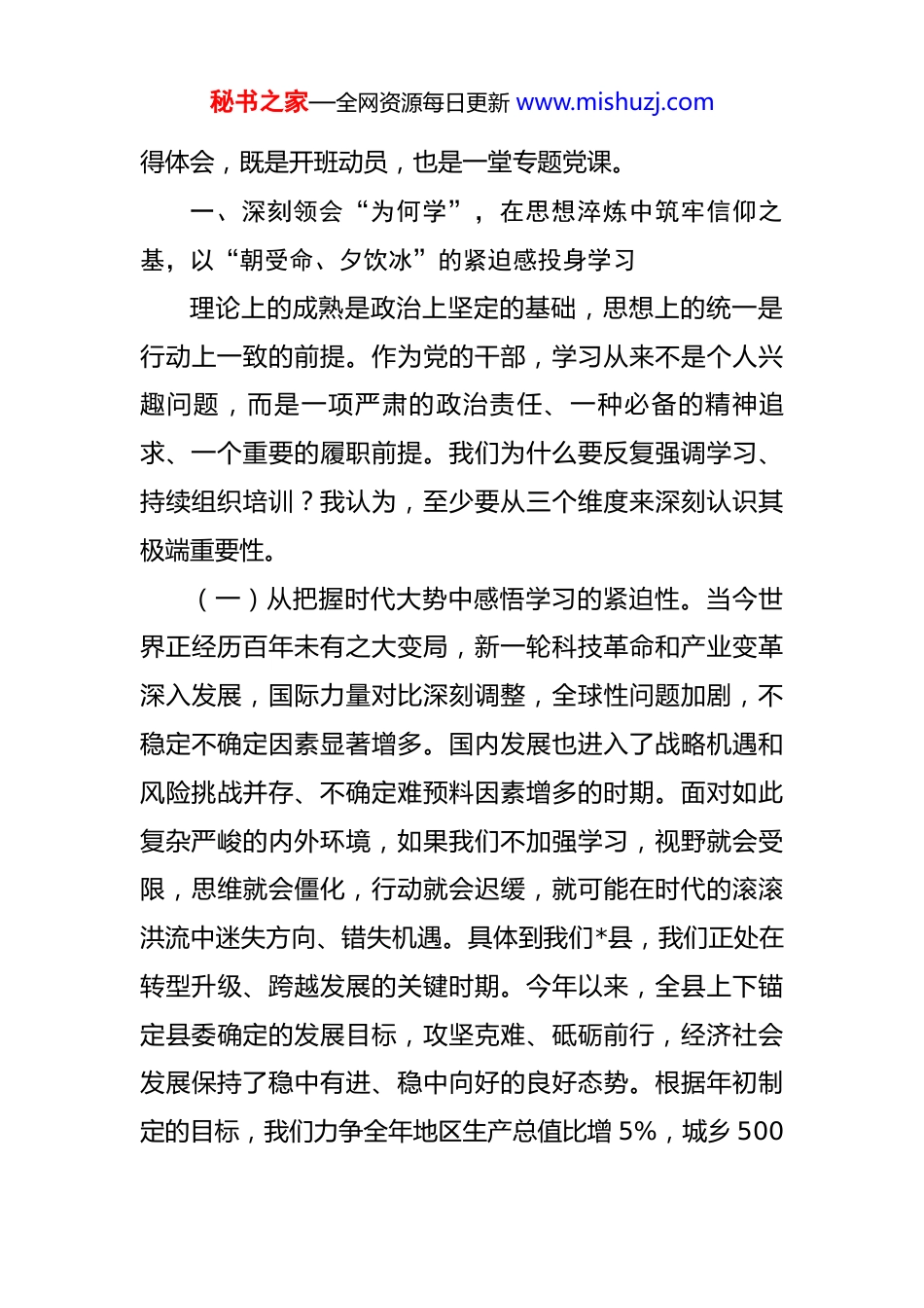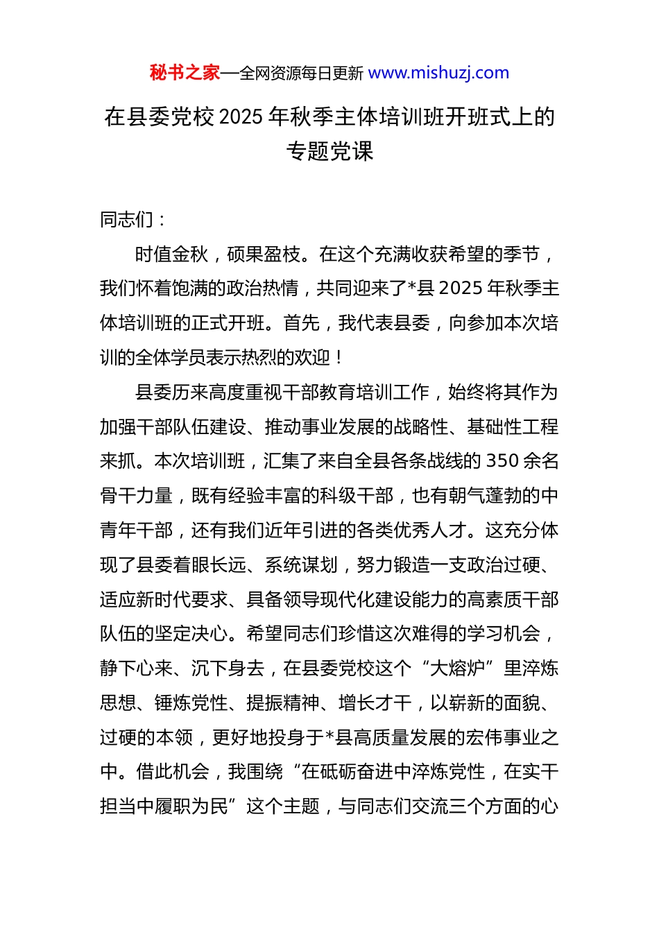 秘书之家—全网资源每日更新 www.mishuzj.com在县委党校 2025 年秋季主体培训班开班式上的专题党课 同志们:时值金秋,硕果盈枝。在这个充满收获希望的季节,我们怀着饱满的政治热情,共同迎来了*县 2025 年秋季主体培训班的正式开班。首先,我代表县委,向参加本次培训的全体学员表示热烈的欢迎!县委历来高度重视干部教育培训工作,始终将其作为加强干部队伍建设、推动事业发展的战略性、基础性工程来抓。本次培训班,汇集了来自全县各条战线的 350 余名骨干力量,既有经验丰富的科级干部,也有朝气蓬勃的中青年干部,还有我们近年引进的各类优秀人才。这充分体现了县委着眼长远、系统谋划,努力锻造一支政治过硬、适应新时代要求、具备领导现代化建设能力的高素质干部队伍的坚定决心。希望同志们珍惜这次难得的学习机会,静下心来、沉下身去,在县委党校这个“大熔炉”里淬炼思想、锤炼党性、提振精神、增长才干,以崭新的面貌、过硬的本领,更好地投身于*县高质量发展的宏伟事业之中。借此机会,我围绕“在砥砺奋进中淬炼党性,在实干担当中履职为民”这个主题,与同志们交流三个方面的心秘书之家—全网资源每日更新 www.mishuzj.com得体会,既是开班动员,也是一堂专题党课。一、深刻领会“为何学”,在思想淬炼中筑牢信仰之基,以“朝受命、夕饮冰”的紧迫感投身学习理论上的成熟是政治上坚定的基础,思想上的统一是行动上一致的前提。作为党的干部,学习从来不是个人兴趣问题,而是一项严肃的政治责任、一种必备的精神追求、一个重要的履职前提。我们为什么要反复强调学习、持续组织培训?我认为,至少要从三个维度来深刻认识其极端重要性。(一)从把握时代大势中感悟学习的紧迫性。当今世界正经历百年未有之大变局,新一轮科技革命和产业变革深入发展,国际力量对比深刻调整,全球性问题加剧,不稳定不确定因素显著增多。国内发展也进入了战略机遇和风险挑战并存、不确定难预料因素增多的时期。面对如此复杂严峻的内外环境,如果我们不加强学习,视野就会受限,思维就会僵化,行动就会迟缓,就可能在时代的滚滚洪流中迷失方向、错失机遇。具体到我们*县,我们正处在转型升级、跨越发展的关键时期。今年以来,全县上下锚定县委确定的发展目标,攻坚克难、砥砺前行,经济社会发展保持了稳中有进、稳中向好的良好态势。根据年初制定的目标,我们力争全年地区生产总值比增 5%,城乡 500秘书之家—全网资源每日更新 www.mishuzj.com万元以上固定资产投资比增 4.5%,规模以上工业增加值比增 6.5%,农村居民人均可支配收入比增 6.5%。这些指标不是轻轻松松、敲锣打鼓就能实现的,背后是艰巨的付出和不懈的努力。要实现这些目标,推动*县在新一轮区域竞争中抢占先机、赢得主动,我们必须通过学习,准确把握宏观政策走向,深刻理解新发展理念的内涵,精准洞察产业变革的趋势,真正做到与时代同行、与改革同步。不学习,我们就会成为新时代的“门外汉”,面对新形势新任务,只会感到“本领恐慌”,陷入“心有余而力不足”的窘境。(二)从履行岗位职责中认识学习的重要性。在座的各位同志,都是全县各项事业的中坚力量,肩负着推动一方发展、服务一方百姓的重要职责。岗位就是责任,履职必须尽责。我们面对的工作对象、工作内容、工作要求都在发生深刻变化。群众的民主意识、权利意识、法治意识不断增强,对我们的工作提出了更高要求;经济社会发展中新产业、新业态、新模式层出不穷,对我们的专业素养和知识结构发起了新的挑战;社会治理的复杂性、艰巨性日益凸显,对我们防范化解风险、维护安全稳定的能力提出了更严峻的考验。试问,如果我们对中央的大政方针一知半解,对省市的决策部署囫囵吞枣,对县里的中心工作秘书之家—全网资源每日更新 www.mishuzj.com心中无数,如何能创造性地开展工作?如果我们不懂产业经济,不悉项目流程,面对客商的提问支支吾吾,如何能扛起招商引资、项目建设的重任?如果我们不了解“三农”政策,不熟悉群众工作方法,面对群众的诉求敷衍了事,如何能担起乡村振兴、服务群众的使命?因此,学习是提升我们履职能力的最直接、最有效...