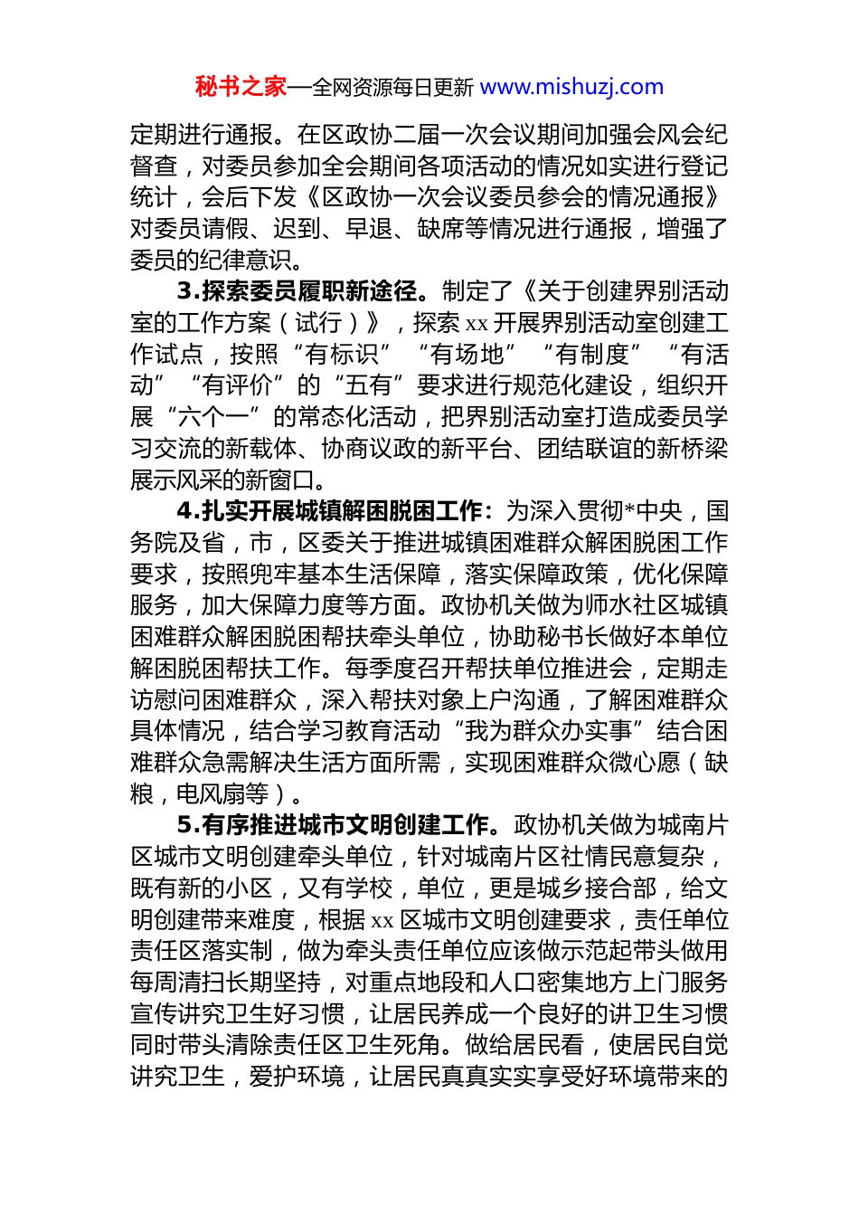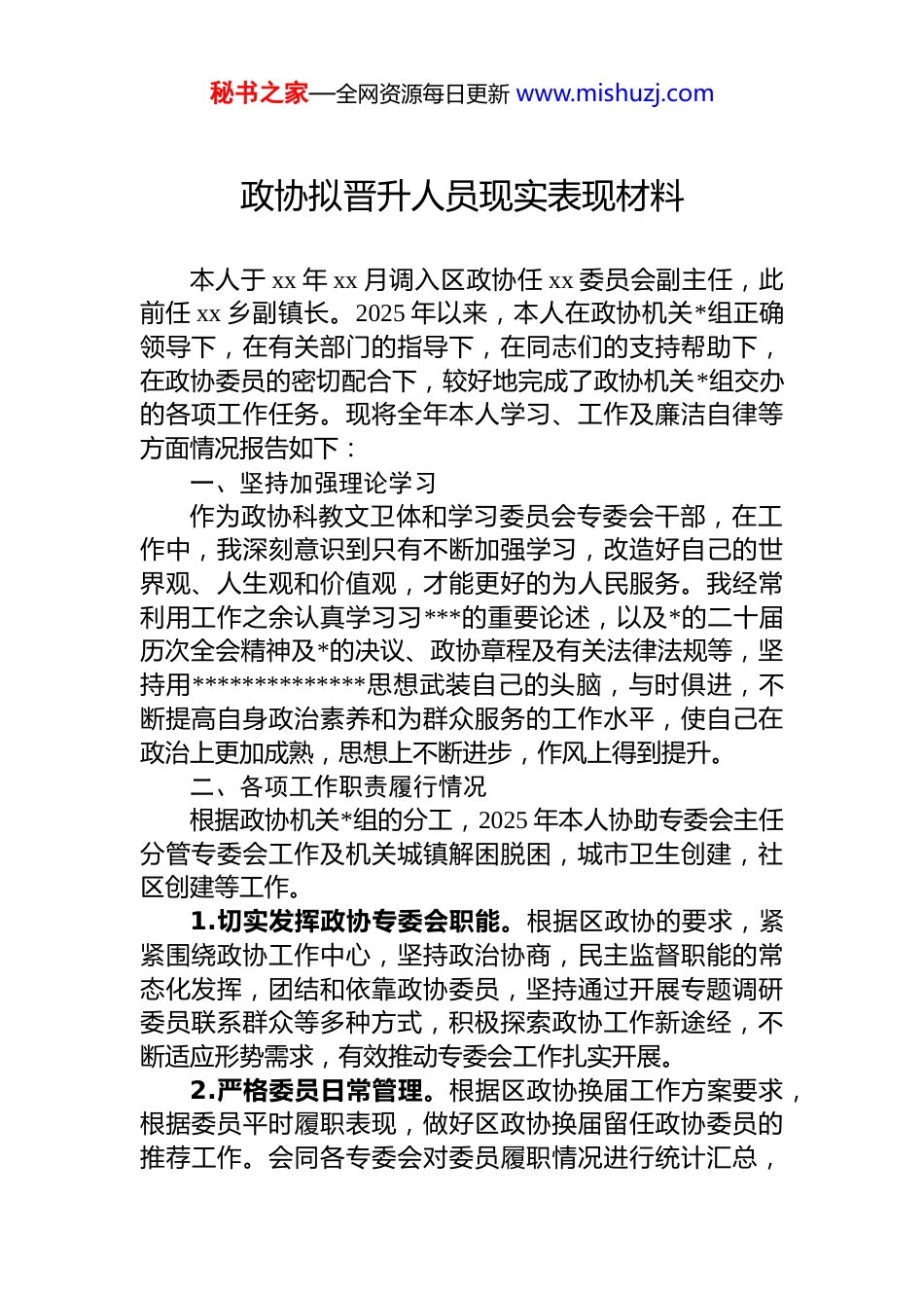 秘书之家—全网资源每日更新 www.mishuzj.com政协拟晋升人员现实表现材料本人于 xx 年 xx 月调入区政协任 xx 委员会副主任,此前任 xx 乡副镇长。2025 年以来,本人在政协机关*组正确领导下,在有关部门的指导下,在同志们的支持帮助下,在政协委员的密切配合下,较好地完成了政协机关*组交办的各项工作任务。现将全年本人学习、工作及廉洁自律等方面情况报告如下:一、坚持加强理论学习作为政协科教文卫体和学习委员会专委会干部,在工作中,我深刻意识到只有不断加强学习,改造好自己的世界观、人生观和价值观,才能更好的为人民服务。我经常利用工作之余认真学习习***的重要论述,以及*的二十届历次全会精神及*的决议、政协章程及有关法律法规等,坚持用**************思想武装自己的头脑,与时俱进,不断提高自身政治素养和为群众服务的工作水平,使自己在政治上更加成熟,思想上不断进步,作风上得到提升。二、各项工作职责履行情况根据政协机关*组的分工,2025 年本人协助专委会主任分管专委会工作及机关城镇解困脱困,城市卫生创建,社区创建等工作。1.切实发挥政协专委会职能。根据区政协的要求,紧紧围绕政协工作中心,坚持政治协商,民主监督职能的常态化发挥,团结和依靠政协委员,坚持通过开展专题调研委员联系群众等多种方式,积极探索政协工作新途经,不断适应形势需求,有效推动专委会工作扎实开展。2.严格委员日常管理。根据区政协换届工作方案要求,根据委员平时履职表现,做好区政协换届留任政协委员的推荐工作。会同各专委会对委员履职情况进行统计汇总,秘书之家—全网资源每日更新 www.mishuzj.com定期进行通报。在区政协二届一次会议期间加强会风会纪督查,对委员参加全会期间各项活动的情况如实进行登记统计,会后下发《区政协一次会议委员参会的情况通报》对委员请假、迟到、早退、缺席等情况进行通报,增强了委员的纪律意识。3.探索委员履职新途径。制定了《关于创建界别活动室的工作方案(试行)》,探索 xx 开展界别活动室创建工作试点,按照“有标识”“有场地”“有制度”“有活动”“有评价”的“五有”要求进行规范化建设,组织开展“六个一”的常态化活动,把界别活动室打造成委员学习交流的新载体、协商议政的新平台、团结联谊的新桥梁展示风采的新窗口。4.扎实开展城镇解困脱困工作:为深入贯彻*中央,国务院及省,市,区委关于推进城镇困难群众解困脱困工作要求,按照兜牢基本生活保障,落实保障政策,优化保障服务,加大保障力度等方面。政协机关做为师水社区城镇困难群众解困脱困帮扶牵头单位,协助秘书长做好本单位解困脱困帮扶工作。每季度召开帮扶单位推进会,定期走访慰问困难群众,深入帮扶对象上户沟通,了解困难群众具体情况,结合学习教育活动“我为群众办实事”结合困难群众急需解决生活方面所需,实现困难群众微心愿(缺粮,电风扇等)。5.有序推进城市文明创建工作。政协机关做为城南片区城市文明创建牵头单位,针对城南片区社情民意复杂,既有新的小区,又有学校,单位,更是城乡接合部,给文明创建带来难度,根据 xx 区城市文明创建要求,责任单位责任区落实制,做为牵头责任单位应该做示范起带头做用每周清扫长期坚持,对重点地段和人口密集地方上门服务宣传讲究卫生好习惯,让居民养成一个良好的讲卫生习惯同时带头清除责任区卫生死角。做给居民看,使居民自觉讲究卫生,爱护环境,让居民真真实实享受好环境带来的秘书之家—全网资源每日更新 www.mishuzj.com生活舒畅。同时不定期召开片区成员单位工作推进和调度会,调度且推进各成员单位责任区环境卫生整治工作,使城南片区城市文明创建工作健康有序推进。6.尽力尽责做好其他工作。在抓好分管工作的同时,我坚持以一个*员的标准要求自己,个人服从组织,下级服从上级,面对工作勇担重任,在分管工作之外,较好地完成政协机关分配及领导交办工作。作为 xx 区特约监督员工作专班成员,本人先后推荐了多位政治素质好、业务水平高政协委员,参与区政法委、区公安局、检察院、法院等单位的听证会和座谈会。积极支持这些委员切实履行监督员职责,深入体察社情...