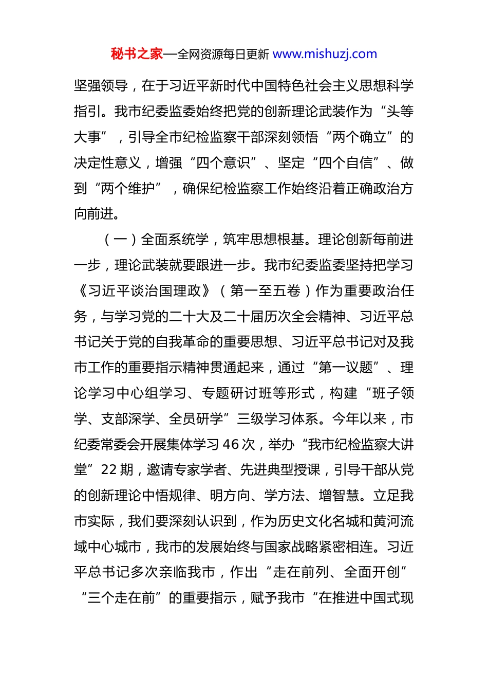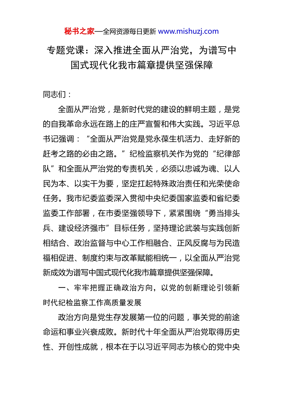 秘书之家—全网资源每日更新 www.mishuzj.com专题党课:深入推进全面从严治党,为谱写中国式现代化我市篇章提供坚强保障 同志们:全面从严治党,是新时代党的建设的鲜明主题,是党的自我革命永远在路上的庄严宣誓和伟大实践。习近平总书记强调:“全面从严治党是党永葆生机活力、走好新的赶考之路的必由之路。”纪检监察机关作为党的“纪律部队”和全面从严治党的专责机关,必须以忠诚为魂、以人民为本、以实干为要,坚定扛起特殊政治责任和光荣使命任务。我市纪委监委深入贯彻中央纪委国家监委和省纪委监委工作部署,在市委坚强领导下,紧紧围绕“勇当排头兵、建设经济强市”目标任务,坚持理论武装与实践创新相结合、政治监督与中心工作相融合、正风反腐与为民造福相促进、制度约束与改革赋能相统一,以全面从严治党新成效为谱写中国式现代化我市篇章提供坚强保障。一、牢牢把握正确政治方向,以党的创新理论引领新时代纪检监察工作高质量发展政治方向是党生存发展第一位的问题,事关党的前途命运和事业兴衰成败。新时代十年全面从严治党取得历史性、开创性成就,根本在于以习近平同志为核心的党中央秘书之家—全网资源每日更新 www.mishuzj.com坚强领导,在于习近平新时代中国特色社会主义思想科学指引。我市纪委监委始终把党的创新理论武装作为“头等大事”,引导全市纪检监察干部深刻领悟“两个确立”的决定性意义,增强“四个意识”、坚定“四个自信”、做到“两个维护”,确保纪检监察工作始终沿着正确政治方向前进。(一)全面系统学,筑牢思想根基。理论创新每前进一步,理论武装就要跟进一步。我市纪委监委坚持把学习《习近平谈治国理政》(第一至五卷)作为重要政治任务,与学习党的二十大及二十届历次全会精神、习近平总书记关于党的自我革命的重要思想、习近平总书记对及我市工作的重要指示精神贯通起来,通过“第一议题”、理论学习中心组学习、专题研讨班等形式,构建“班子领学、支部深学、全员研学”三级学习体系。今年以来,市纪委常委会开展集体学习 46 次,举办“我市纪检监察大讲堂”22 期,邀请专家学者、先进典型授课,引导干部从党的创新理论中悟规律、明方向、学方法、增智慧。立足我市实际,我们要深刻认识到,作为历史文化名城和黄河流域中心城市,我市的发展始终与国家战略紧密相连。习近平总书记多次亲临我市,作出“走在前列、全面开创”“三个走在前”的重要指示,赋予我市“在推进中国式现秘书之家—全网资源每日更新 www.mishuzj.com代化中走在前”的重大使命。纪检监察机关必须从党的创新理论中找准服务保障经济强市建设的“坐标系”和“方法论”,主动融入黄河流域生态保护和高质量发展、新旧动能转换、自贸试验区建设等国家战略,确保党中央决策部署在我市落地生根。(二)聚焦职能学,深化自我革命。习近平总书记关于党的自我革命的重要思想,是马克思主义党建理论的重大创新,是新时代全面从严治党的根本遵循。我市纪委监委以“学思想、强党性、重实践、建新功”为总要求,深入开展党纪学习教育和中央八项规定精神学习教育,引导干部深刻把握“六个如何始终”的重大命题,聚焦“监督保障执行、促进完善发展”职能定位,推动各级党组织和党员干部严于律己、严负其责、严管所辖。结合我市“红色基因”资源,组织纪检监察干部赴莱芜战役纪念馆、中共早期历史纪念馆开展“循迹溯源学思想促践行”活动,从革命先辈“水乳交融、生死与共”的奋斗历程中感悟初心使命;围绕“如何始终统一思想、统一意志、统一行动”,建立“政治监督清单”,将习近平总书记对我市“勇当排头兵、建设经济强市”的嘱托细化为 12 个方面45 项监督重点,确保全市上下拧成一股绳、心往一处想、劲往一处使。秘书之家—全网资源每日更新 www.mishuzj.com(三)贯通实践学,提升履职能力。理论的价值在于指导实践。我市纪委监委坚持学用结合、知行合一,把学习成效转化为解决问题、推动工作的实际能力。聚焦黄河流域生态保护和高质量发展战略,建立“黄河流域生态保护专项监督机制”,针对黄河滩区迁建、小清河治理、湿地保护等重点项目开展“嵌入式”监督,推动...