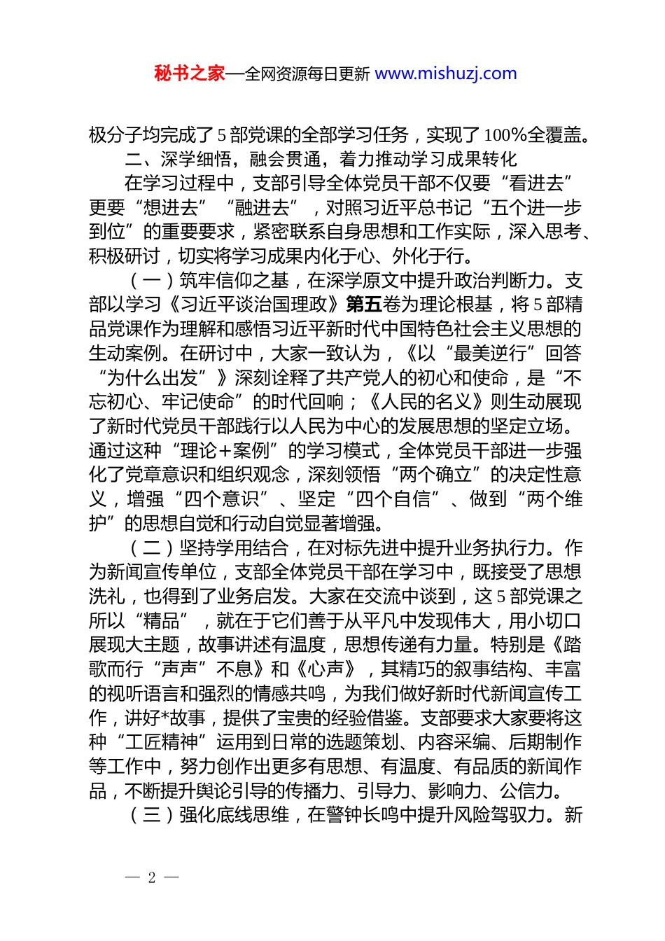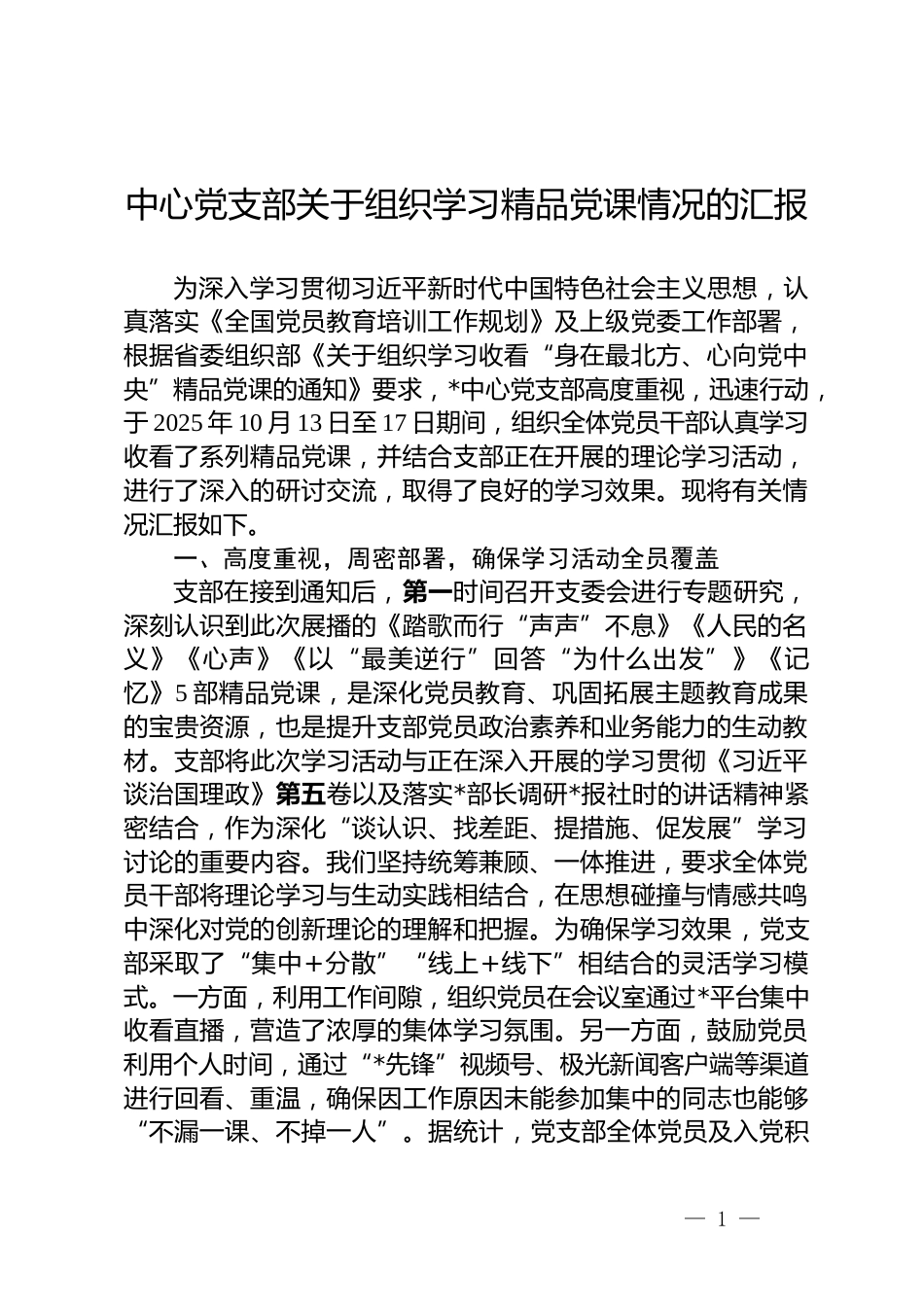 中心党支部关于组织学习精品党课情况的汇报为深入学习贯彻习近平新时代中国特色社会主义思想,认真落实《全国党员教育培训工作规划》及上级党委工作部署,根据省委组织部《关于组织学习收看“身在最北方、心向党中央”精品党课的通知》要求,*中心党支部高度重视,迅速行动,于 2025 年 10 月 13 日至 17 日期间,组织全体党员干部认真学习收看了系列精品党课,并结合支部正在开展的理论学习活动,进行了深入的研讨交流,取得了良好的学习效果。现将有关情况汇报如下。一、高度重视,周密部署,确保学习活动全员覆盖支部在接到通知后,第一时间召开支委会进行专题研究,深刻认识到此次展播的《踏歌而行“声声”不息》《人民的名义》《心声》《以“最美逆行”回答“为什么出发”》《记忆》5 部精品党课,是深化党员教育、巩固拓展主题教育成果的宝贵资源,也是提升支部党员政治素养和业务能力的生动教材。支部将此次学习活动与正在深入开展的学习贯彻《习近平谈治国理政》第五卷以及落实*部长调研*报社时的讲话精神紧密结合,作为深化“谈认识、找差距、提措施、促发展”学习讨论的重要内容。我们坚持统筹兼顾、一体推进,要求全体党员干部将理论学习与生动实践相结合,在思想碰撞与情感共鸣中深化对党的创新理论的理解和把握。为确保学习效果,党支部采取了“集中+分散”“线上+线下”相结合的灵活学习模式。一方面,利用工作间隙,组织党员在会议室通过*平台集中收看直播,营造了浓厚的集体学习氛围。另一方面,鼓励党员利用个人时间,通过“*先锋”视频号、极光新闻客户端等渠道进行回看、重温,确保因工作原因未能参加集中的同志也能够“不漏一课、不掉一人”。据统计,党支部全体党员及入党积— 1 —秘书之家—全网资源每日更新 www.mishuzj.com极分子均完成了 5 部党课的全部学习任务,实现了 100%全覆盖。二、深学细悟,融会贯通,着力推动学习成果转化在学习过程中,支部引导全体党员干部不仅要“看进去”更要“想进去”“融进去”,对照习近平总书记“五个进一步到位”的重要要求,紧密联系自身思想和工作实际,深入思考、积极研讨,切实将学习成果内化于心、外化于行。(一)筑牢信仰之基,在深学原文中提升政治判断力。支部以学习《习近平谈治国理政》第五卷为理论根基,将 5 部精品党课作为理解和感悟习近平新时代中国特色社会主义思想的生动案例。在研讨中,大家一致认为,《以“最美逆行”回答“为什么出发”》深刻诠释了共产党人的初心和使命,是“不忘初心、牢记使命”的时代回响;《人民的名义》则生动展现了新时代党员干部践行以人民为中心的发展思想的坚定立场。通过这种“理论+案例”的学习模式,全体党员干部进一步强化了党章意识和组织观念,深刻领悟“两个确立”的决定性意义,增强“四个意识”、坚定“四个自信”、做到“两个维护”的思想自觉和行动自觉显著增强。(二)坚持学用结合,在对标先进中提升业务执行力。作为新闻宣传单位,支部全体党员干部在学习中,既接受了思想洗礼,也得到了业务启发。大家在交流中谈到,这 5 部党课之所以“精品”,就在于它们善于从平凡中发现伟大,用小切口展现大主题,故事讲述有温度,思想传递有力量。特别是《踏歌而行“声声”不息》和《心声》,其精巧的叙事结构、丰富的视听语言和强烈的情感共鸣,为我们做好新时代新闻宣传工作,讲好*故事,提供了宝贵的经验借鉴。支部要求大家要将这种“工匠精神”运用到日常的选题策划、内容采编、后期制作等工作中,努力创作出更多有思想、有温度、有品质的新闻作品,不断提升舆论引导的传播力、引导力、影响力、公信力。(三)强化底线思维,在警钟长鸣中提升风险驾驭力。新— 2 —闻舆论工作处在意识形态斗争的最前沿,具有鲜明的政治属性。精品党课《记忆》通过回顾党的奋斗历程,使大家再次深刻认识到意识形态工作的极端重要性。支部以此为契机,重温了意识形态工作责任制的相关要求,并结合当前新媒体领域传播速度快、影响范围广、舆情风险高的特点,组织党员干部进行风险点排查。大家表示,要始终绷紧意识形态安全这根弦,严格落实“三审三校”制度...