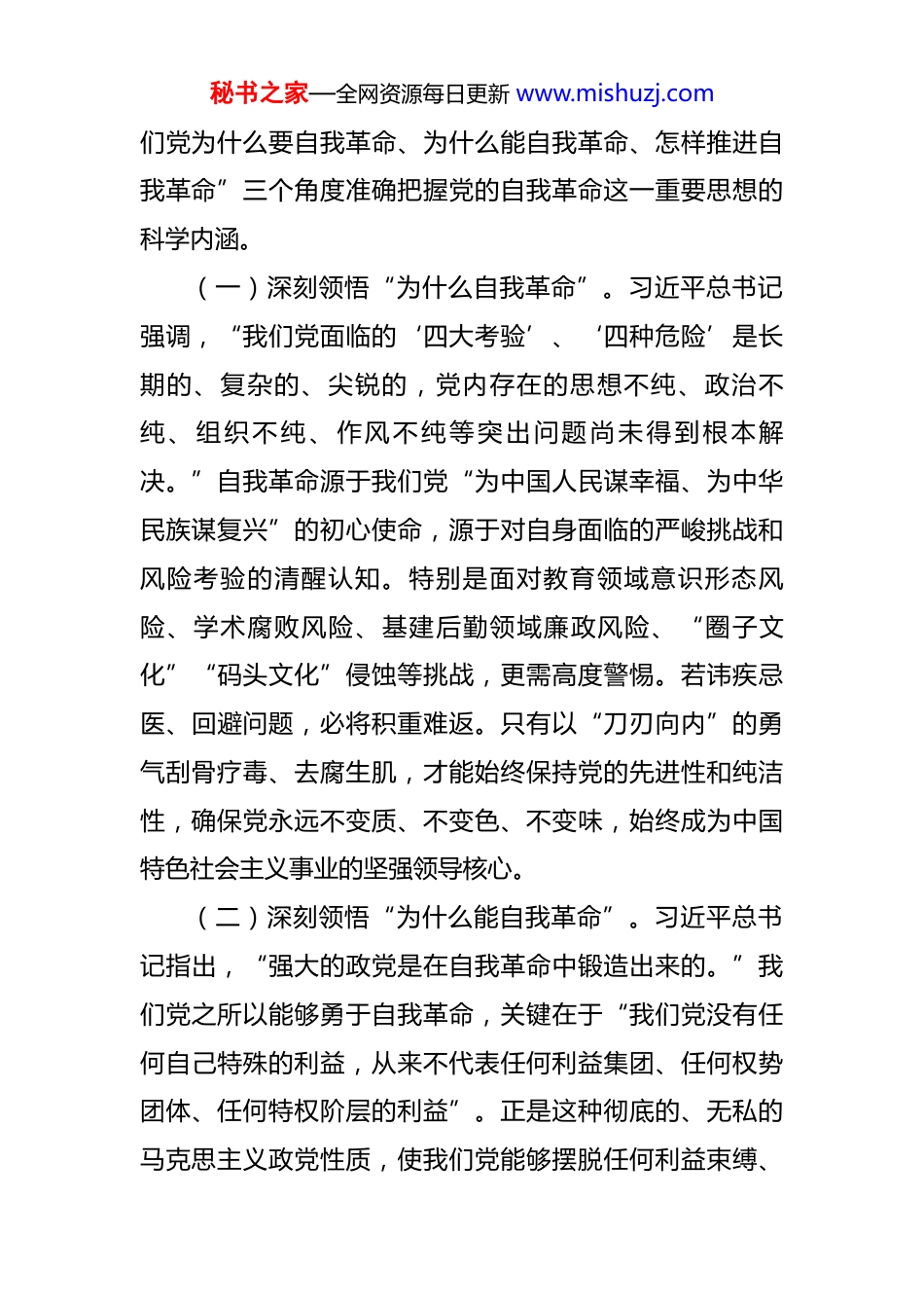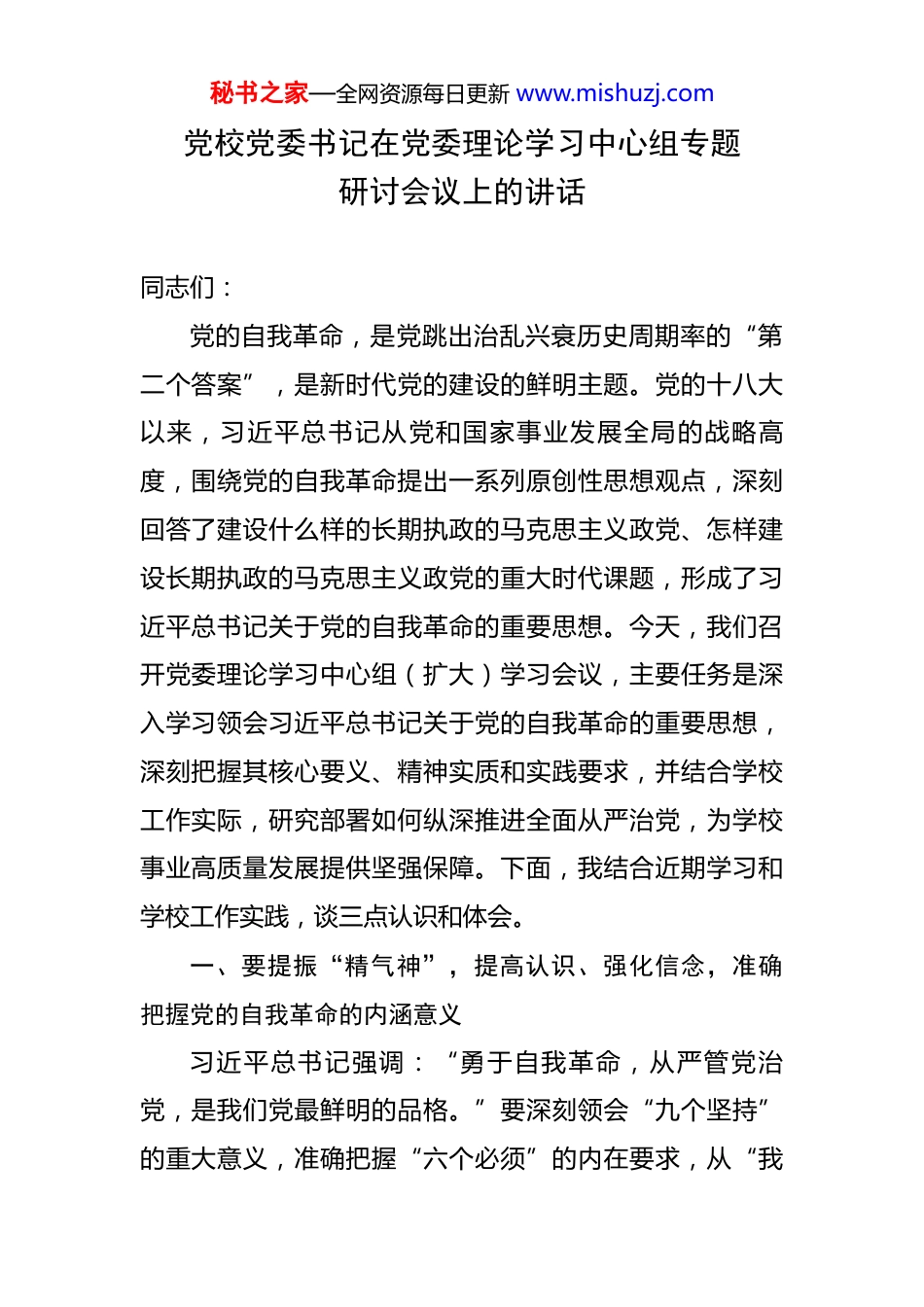 秘书之家—全网资源每日更新 www.mishuzj.com党校党委书记在党委理论学习中心组专题研讨会议上的讲话 同志们:党的自我革命,是党跳出治乱兴衰历史周期率的“第二个答案”,是新时代党的建设的鲜明主题。党的十八大以来,习近平总书记从党和国家事业发展全局的战略高度,围绕党的自我革命提出一系列原创性思想观点,深刻回答了建设什么样的长期执政的马克思主义政党、怎样建设长期执政的马克思主义政党的重大时代课题,形成了习近平总书记关于党的自我革命的重要思想。今天,我们召开党委理论学习中心组(扩大)学习会议,主要任务是深入学习领会习近平总书记关于党的自我革命的重要思想,深刻把握其核心要义、精神实质和实践要求,并结合学校工作实际,研究部署如何纵深推进全面从严治党,为学校事业高质量发展提供坚强保障。下面,我结合近期学习和学校工作实践,谈三点认识和体会。一、要提振“精气神”,提高认识、强化信念,准确把握党的自我革命的内涵意义习近平总书记强调:“勇于自我革命,从严管党治党,是我们党最鲜明的品格。”要深刻领会“九个坚持”的重大意义,准确把握“六个必须”的内在要求,从“我秘书之家—全网资源每日更新 www.mishuzj.com们党为什么要自我革命、为什么能自我革命、怎样推进自我革命”三个角度准确把握党的自我革命这一重要思想的科学内涵。(一)深刻领悟“为什么自我革命”。习近平总书记强调,“我们党面临的‘四大考验’、‘四种危险’是长期的、复杂的、尖锐的,党内存在的思想不纯、政治不纯、组织不纯、作风不纯等突出问题尚未得到根本解决。”自我革命源于我们党“为中国人民谋幸福、为中华民族谋复兴”的初心使命,源于对自身面临的严峻挑战和风险考验的清醒认知。特别是面对教育领域意识形态风险、学术腐败风险、基建后勤领域廉政风险、“圈子文化”“码头文化”侵蚀等挑战,更需高度警惕。若讳疾忌医、回避问题,必将积重难返。只有以“刀刃向内”的勇气刮骨疗毒、去腐生肌,才能始终保持党的先进性和纯洁性,确保党永远不变质、不变色、不变味,始终成为中国特色社会主义事业的坚强领导核心。(二)深刻领悟“为什么能自我革命”。习近平总书记指出,“强大的政党是在自我革命中锻造出来的。”我们党之所以能够勇于自我革命,关键在于“我们党没有任何自己特殊的利益,从来不代表任何利益集团、任何权势团体、任何特权阶层的利益”。正是这种彻底的、无私的马克思主义政党性质,使我们党能够摆脱任何利益束缚、秘书之家—全网资源每日更新 www.mishuzj.com任何派系掣肘,具有自我净化、自我完善、自我革新、自我提高的强大内在动力和勇气。回顾党的百年征程,从八七会议到遵义会议,从延安整风到拨乱反正,再到新时代全面从严治党取得历史性、开创性成就,无不印证了我们党依靠自身力量发现并解决自身问题的超凡能力。这是我们党最大的政治优势,也是我们坚定推进自我革命的根本自信所在。(三)深刻领悟“怎样推进自我革命”。党的十八大以来,我们党在推进党的自我革命实践中,积累了丰富的经验,形成了关于党的自我革命的战略思想。习近平总书记将其系统概括为“九个坚持”,即坚持党中央集中统一领导、坚持党要管党、全面从严治党、坚持以党的政治建设为统领、坚持严的主基调不动摇、坚持发扬钉钉子精神加强作风建设、坚持以零容忍态度惩治腐败、坚持纠正一切损害群众利益的腐败和不正之风、坚持抓住“关键少数”以上率下、坚持完善党和国家监督制度。同时,要深刻理解“六个必须”的内在要求,即必须以党的政治建设为统领,坚守自我革命根本政治方向;必须把思想建设作为党的基础性建设,淬炼自我革命锐利思想武器;必须坚决落实中央八项规定精神、以严明纪律整饬作风,丰富自我革命有效途径;必须坚持以雷霆之势反腐惩恶,打好自我革命攻坚战、持久战;必须坚持增强党组织政治功能和秘书之家—全网资源每日更新 www.mishuzj.com组织力凝聚力,锻造敢于斗争、勇于自我革命的干部队伍;必须坚持构建自我净化、自我完善、自我革新、自我提高的制度规范体系,为推进伟大自我革命提供制度保障。这“九个坚持”和“六个必须...