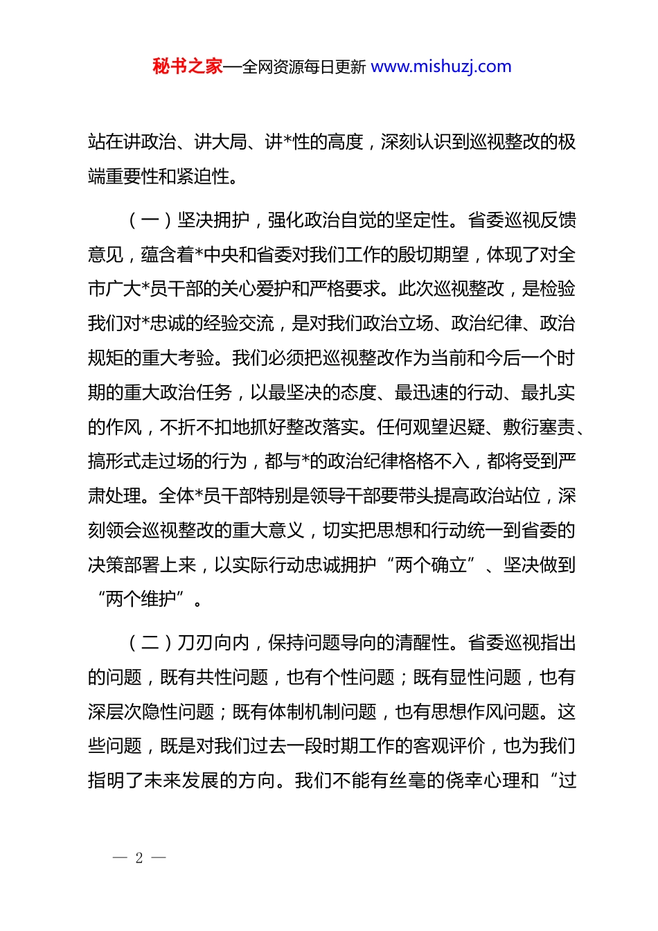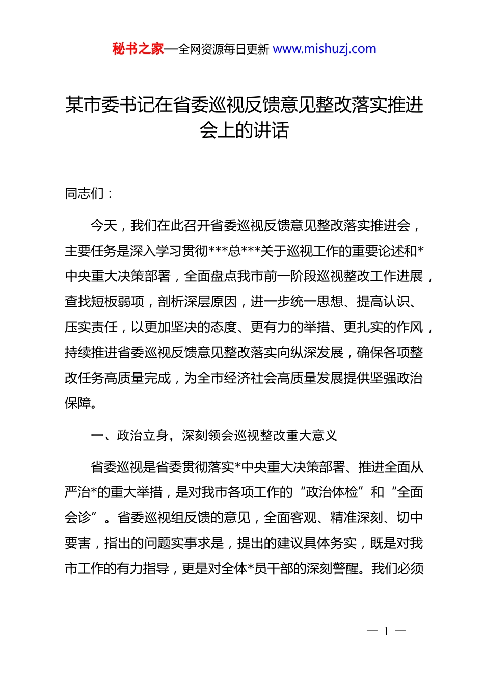 秘书之家—全网资源每日更新 www.mishuzj.com某市委书记在省委巡视反馈意见整改落实推进会上的讲话同志们:今天,我们在此召开省委巡视反馈意见整改落实推进会,主要任务是深入学习贯彻***总***关于巡视工作的重要论述和*中央重大决策部署,全面盘点我市前一阶段巡视整改工作进展,查找短板弱项,剖析深层原因,进一步统一思想、提高认识、压实责任,以更加坚决的态度、更有力的举措、更扎实的作风,持续推进省委巡视反馈意见整改落实向纵深发展,确保各项整改任务高质量完成,为全市经济社会高质量发展提供坚强政治保障。一、政治立身,深刻领会巡视整改重大意义省委巡视是省委贯彻落实*中央重大决策部署、推进全面从严治*的重大举措,是对我市各项工作的“政治体检”和“全面会诊”。省委巡视组反馈的意见,全面客观、精准深刻、切中要害,指出的问题实事求是,提出的建议具体务实,既是对我市工作的有力指导,更是对全体*员干部的深刻警醒。我们必须— 1 —秘书之家—全网资源每日更新 www.mishuzj.com站在讲政治、讲大局、讲*性的高度,深刻认识到巡视整改的极端重要性和紧迫性。(一)坚决拥护,强化政治自觉的坚定性。省委巡视反馈意见,蕴含着*中央和省委对我们工作的殷切期望,体现了对全市广大*员干部的关心爱护和严格要求。此次巡视整改,是检验我们对*忠诚的经验交流,是对我们政治立场、政治纪律、政治规矩的重大考验。我们必须把巡视整改作为当前和今后一个时期的重大政治任务,以最坚决的态度、最迅速的行动、最扎实的作风,不折不扣地抓好整改落实。任何观望迟疑、敷衍塞责、搞形式走过场的行为,都与*的政治纪律格格不入,都将受到严肃处理。全体*员干部特别是领导干部要带头提高政治站位,深刻领会巡视整改的重大意义,切实把思想和行动统一到省委的决策部署上来,以实际行动忠诚拥护“两个确立”、坚决做到“两个维护”。(二)刀刃向内,保持问题导向的清醒性。省委巡视指出的问题,既有共性问题,也有个性问题;既有显性问题,也有深层次隐性问题;既有体制机制问题,也有思想作风问题。这些问题,既是对我们过去一段时期工作的客观评价,也为我们指明了未来发展的方向。我们不能有丝毫的侥幸心理和“过— 2 —秘书之家—全网资源每日更新 www.mishuzj.com关”思想,更不能回避矛盾、掩盖问题。要坚持刀刃向内、深挖细查,不回避、不遮掩、不护短,以壮士断腕的勇气和决心,全面检视自身存在的问题,深刻剖析问题产生的根源,举一反三,触类旁通,真正做到见人见事见思想,确保整改不留死角、不留盲区。(三)知耻后勇,激发担当作为的奋进性。巡视整改既是解决问题的过程,更是提升能力、改进作风、推动发展的契机。通过巡视,我们能够更加清晰地看到自身存在的差距和不足,这正是我们改进工作、弥补短板的宝贵机会。要把巡视整改与推动高质量发展紧密结合起来,与深化改革创新、优化营商环境、保障改善民生、防范化解风险等重点工作深度融合,真正把巡视成果转化为推动全市各项事业全面进步的强大动力。要以巡视整改为契机,进一步激发广大*员干部干事创业的精气神,以实际行动回应省委的关切和人民群众的期待,以高质量的整改成效推动全市高质量发展迈上新台阶。二、高位推动,系统集成整改落实务求实效自省委巡视反馈意见以来,市委高度重视,迅速行动,周密部署,扎实推动各项整改任务有序开展。全市各级各部门积极响应,上下联动,形成了齐抓共管的良好局面,整改工作取— 3 —秘书之家—全网资源每日更新 www.mishuzj.com得了阶段性成效。(一)强化组织领导,构建科学整改体系。市委第一时间成立了由我任组长、相关市领导任副组长的巡视整改工作领导小组,下设专门的办公室,统筹协调全市巡视整改工作。领导小组多次召开专题会议,传达学习省委巡视反馈意见,研究制定整改方案,细化任务分工,明确责任主体和完成时限。各牵头单位和责任单位也分别成立了工作专班,制定了具体整改措施,确保各项任务落到实处。通过构建“市委总揽、部门负责、上下联动、高效运转”的整改工作体系,为整改工作的顺利推进提供了坚强组织保障。(二)聚焦问题清...