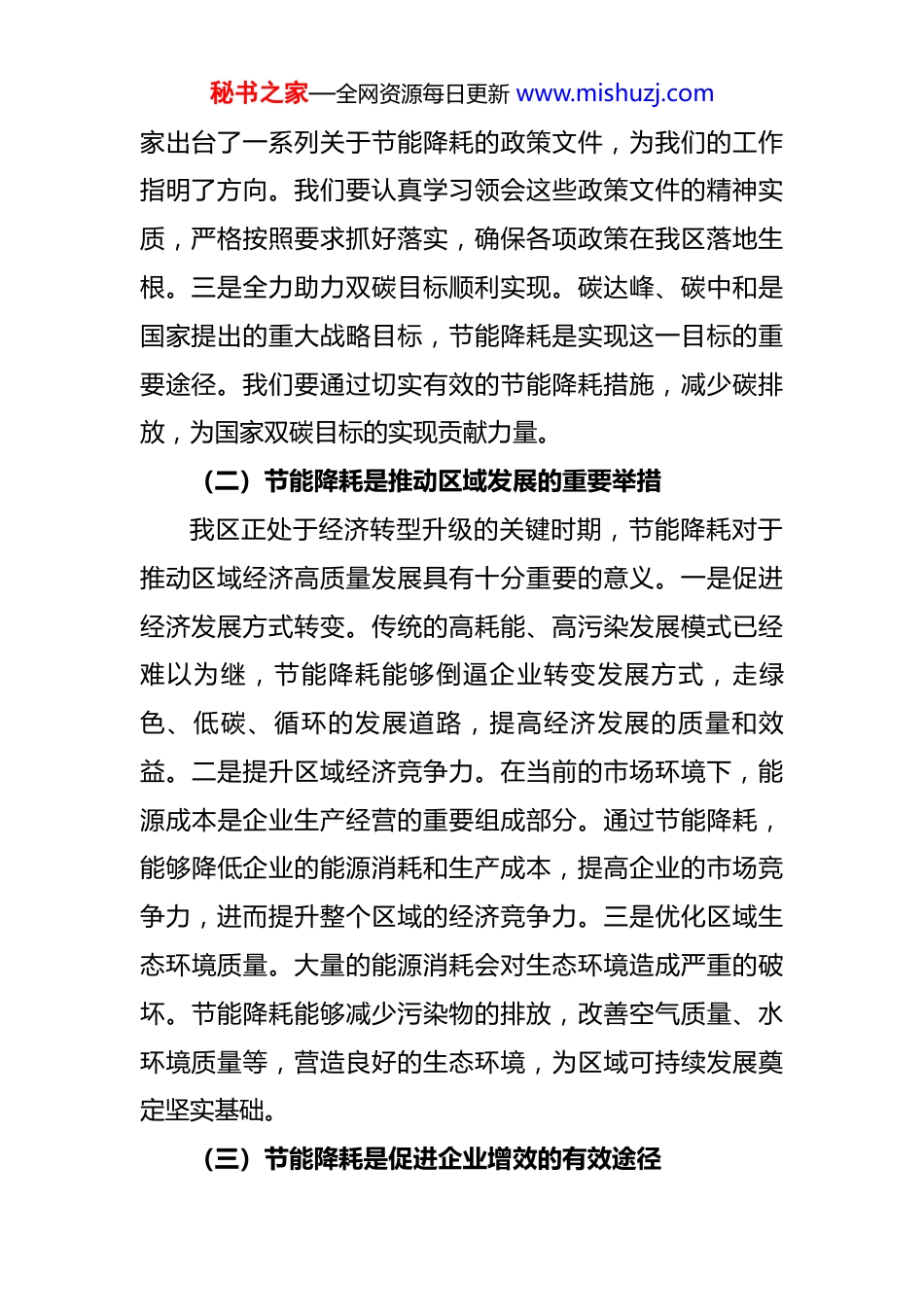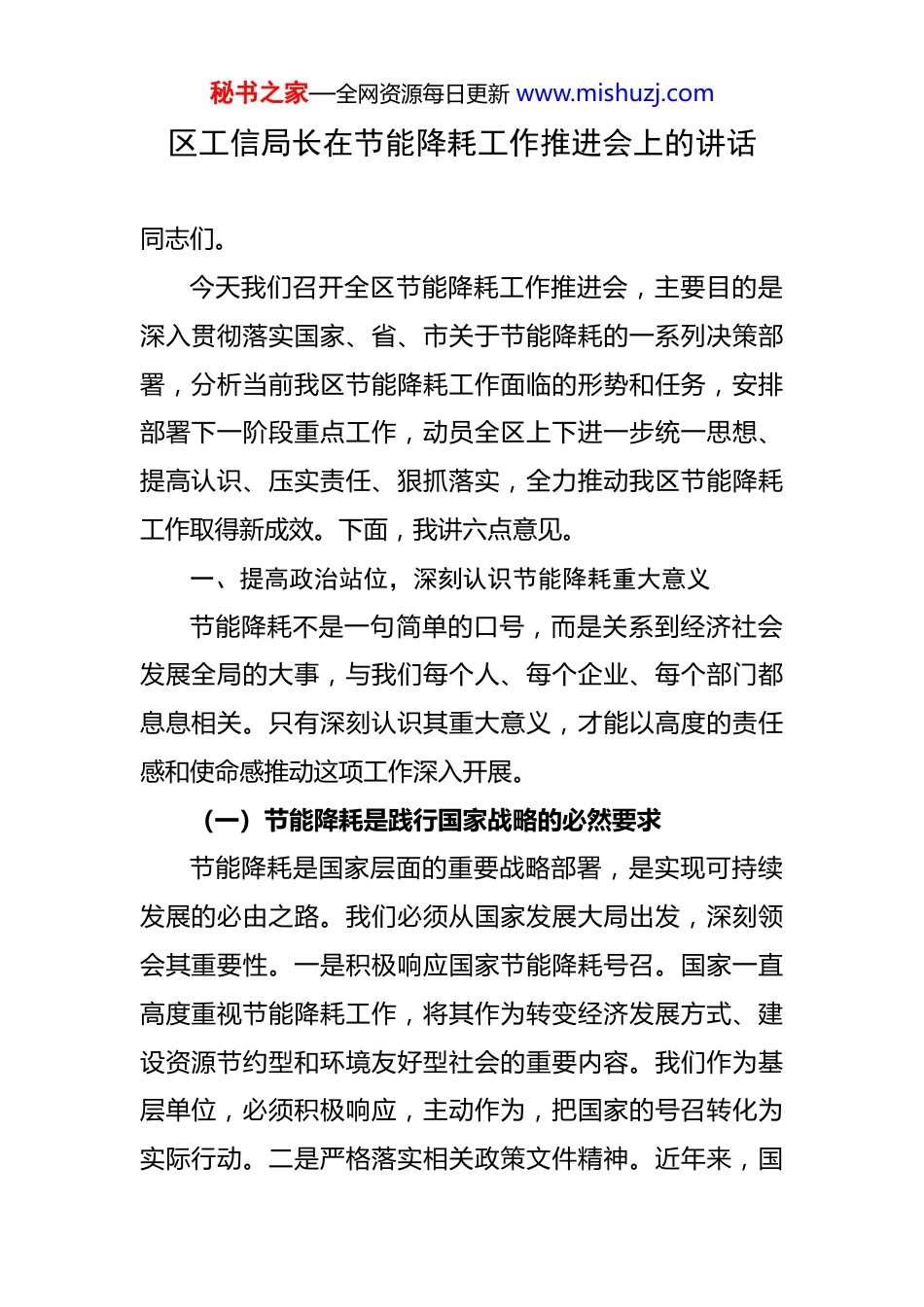 秘书之家—全网资源每日更新 www.mishuzj.com区工信局长在节能降耗工作推进会上的讲话 同志们。今天我们召开全区节能降耗工作推进会,主要目的是深入贯彻落实国家、省、市关于节能降耗的一系列决策部署,分析当前我区节能降耗工作面临的形势和任务,安排部署下一阶段重点工作,动员全区上下进一步统一思想、提高认识、压实责任、狠抓落实,全力推动我区节能降耗工作取得新成效。下面,我讲六点意见。一、提高政治站位,深刻认识节能降耗重大意义节能降耗不是一句简单的口号,而是关系到经济社会发展全局的大事,与我们每个人、每个企业、每个部门都息息相关。只有深刻认识其重大意义,才能以高度的责任感和使命感推动这项工作深入开展。(一)节能降耗是践行国家战略的必然要求节能降耗是国家层面的重要战略部署,是实现可持续发展的必由之路。我们必须从国家发展大局出发,深刻领会其重要性。一是积极响应国家节能降耗号召。国家一直高度重视节能降耗工作,将其作为转变经济发展方式、建设资源节约型和环境友好型社会的重要内容。我们作为基层单位,必须积极响应,主动作为,把国家的号召转化为实际行动。二是严格落实相关政策文件精神。近年来,国秘书之家—全网资源每日更新 www.mishuzj.com家出台了一系列关于节能降耗的政策文件,为我们的工作指明了方向。我们要认真学习领会这些政策文件的精神实质,严格按照要求抓好落实,确保各项政策在我区落地生根。三是全力助力双碳目标顺利实现。碳达峰、碳中和是国家提出的重大战略目标,节能降耗是实现这一目标的重要途径。我们要通过切实有效的节能降耗措施,减少碳排放,为国家双碳目标的实现贡献力量。(二)节能降耗是推动区域发展的重要举措我区正处于经济转型升级的关键时期,节能降耗对于推动区域经济高质量发展具有十分重要的意义。一是促进经济发展方式转变。传统的高耗能、高污染发展模式已经难以为继,节能降耗能够倒逼企业转变发展方式,走绿色、低碳、循环的发展道路,提高经济发展的质量和效益。二是提升区域经济竞争力。在当前的市场环境下,能源成本是企业生产经营的重要组成部分。通过节能降耗,能够降低企业的能源消耗和生产成本,提高企业的市场竞争力,进而提升整个区域的经济竞争力。三是优化区域生态环境质量。大量的能源消耗会对生态环境造成严重的破坏。节能降耗能够减少污染物的排放,改善空气质量、水环境质量等,营造良好的生态环境,为区域可持续发展奠定坚实基础。(三)节能降耗是促进企业增效的有效途径秘书之家—全网资源每日更新 www.mishuzj.com企业是节能降耗的主体,开展节能降耗工作,对于企业自身的发展具有重要的现实意义。一是降低企业生产经营成本。能源消耗在企业的生产成本中占比较大,通过节能降耗措施,企业可以减少能源的使用量,降低能源采购成本,从而提高企业的经济效益。二是提高企业能源利用效率。节能降耗工作能够促使企业改进生产工艺、更新生产设备,提高能源的利用效率,实现能源的最大化利用,减少能源浪费。三是增强企业市场适应能力。随着社会对绿色发展的重视,市场对绿色产品的需求日益增加。企业开展节能降耗工作,生产绿色环保产品,能够更好地适应市场需求,拓展市场空间。四是提升企业社会形象。积极开展节能降耗工作,体现了企业的社会责任感,能够赢得社会各界的认可和好评,提升企业的社会形象和美誉度。(四)节能降耗是改善民生福祉的关键环节节能降耗与人民群众的生活息息相关,直接影响到人民群众的生活质量和幸福指数。一是减少环境污染保障群众健康。能源消耗过程中会产生大量的污染物,如二氧化硫、氮氧化物、粉尘等,这些污染物会对空气、水、土壤等造成污染,危害群众的身体健康。节能降耗能够减少污染物排放,改善环境质量,保障群众的身体健康。二是节约能源资源惠及子孙后代。能源资源是有限的,过度消耗会导致能源资源短缺,影响子孙后代的生存和发展。节能秘书之家—全网资源每日更新 www.mishuzj.com降耗能够节约能源资源,实现能源资源的可持续利用,为子孙后代留下宝贵的财富。三是降低能源费用减轻群众负担。随着能源价格的不断上涨,群...