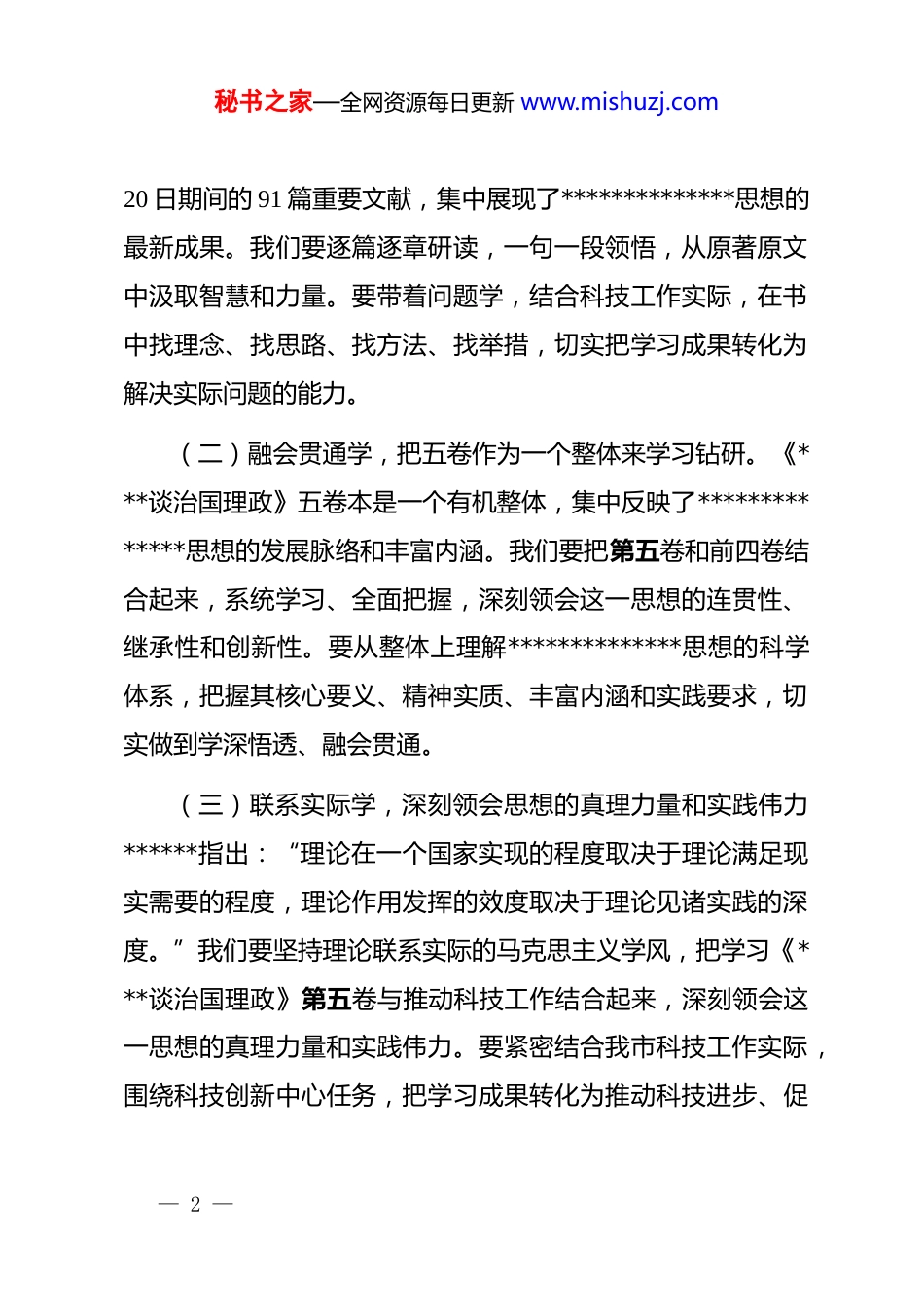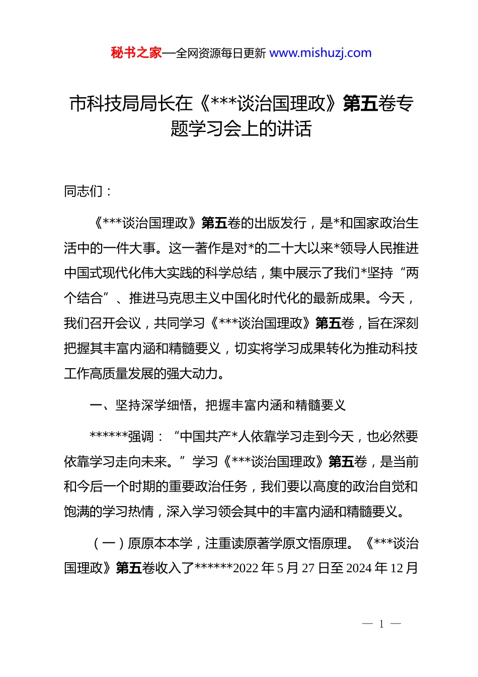 秘书之家—全网资源每日更新 www.mishuzj.com市科技局局长在《***谈治国理政》第五卷专题学习会上的讲话同志们:《***谈治国理政》第五卷的出版发行,是*和国家政治生活中的一件大事。这一著作是对*的二十大以来*领导人民推进中国式现代化伟大实践的科学总结,集中展示了我们*坚持“两个结合”、推进马克思主义中国化时代化的最新成果。今天,我们召开会议,共同学习《***谈治国理政》第五卷,旨在深刻把握其丰富内涵和精髓要义,切实将学习成果转化为推动科技工作高质量发展的强大动力。一、坚持深学细悟,把握丰富内涵和精髓要义******强调:“中国共产*人依靠学习走到今天,也必然要依靠学习走向未来。”学习《***谈治国理政》第五卷,是当前和今后一个时期的重要政治任务,我们要以高度的政治自觉和饱满的学习热情,深入学习领会其中的丰富内涵和精髓要义。(一)原原本本学,注重读原著学原文悟原理。《***谈治国理政》第五卷收入了******2022 年 5 月 27 日至 2024 年 12 月— 1 —秘书之家—全网资源每日更新 www.mishuzj.com20 日期间的 91 篇重要文献,集中展现了**************思想的最新成果。我们要逐篇逐章研读,一句一段领悟,从原著原文中汲取智慧和力量。要带着问题学,结合科技工作实际,在书中找理念、找思路、找方法、找举措,切实把学习成果转化为解决实际问题的能力。(二)融会贯通学,把五卷作为一个整体来学习钻研。《***谈治国理政》五卷本是一个有机整体,集中反映了**************思想的发展脉络和丰富内涵。我们要把第五卷和前四卷结合起来,系统学习、全面把握,深刻领会这一思想的连贯性、继承性和创新性。要从整体上理解**************思想的科学体系,把握其核心要义、精神实质、丰富内涵和实践要求,切实做到学深悟透、融会贯通。(三)联系实际学,深刻领会思想的真理力量和实践伟力******指出:“理论在一个国家实现的程度取决于理论满足现实需要的程度,理论作用发挥的效度取决于理论见诸实践的深度。”我们要坚持理论联系实际的马克思主义学风,把学习《***谈治国理政》第五卷与推动科技工作结合起来,深刻领会这一思想的真理力量和实践伟力。要紧密结合我市科技工作实际,围绕科技创新中心任务,把学习成果转化为推动科技进步、促— 2 —秘书之家—全网资源每日更新 www.mishuzj.com进经济发展的实际行动,切实做到学用结合、知行合一。(四)精心组织学,认真落实“第一议题”制度。我们要切实加强组织领导,认真落实“第一议题”制度,以理论学习中心组、“三会一课”等为抓手,开展系统学习。领导干部要带头领学促学,发挥示范引领作用,引导全体*员干部在学懂弄通做实上下功夫。要精心组织培训,制定详细的学习计划,确保学习活动有序开展。要通过集中学习、个人自学、交流研讨、专题辅导等多种形式,营造浓厚的学习氛围,推动学习活动不断走深走实。二、转化学习成果,推动高水平科技自立自强******强调:“科技是第一生产力、人才是第一资源、创新是第一动力。”我们要切实把学习《***谈治国理政》第五卷的成果转化为推动高水平科技自立自强、建设科技强国的实际成效,为实现*的二十大描绘的宏伟蓝图贡献科技力量。(一)强化职责使命担当,高标准完成*中央赋予的各项工作任务。作为科技部门,我们要深刻认识到肩负的职责使命,切实增强责任感和使命感。要以**************思想为指导,全面贯彻落实*中央关于科技创新的决策部署,紧紧围绕我市经— 3 —秘书之家—全网资源每日更新 www.mishuzj.com济社会发展需求,制定切实可行的科技发展规划和政策措施。要加强对科技创新工作的统筹协调和组织推动,确保*中央赋予的各项工作任务落到实处。(二)务求科技创新工作实效,加快推进“十五五”科技创新规划编制。当前,我们要加快推进“十五五”科技创新规划编制工作,立足我市科技发展现状和优势,明确未来五年科技创新的目标任务、重点领域和关键举措。要加强调查研究,广泛征求意见,确保规划具有科学性、前瞻性和可操作性。要深化科技体制改革,破除制约科技创新的体制机制障碍,激发科技人才的创新活力。要加...