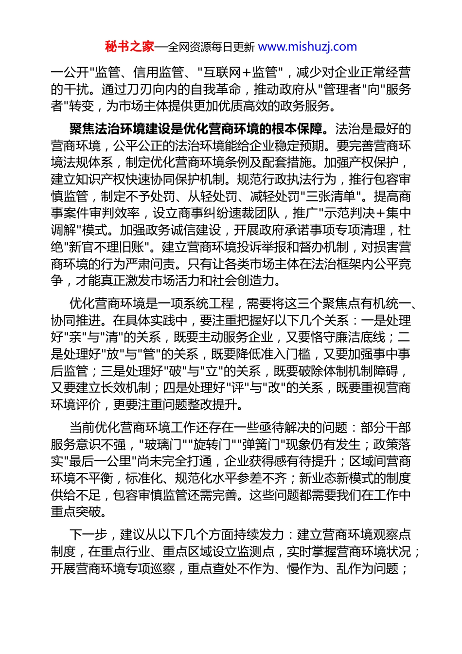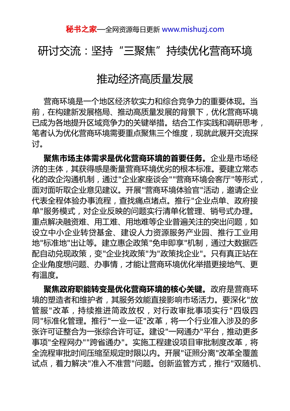 秘书之家—全网资源每日更新 www.mishuzj.com研讨交流:坚持“三聚焦”持续优化营商环境 推动经济高质量发展营商环境是一个地区经济软实力和综合竞争力的重要体现。当前,在构建新发展格局、推动高质量发展的背景下,优化营商环境已成为各地提升区域竞争力的关键举措。结合工作实践和调研思考,笔者认为优化营商环境需要重点聚焦三个维度,现就此展开交流探讨。聚焦市场主体需求是优化营商环境的首要任务。企业是市场经济的主体,其获得感是衡量营商环境优劣的根本标准。要建立常态化的政企沟通机制,通过"企业家座谈会""营商环境会客厅"等形式,面对面听取企业意见建议。开展"营商环境体验官"活动,邀请企业代表全程体验办事流程,查找痛点堵点。推行"企业点单、政府接单"服务模式,对企业反映的问题实行清单化管理、销号式办理。重点解决融资难、用工难、用地难等企业普遍关注的突出问题,如设立中小企业转贷基金、建设人力资源服务产业园、推行工业用地"标准地"出让等。建立惠企政策"免申即享"机制,通过大数据匹配自动兑现政策,变"企业找政策"为"政策找企业"。只有真正站在企业角度想问题、办事情,才能让营商环境优化举措更接地气、更有温度。聚焦政府职能转变是优化营商环境的核心关键。政府是营商环境的塑造者和维护者,其服务效能直接影响市场活力。要深化"放管服"改革,持续推进简政放权,对行政审批事项实行 "四级四同"标准化管理。推行"一业一证"改革,将一个行业准入涉及的多张许可证整合为一张综合许可证。建设"一网通办"平台,推动更多事项"全程网办""跨省通办"。实施工程建设项目审批制度改革,将全流程审批时间压缩至规定时限以内。开展"证照分离"改革全覆盖试点,着力解决"准入不准营"问题。创新监管方式,推行"双随机、秘书之家—全网资源每日更新 www.mishuzj.com一公开"监管、信用监管、"互联网+监管",减少对企业正常经营的干扰。通过刀刃向内的自我革命,推动政府从"管理者"向"服务者"转变,为市场主体提供更加优质高效的政务服务。聚焦法治环境建设是优化营商环境的根本保障。法治是最好的营商环境,公平公正的法治环境能给企业稳定预期。要完善营商环境法规体系,制定优化营商环境条例及配套措施。加强产权保护,建立知识产权快速协同保护机制。规范行政执法行为,推行包容审慎监管,制定不予处罚、从轻处罚、减轻处罚"三张清单"。提高商事案件审判效率,设立商事纠纷速裁团队,推广"示范判决+集中调解"模式。加强政务诚信建设,开展政府承诺事项专项清理,杜绝"新官不理旧账"。建立营商环境投诉举报和督办机制,对损害营商环境的行为严肃问责。只有让各类市场主体在法治框架内公平竞争,才能真正激发市场活力和社会创造力。优化营商环境是一项系统工程,需要将这三个聚焦点有机统一、协同推进。在具体实践中,要注重把握好以下几个关系:一是处理好"亲"与"清"的关系,既要主动服务企业,又要恪守廉洁底线;二是处理好"放"与"管"的关系,既要降低准入门槛,又要加强事中事后监管;三是处理好"破"与"立"的关系,既要破除体制机制障碍,又要建立长效机制;四是处理好"评"与"改"的关系,既要重视营商环境评价,更要注重问题整改提升。当前优化营商环境工作还存在一些亟待解决的问题:部分干部服务意识不强,"玻璃门""旋转门""弹簧门"现象仍有发生;政策落实"最后一公里"尚未完全打通,企业获得感有待提升;区域间营商环境不平衡,标准化、规范化水平参差不齐;新业态新模式的制度供给不足,包容审慎监管还需完善。这些问题都需要我们在工作中重点突破。下一步,建议从以下几个方面持续发力:建立营商环境观察点制度,在重点行业、重点区域设立监测点,实时掌握营商环境状况;开展营商环境专项巡察,重点查处不作为、慢作为、乱作为问题;秘书之家—全网资源每日更新 www.mishuzj.com编制营商环境创新举措清单,每年推出一批突破性、引领性改革措施;加强营商环境队伍建设,培养一批精通业务、熟悉政策的"营商环境专员";建立营商环境评价结果运用机制,将评价结果与绩效考核、干部任用挂钩。优化营商环境永远在路上。我们要以习近平新时代中国特色社会...