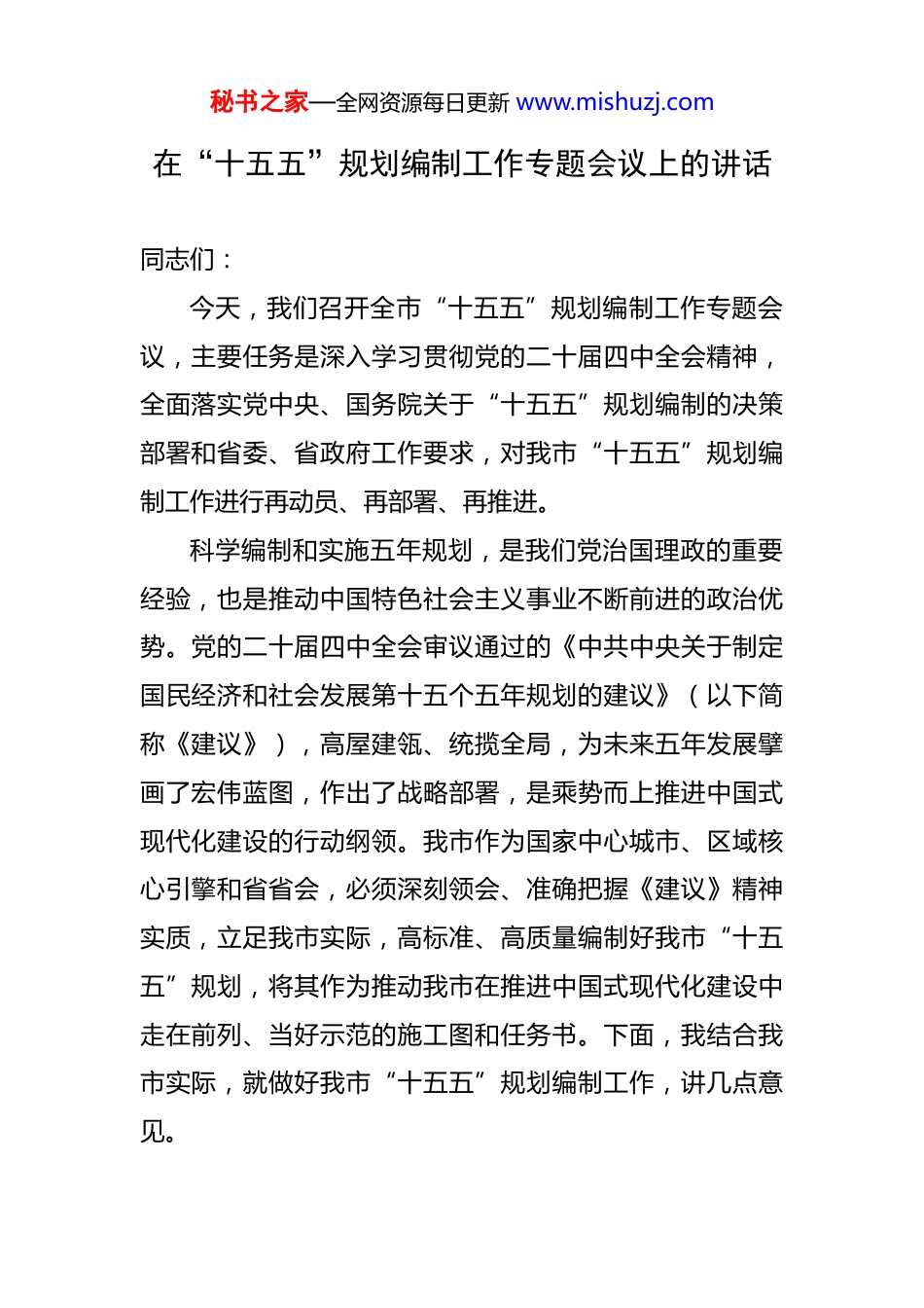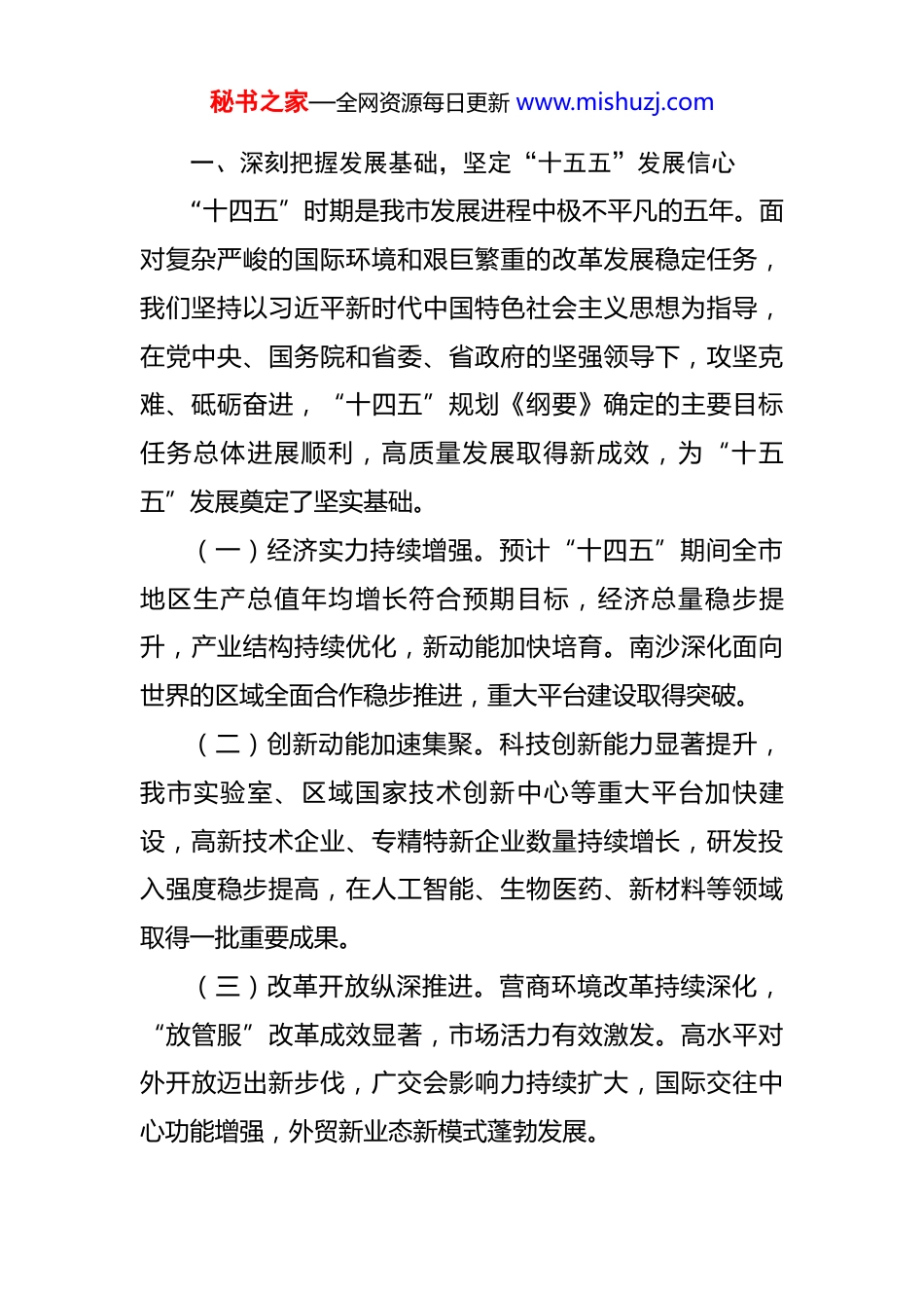 秘书之家—全网资源每日更新 www.mishuzj.com在“十五五”规划编制工作专题会议上的讲话 同志们:今天,我们召开全市“十五五”规划编制工作专题会议,主要任务是深入学习贯彻党的二十届四中全会精神,全面落实党中央、国务院关于“十五五”规划编制的决策部署和省委、省政府工作要求,对我市“十五五”规划编制工作进行再动员、再部署、再推进。科学编制和实施五年规划,是我们党治国理政的重要经验,也是推动中国特色社会主义事业不断前进的政治优势。党的二十届四中全会审议通过的《中共中央关于制定国民经济和社会发展第十五个五年规划的建议》(以下简称《建议》),高屋建瓴、统揽全局,为未来五年发展擘画了宏伟蓝图,作出了战略部署,是乘势而上推进中国式现代化建设的行动纲领。我市作为国家中心城市、区域核心引擎和省省会,必须深刻领会、准确把握《建议》精神实质,立足我市实际,高标准、高质量编制好我市“十五五”规划,将其作为推动我市在推进中国式现代化建设中走在前列、当好示范的施工图和任务书。下面,我结合我市实际,就做好我市“十五五”规划编制工作,讲几点意见。秘书之家—全网资源每日更新 www.mishuzj.com一、深刻把握发展基础,坚定“十五五”发展信心“十四五”时期是我市发展进程中极不平凡的五年。面对复杂严峻的国际环境和艰巨繁重的改革发展稳定任务,我们坚持以习近平新时代中国特色社会主义思想为指导,在党中央、国务院和省委、省政府的坚强领导下,攻坚克难、砥砺奋进,“十四五”规划《纲要》确定的主要目标任务总体进展顺利,高质量发展取得新成效,为“十五五”发展奠定了坚实基础。(一)经济实力持续增强。预计“十四五”期间全市地区生产总值年均增长符合预期目标,经济总量稳步提升,产业结构持续优化,新动能加快培育。南沙深化面向世界的区域全面合作稳步推进,重大平台建设取得突破。(二)创新动能加速集聚。科技创新能力显著提升,我市实验室、区域国家技术创新中心等重大平台加快建设,高新技术企业、专精特新企业数量持续增长,研发投入强度稳步提高,在人工智能、生物医药、新材料等领域取得一批重要成果。(三)改革开放纵深推进。营商环境改革持续深化,“放管服”改革成效显著,市场活力有效激发。高水平对外开放迈出新步伐,广交会影响力持续扩大,国际交往中心功能增强,外贸新业态新模式蓬勃发展。秘书之家—全网资源每日更新 www.mishuzj.com(四)城市功能品质提升。城市更新行动深入实施,重点片区改造取得实效,城市空间格局持续优化。交通枢纽地位巩固提升,国际航空枢纽、国际航运枢纽、世界级铁路枢纽建设取得新进展。智慧城市、韧性城市建设扎实推进。(五)民生福祉显著改善。居民人均可支配收入持续增长,就业形势总体稳定。教育、医疗、文化、体育等公共服务供给不断优化,“一老一小”服务保障体系逐步健全。社会保障覆盖面持续扩大,水平稳步提高。(六)生态环境持续向好。污染防治攻坚战成效显著,空气质量优良天数比例保持高位,水环境质量持续改善,绿色低碳转型步伐加快,绿美我市生态建设扎实推进,城市更加宜居宜业。这些成就的取得,根本在于以习近平同志为核心的党中央领航掌舵,在于习近平新时代中国特色社会主义思想的科学指引。我们要倍加珍惜来之不易的成绩,深刻认识到我市作为国家重要中心城市所肩负的使命责任,进一步增强做好“十五五”规划编制工作的责任感和使命感。二、精准研判形势方位,明确“十五五”战略方向《建议》对“十五五”时期国内外环境的深刻洞察,为我们准确把握发展所处的历史方位提供了根本遵循。我秘书之家—全网资源每日更新 www.mishuzj.com们必须胸怀“两个大局”,深刻认识机遇与挑战并存的特征,增强忧患意识,强化战略思维,以更强的历史主动精神和责任担当谋划未来发展。(一)在服务国家战略全局中找准定位。“十五五”是国家基本实现社会主义现代化承前启后的关键五年。我市作为国家重大战略叠加区域,肩负着服务国家大局和引领区域发展的双重责任。必须牢牢把握这一战略机遇期,在打造国内国际双循环重要枢纽节点、建设国家区域科技创新中心、推动...