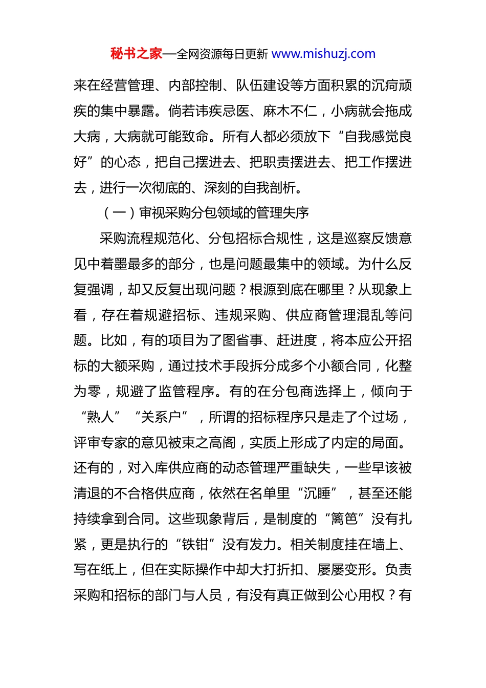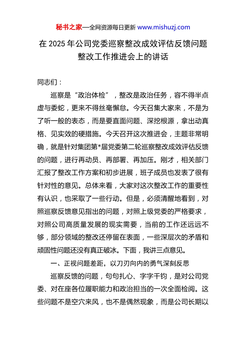 秘书之家—全网资源每日更新 www.mishuzj.com在 2025 年公司党委巡察整改成效评估反馈问题整改工作推进会上的讲话 同志们:巡察是“政治体检”,整改是政治任务,容不得半点虚与委蛇,更来不得丝毫懈怠。今天召集大家来,不是为了听一般的表态,而是要直面问题、深挖根源,拿出动真格、见实效的硬措施。今天召开这次推进会,主题非常明确,就是针对集团第*届党委第二轮巡察整改成效评估反馈的问题,进行再动员、再部署、再加压。刚才,相关部门汇报了整改工作方案和初步进展,班子成员也发表了很有针对性的意见。总体来看,大家对这次整改工作的重要性有认识,也采取了一些行动。但是,必须清醒地看到,对照巡察反馈意见指出的问题,对照上级党委的严格要求,对照公司高质量发展的现实需要,当前的工作还远远不够,部分领域的整改还停留在表面,一些深层次的矛盾和顽固性问题还没有真正破冰。下面,我讲三点意见。一、正视问题差距,以刀刃向内的勇气深刻反思巡察反馈的问题,句句扎心、字字千钧,是对公司党委、对在座各位履职能力和政治担当的一次全面检阅。这些问题不是空穴来风,也不是偶然现象,而是公司长期以秘书之家—全网资源每日更新 www.mishuzj.com来在经营管理、内部控制、队伍建设等方面积累的沉疴顽疾的集中暴露。倘若讳疾忌医、麻木不仁,小病就会拖成大病,大病就可能致命。所有人都必须放下“自我感觉良好”的心态,把自己摆进去、把职责摆进去、把工作摆进去,进行一次彻底的、深刻的自我剖析。(一)审视采购分包领域的管理失序采购流程规范化、分包招标合规性,这是巡察反馈意见中着墨最多的部分,也是问题最集中的领域。为什么反复强调,却又反复出现问题?根源到底在哪里?从现象上看,存在着规避招标、违规采购、供应商管理混乱等问题。比如,有的项目为了图省事、赶进度,将本应公开招标的大额采购,通过技术手段拆分成多个小额合同,化整为零,规避了监管程序。有的在分包商选择上,倾向于“熟人”“关系户”,所谓的招标程序只是走了个过场,评审专家的意见被束之高阁,实质上形成了内定的局面。还有的,对入库供应商的动态管理严重缺失,一些早该被清退的不合格供应商,依然在名单里“沉睡”,甚至还能持续拿到合同。这些现象背后,是制度的“篱笆”没有扎紧,更是执行的“铁钳”没有发力。相关制度挂在墙上、写在纸上,但在实际操作中却大打折扣、屡屡变形。负责采购和招标的部门与人员,有没有真正做到公心用权?有秘书之家—全网资源每日更新 www.mishuzj.com没有把合规当作不可逾越的“高压线”?项目一线的管理者,有没有把降本增效的压力,转化为对每一个采购环节、每一家分包单位的严格把控?这些问题,需要相关部门和人员逐一回答。(二)剖析经济活动分析的精度不彰经济活动分析是企业管理的“仪表盘”和“指挥棒”。巡察反馈指出公司的经济活动分析精准度不高,这个问题看似是技术问题、方法问题,实则是管理理念和管理能力的重大缺陷。一个项目的盈亏,绝不能只看最终的财务报表。精准的经济活动分析,要求动态、实时、穿透式地掌握项目全周期、全链条的成本与效益。然而,当前的情况是,数据壁垒重重,管理存在惰性。财务部门的数据、物资采购部门的数据、项目施工一线的数据,如同一个个“数据孤岛”,互不联通,难以形成完整、闭环的管理视图。财务报表上的利润可能很好看,但项目一线的成本控制可能早已失控,材料的非正常损耗率居高不下,大型设备的闲置时间远超警戒线,人工成本的投入产出比模糊不清。这些关键的过程性指标,要么长期缺失,要么依赖估算,分析报告自然就成了“空中楼阁”,无法为决策提供精准支撑。这种状况的实质,是一些管理者习惯于“拍脑袋”决策,满足于粗放式管理,缺乏运用数字化、秘书之家—全网资源每日更新 www.mishuzj.com信息化手段进行精细化管控的意识和能力。当市场竞争日益激烈,利润空间不断被压缩,这种管理上的“糊涂账”,就是企业发展的最大风险源。(三)深挖问题反复的作风症结无论是采购分包的乱象,还是经济活动分析的失准,这些问题并非首次出现,有的甚至是屡改屡犯。为什么整改...