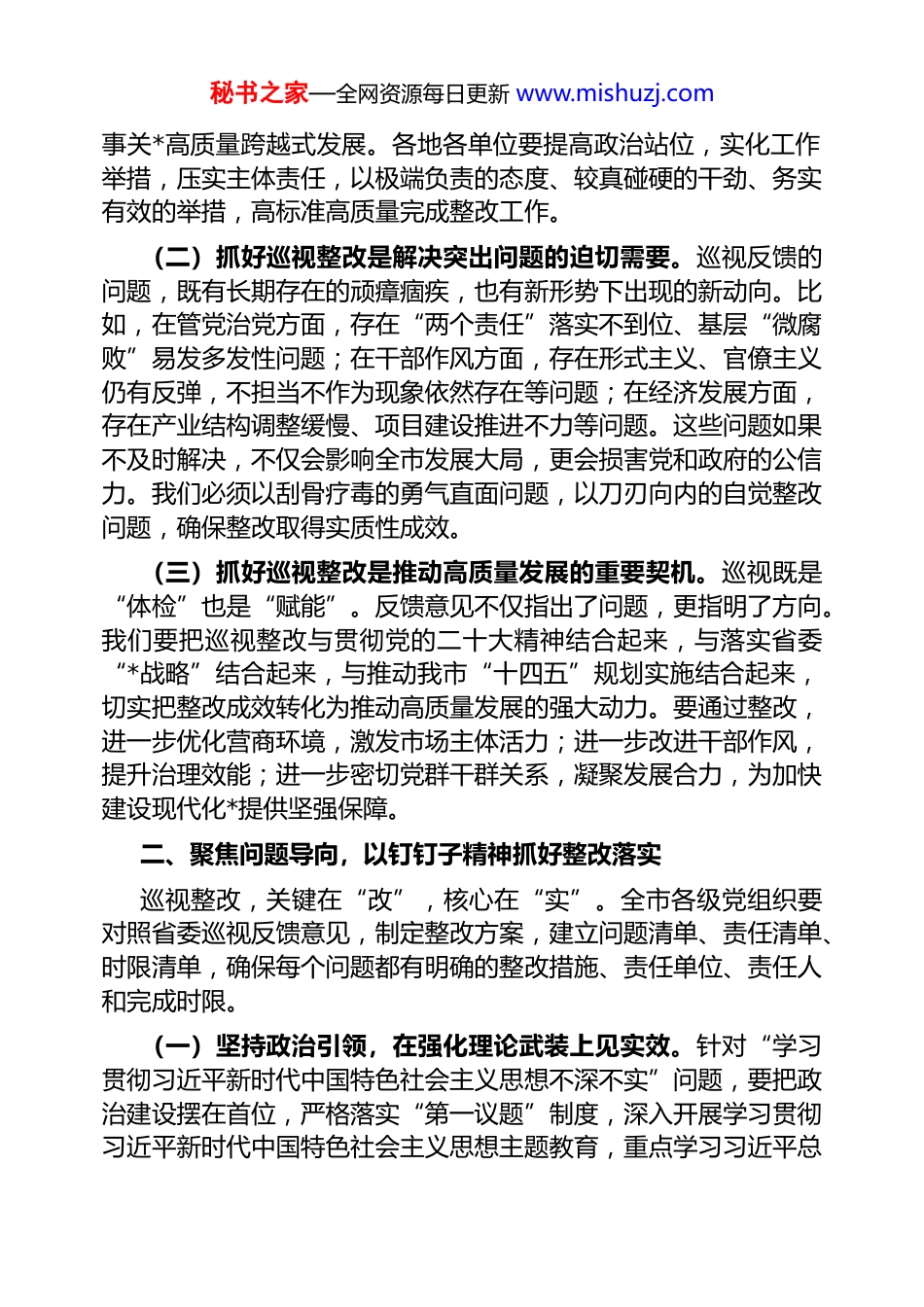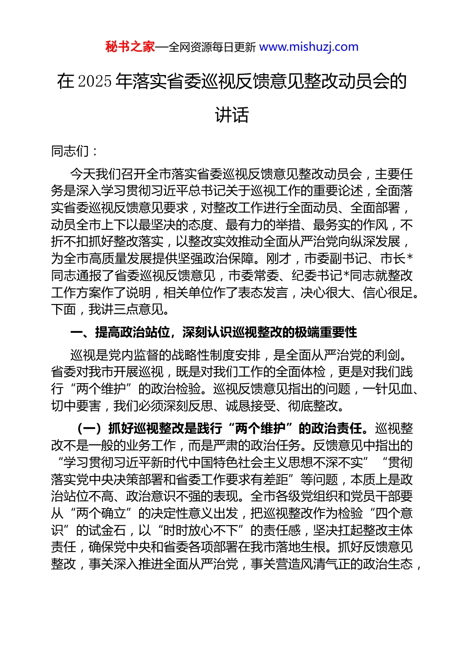 秘书之家—全网资源每日更新 www.mishuzj.com在 2025 年落实省委巡视反馈意见整改动员会的讲话同志们:今天我们召开全市落实省委巡视反馈意见整改动员会,主要任务是深入学习贯彻习近平总书记关于巡视工作的重要论述,全面落实省委巡视反馈意见要求,对整改工作进行全面动员、全面部署,动员全市上下以最坚决的态度、最有力的举措、最务实的作风,不折不扣抓好整改落实,以整改实效推动全面从严治党向纵深发展,为全市高质量发展提供坚强政治保障。刚才,市委副书记、市长*同志通报了省委巡视反馈意见,市委常委、纪委书记*同志就整改工作方案作了说明,相关单位作了表态发言,决心很大、信心很足。下面,我讲三点意见。一、提高政治站位,深刻认识巡视整改的极端重要性巡视是党内监督的战略性制度安排,是全面从严治党的利剑。省委对我市开展巡视,既是对我们工作的全面体检,更是对我们践行“两个维护”的政治检验。巡视反馈意见指出的问题,一针见血、切中要害,我们必须深刻反思、诚恳接受、彻底整改。(一)抓好巡视整改是践行“两个维护”的政治责任。巡视整改不是一般的业务工作,而是严肃的政治任务。反馈意见中指出的“学习贯彻习近平新时代中国特色社会主义思想不深不实”“贯彻落实党中央决策部署和省委工作要求有差距”等问题,本质上是政治站位不高、政治意识不强的表现。全市各级党组织和党员干部要从“两个确立”的决定性意义出发,把巡视整改作为检验“四个意识”的试金石,以“时时放心不下”的责任感,坚决扛起整改主体责任,确保党中央和省委各项部署在我市落地生根。抓好反馈意见整改,事关深入推进全面从严治党,事关营造风清气正的政治生态,秘书之家—全网资源每日更新 www.mishuzj.com事关*高质量跨越式发展。各地各单位要提高政治站位,实化工作举措,压实主体责任,以极端负责的态度、较真碰硬的干劲、务实有效的举措,高标准高质量完成整改工作。(二)抓好巡视整改是解决突出问题的迫切需要。巡视反馈的问题,既有长期存在的顽瘴痼疾,也有新形势下出现的新动向。比如,在管党治党方面,存在“两个责任”落实不到位、基层“微腐败”易发多发性问题;在干部作风方面,存在形式主义、官僚主义仍有反弹,不担当不作为现象依然存在等问题;在经济发展方面,存在产业结构调整缓慢、项目建设推进不力等问题。这些问题如果不及时解决,不仅会影响全市发展大局,更会损害党和政府的公信力。我们必须以刮骨疗毒的勇气直面问题,以刀刃向内的自觉整改问题,确保整改取得实质性成效。(三)抓好巡视整改是推动高质量发展的重要契机。巡视既是“体检”也是“赋能”。反馈意见不仅指出了问题,更指明了方向。我们要把巡视整改与贯彻党的二十大精神结合起来,与落实省委“*战略”结合起来,与推动我市“十四五”规划实施结合起来,切实把整改成效转化为推动高质量发展的强大动力。要通过整改,进一步优化营商环境,激发市场主体活力;进一步改进干部作风,提升治理效能;进一步密切党群干群关系,凝聚发展合力,为加快建设现代化*提供坚强保障。二、聚焦问题导向,以钉钉子精神抓好整改落实巡视整改,关键在“改”,核心在“实”。全市各级党组织要对照省委巡视反馈意见,制定整改方案,建立问题清单、责任清单、时限清单,确保每个问题都有明确的整改措施、责任单位、责任人和完成时限。(一)坚持政治引领,在强化理论武装上见实效。针对“学习贯彻习近平新时代中国特色社会主义思想不深不实”问题,要把政治建设摆在首位,严格落实“第一议题”制度,深入开展学习贯彻习近平新时代中国特色社会主义思想主题教育,重点学习习近平总秘书之家—全网资源每日更新 www.mishuzj.com书记关于本地区本领域工作的重要讲话和指示批示精神。要创新学习方式,通过专题研讨、理论学习中心组学习、基层宣讲等形式,推动学习往深里走、往实里走、往心里走。要坚持学用结合,把学习成果转化为解决实际问题、推动高质量发展的具体行动,确保党中央和省委各项决策部署在我市不折不扣落实到位。(二)坚持从严从实,在压实“两个责任”上见实效。针对“全面从严治党‘两个责任’...