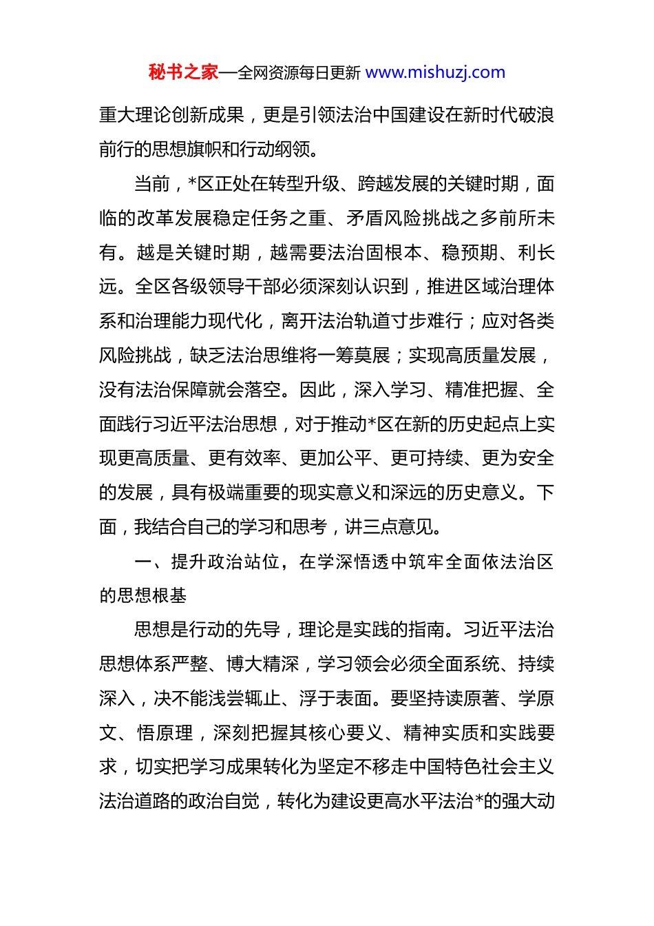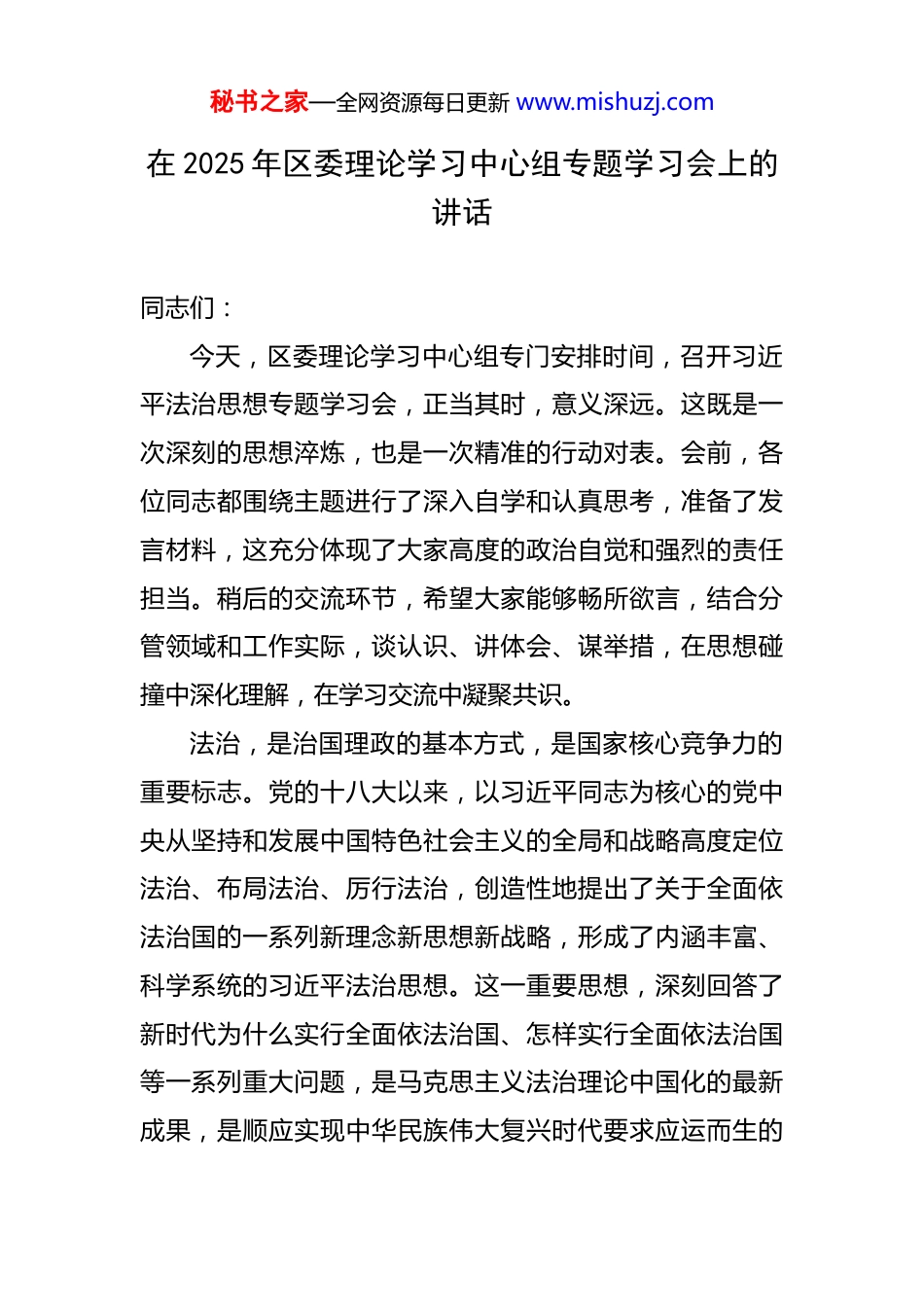 秘书之家—全网资源每日更新 www.mishuzj.com在 2025 年区委理论学习中心组专题学习会上的讲话 同志们:今天,区委理论学习中心组专门安排时间,召开习近平法治思想专题学习会,正当其时,意义深远。这既是一次深刻的思想淬炼,也是一次精准的行动对表。会前,各位同志都围绕主题进行了深入自学和认真思考,准备了发言材料,这充分体现了大家高度的政治自觉和强烈的责任担当。稍后的交流环节,希望大家能够畅所欲言,结合分管领域和工作实际,谈认识、讲体会、谋举措,在思想碰撞中深化理解,在学习交流中凝聚共识。法治,是治国理政的基本方式,是国家核心竞争力的重要标志。党的十八大以来,以习近平同志为核心的党中央从坚持和发展中国特色社会主义的全局和战略高度定位法治、布局法治、厉行法治,创造性地提出了关于全面依法治国的一系列新理念新思想新战略,形成了内涵丰富、科学系统的习近平法治思想。这一重要思想,深刻回答了新时代为什么实行全面依法治国、怎样实行全面依法治国等一系列重大问题,是马克思主义法治理论中国化的最新成果,是顺应实现中华民族伟大复兴时代要求应运而生的秘书之家—全网资源每日更新 www.mishuzj.com重大理论创新成果,更是引领法治中国建设在新时代破浪前行的思想旗帜和行动纲领。当前,*区正处在转型升级、跨越发展的关键时期,面临的改革发展稳定任务之重、矛盾风险挑战之多前所未有。越是关键时期,越需要法治固根本、稳预期、利长远。全区各级领导干部必须深刻认识到,推进区域治理体系和治理能力现代化,离开法治轨道寸步难行;应对各类风险挑战,缺乏法治思维将一筹莫展;实现高质量发展,没有法治保障就会落空。因此,深入学习、精准把握、全面践行习近平法治思想,对于推动*区在新的历史起点上实现更高质量、更有效率、更加公平、更可持续、更为安全的发展,具有极端重要的现实意义和深远的历史意义。下面,我结合自己的学习和思考,讲三点意见。一、提升政治站位,在学深悟透中筑牢全面依法治区的思想根基思想是行动的先导,理论是实践的指南。习近平法治思想体系严整、博大精深,学习领会必须全面系统、持续深入,决不能浅尝辄止、浮于表面。要坚持读原著、学原文、悟原理,深刻把握其核心要义、精神实质和实践要求,切实把学习成果转化为坚定不移走中国特色社会主义法治道路的政治自觉,转化为建设更高水平法治*的强大动秘书之家—全网资源每日更新 www.mishuzj.com力。(一)要深刻把握坚持党对全面依法治国领导的根本要求。习近平总书记强调,“党的领导是中国特色社会主义法治之魂”。这是我国法治建设最根本的保证。学习贯彻习近平法治思想,首要的就是要深刻领悟“两个确立”的决定性意义,坚决做到“两个维护”,始终在思想上政治上行动上同以习近平同志为核心的党中央保持高度一致。在法治建设的实践中,必须旗帜鲜明地坚持党的领导,将党的领导贯穿于依法治区工作的全过程和各方面。要健全党领导依法治区工作的制度和工作机制,完善党委听取和研究法治工作报告、重大决策合法性审查等制度,确保党的主张通过法定程序成为全社会的共同意志,确保党的组织和党员干部在宪法法律范围内活动。任何时候、任何情况下,都不能有丝毫动摇,绝不允许出现任何偏离党的领导的杂音和行动。(二)要深刻把握以人民为中心的根本立场。全面依法治国,最广泛、最深厚的基础是人民。习近平法治思想蕴含着鲜明的人民立场,强调“要把体现人民利益、反映人民愿望、维护人民权益、增进人民福祉落实到全面依法治国各领域全过程”。法治建设的成效,最终要由人民群众来评判。推进法治*建设,必须始终站稳人民立场,把人秘书之家—全网资源每日更新 www.mishuzj.com民群众满意不满意作为衡量工作的根本标准。要聚焦人民群众在民主、法治、公平、正义、安全、环境等方面日益增长的要求,推出更多有温度、有力量的法治举措。要畅通人民群众参与法治建设的渠道,无论是立法协商、执法监督,还是司法公开、普法宣传,都要充分听取群众意见,主动接受群众监督,让法治建设深深植根于人民群众的创造性实践之中,确保法治发展成果由人民共享。(...