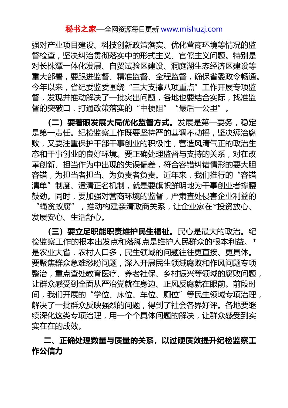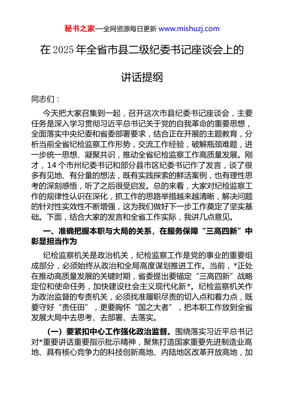 秘书之家—全网资源每日更新 www.mishuzj.com在 2025 年全省市县二级纪委书记座谈会上的讲话提纲同志们:今天把大家召集到一起,召开这次市县纪委书记座谈会,主要任务是深入学习贯彻习近平总书记关于党的自我革命的重要思想,全面落实中央纪委和省委部署要求,结合正在开展的主题教育,分析当前全省纪检监察工作形势,交流工作经验,破解瓶颈难题,进一步统一思想、凝聚共识,推动全省纪检监察工作高质量发展。刚才,14 个市州纪委书记和部分县市区纪委书记作了发言,谈了很多有见地、有分量的想法,既有实践探索的鲜活案例,也有理性思考的深刻感悟,听了之后很受启发。总的来看,大家对纪检监察工作的规律性认识在深化,抓工作的思路举措越来越清晰,解决问题的针对性实效性不断增强,这为我们做好下一步工作奠定了坚实基础。下面,结合大家的发言和全省工作实际,我讲几点意见。一、准确把握本职与大局的关系,在服务保障“三高四新”中彰显担当作为纪检监察机关是政治机关,纪检监察工作是党的事业的重要组成部分,必须始终从政治和全局高度谋划推进工作。当前,*正处在推动高质量发展的关键时期,省委提出要锚定“三高四新”战略定位和使命任务,加快建设社会主义现代化新*。纪检监察机关作为政治监督的专责机关,必须找准履职尽责的切入点和着力点,既要守好“责任田”,更要胸怀“国之大者”,把本职工作放到全省发展大局中去思考、去部署、去落实。(一)要紧扣中心工作强化政治监督。围绕落实习近平总书记对*重要讲话重要指示批示精神,聚焦打造国家重要先进制造业高地、具有核心竞争力的科技创新高地、内陆地区改革开放高地,加秘书之家—全网资源每日更新 www.mishuzj.com强对产业项目建设、科技创新政策落实、优化营商环境等情况的监督检查,坚决纠治贯彻落实中的形式主义、官僚主义问题。特别是对长株潭一体化发展、自贸试验区建设、洞庭湖生态经济区建设等重大部署,要跟进监督、精准监督、全程监督,确保省委政令畅通。今年以来,省纪委监委围绕“三大支撑八项重点”工作开展专项监督,发现并推动解决了一批突出问题,各地也要结合实际,找准监督的突破口,打通政策落实的“中梗阻”“最后一公里”。(二)要着眼发展大局优化监督方式。发展是第一要务,稳定是第一责任。纪检监察工作既要坚持严的基调不动摇,坚决惩治腐败,又要注重保护干部干事创业的积极性,营造风清气正的政治生态和干事创业的良好环境。要正确处理监督与支持的关系,对在改革创新、担当作为中出现的失误偏差,符合容错纠错情形的要大胆容错,为担当者担当、为负责者负责。近年来,我们推行的“容错清单”制度、澄清正名机制,就是要旗帜鲜明地为干事创业者撑腰鼓劲。同时,要加强对营商环境的监督,严肃查处侵害企业利益的“蝇贪蚁腐”,推动构建亲清政商关系,让企业家在*投资放心、发展安心、生活舒心。(三)要立足职能职责维护民生福祉。民心是最大的政治。纪检监察工作的根本出发点和落脚点是维护人民群众的根本利益。*是农业大省,农村人口多,民生领域的问题往往更直接、更具体。要聚焦群众急难愁盼问题,深入开展民生领域腐败和作风问题专项整治,重点查处教育医疗、养老社保、乡村振兴等领域的腐败问题,让群众感受到全面从严治党就在身边、正风反腐就在眼前。前段时间,我们开展的“学位、床位、车位、厕位”等民生领域专项治理,解决了一批群众反映强烈的问题,得到了社会各界好评。各地要继续深化这类专项治理,用一个个具体问题的解决,让群众感受到实实在在的成效。二、正确处理数量与质量的关系,以过硬质效提升纪检监察工作公信力秘书之家—全网资源每日更新 www.mishuzj.com纪检监察工作是政治性很强的业务工作,也是业务性很强的政治工作,必须把质量作为生命线来抓。近年来,全省纪检监察机关受理信访举报、处置问题线索、立案查处案件的数量保持了一定规模,这体现了我们惩治腐败的坚定决心。但数量不等于质量,查处不等于解决问题,必须在提高质效上下更大功夫,做到数量与质量相统一、力度与效果相统一。(一)要着力提升线索处置质效。问题线索是纪检监察工作的...