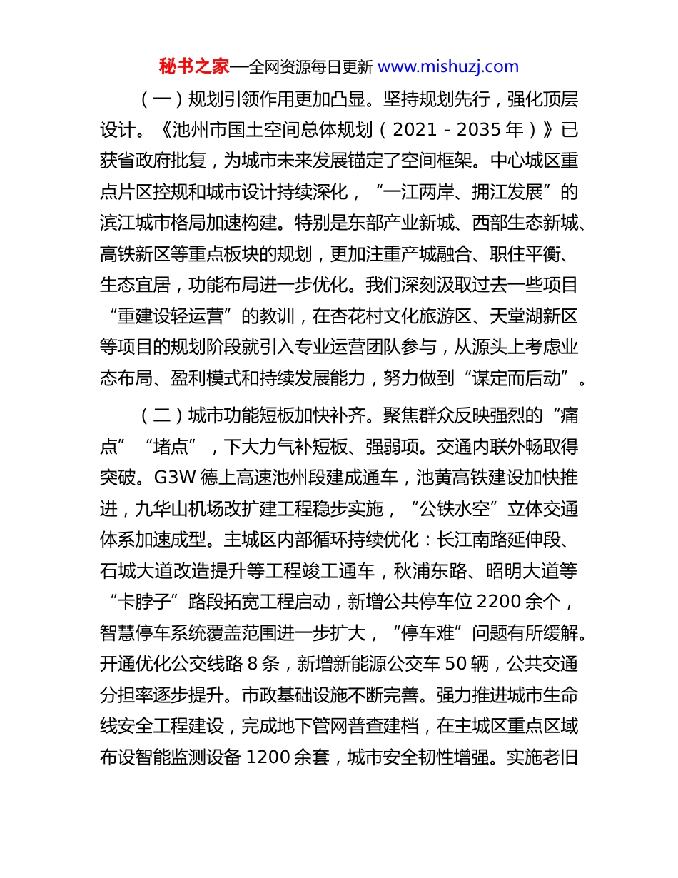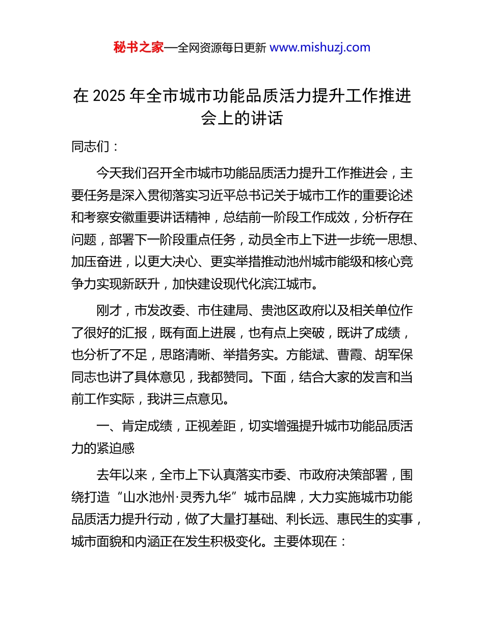 秘书之家—全网资源每日更新 www.mishuzj.com在 2025 年全市城市功能品质活力提升工作推进会上的讲话同志们:今天我们召开全市城市功能品质活力提升工作推进会,主要任务是深入贯彻落实习近平总书记关于城市工作的重要论述和考察安徽重要讲话精神,总结前一阶段工作成效,分析存在问题,部署下一阶段重点任务,动员全市上下进一步统一思想、加压奋进,以更大决心、更实举措推动池州城市能级和核心竞争力实现新跃升,加快建设现代化滨江城市。刚才,市发改委、市住建局、贵池区政府以及相关单位作了很好的汇报,既有面上进展,也有点上突破,既讲了成绩,也分析了不足,思路清晰、举措务实。方能斌、曹霞、胡军保同志也讲了具体意见,我都赞同。下面,结合大家的发言和当前工作实际,我讲三点意见。一、肯定成绩,正视差距,切实增强提升城市功能品质活力的紧迫感去年以来,全市上下认真落实市委、市政府决策部署,围绕打造“山水池州·灵秀九华”城市品牌,大力实施城市功能品质活力提升行动,做了大量打基础、利长远、惠民生的实事,城市面貌和内涵正在发生积极变化。主要体现在:秘书之家—全网资源每日更新 www.mishuzj.com(一)规划引领作用更加凸显。坚持规划先行,强化顶层设计。《池州市国土空间总体规划(2021-2035 年)》已获省政府批复,为城市未来发展锚定了空间框架。中心城区重点片区控规和城市设计持续深化,“一江两岸、拥江发展”的滨江城市格局加速构建。特别是东部产业新城、西部生态新城、高铁新区等重点板块的规划,更加注重产城融合、职住平衡、生态宜居,功能布局进一步优化。我们深刻汲取过去一些项目“重建设轻运营”的教训,在杏花村文化旅游区、天堂湖新区等项目的规划阶段就引入专业运营团队参与,从源头上考虑业态布局、盈利模式和持续发展能力,努力做到“谋定而后动”。(二)城市功能短板加快补齐。聚焦群众反映强烈的“痛点”“堵点”,下大力气补短板、强弱项。交通内联外畅取得突破。G3W 德上高速池州段建成通车,池黄高铁建设加快推进,九华山机场改扩建工程稳步实施,“公铁水空”立体交通体系加速成型。主城区内部循环持续优化:长江南路延伸段、石城大道改造提升等工程竣工通车,秋浦东路、昭明大道等“卡脖子”路段拓宽工程启动,新增公共停车位 2200 余个,智慧停车系统覆盖范围进一步扩大,“停车难”问题有所缓解。开通优化公交线路 8 条,新增新能源公交车 50 辆,公共交通分担率逐步提升。市政基础设施不断完善。强力推进城市生命线安全工程建设,完成地下管网普查建档,在主城区重点区域布设智能监测设备 1200 余套,城市安全韧性增强。实施老旧秘书之家—全网资源每日更新 www.mishuzj.com小区改造项目 52 个,惠及居民 1.8 万户,同步推进加装电梯工作(已完成 35 部,在建 20 部)。新建改造供水管网 35公里、燃气管网 42 公里,城市供水保障能力提升。主城区雨污分流改造完成 85%的工作量,水环境治理成效显现。公共服务供给持续优化。市人民医院新院区主体结构封顶,市中医院新院区建设稳步推进,市妇幼儿童医院规划落地。教育园区功能品质提升初见成效:新增幼儿园学位 900 个、中小学学位 3000 个,市一中、市十一中等学校改扩建项目投入使用;园区内体育场馆、文化设施、商业配套等规划建设加快布局,正着力解决师生反映的就医、购物、休闲不便等问题。建成社区养老服务中心(站)15 个、社区食堂 10 个、口袋公园 27个,15 分钟便民生活圈更加完善。(三)城市品质魅力逐步彰显。坚持“面子”“里子”一起抓,不断提升城市颜值和气质。生态本底更加厚植。严格保护“一江(长江)一湖(平天湖)一山(九华山)”生态屏障,持续推进长江岸线生态修复和景观提升,平天湖国家湿地公园保护管理持续加强。建成区绿地率达 39.5%,人均公园绿地面积 15.2 平方米,成功创建国家森林城市。“推窗见绿、出门入园”成为市民生活常态。历史文脉有效传承。加强历史文化街区、历史建筑保护修缮,孝肃街、秀山门等历史文化街区风貌整治提升工程有序推进。杏花村文化旅游区建设突出唐风古韵与文...