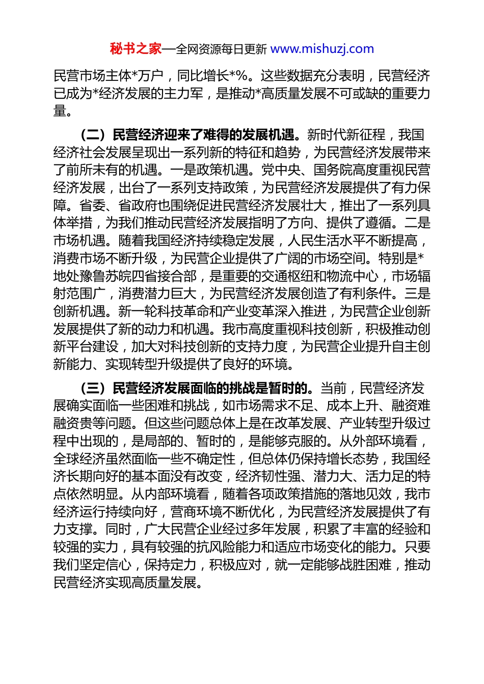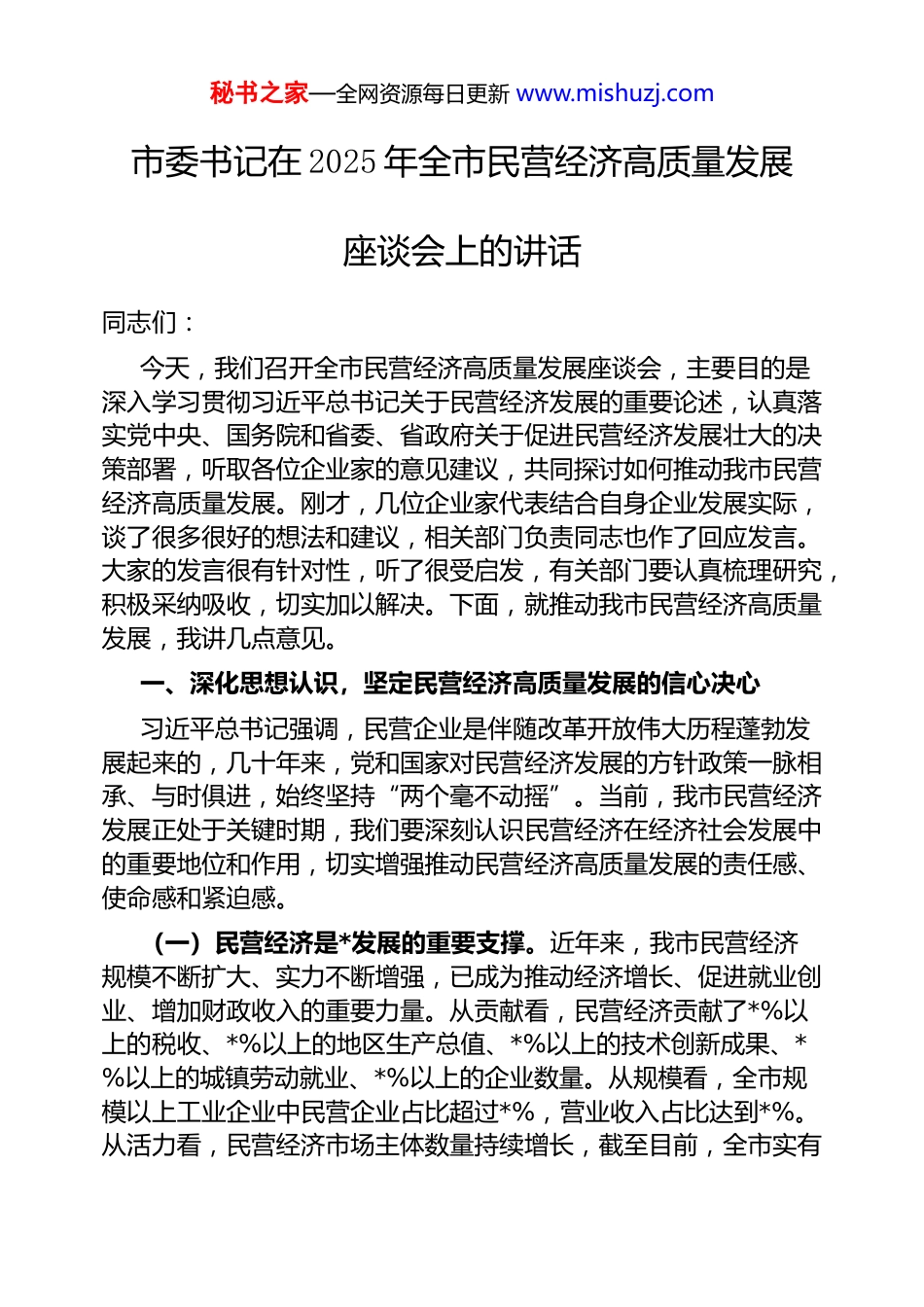 秘书之家—全网资源每日更新 www.mishuzj.com市委书记在 2025 年全市民营经济高质量发展座谈会上的讲话同志们:今天,我们召开全市民营经济高质量发展座谈会,主要目的是深入学习贯彻习近平总书记关于民营经济发展的重要论述,认真落实党中央、国务院和省委、省政府关于促进民营经济发展壮大的决策部署,听取各位企业家的意见建议,共同探讨如何推动我市民营经济高质量发展。刚才,几位企业家代表结合自身企业发展实际,谈了很多很好的想法和建议,相关部门负责同志也作了回应发言。大家的发言很有针对性,听了很受启发,有关部门要认真梳理研究,积极采纳吸收,切实加以解决。下面,就推动我市民营经济高质量发展,我讲几点意见。一、深化思想认识,坚定民营经济高质量发展的信心决心习近平总书记强调,民营企业是伴随改革开放伟大历程蓬勃发展起来的,几十年来,党和国家对民营经济发展的方针政策一脉相承、与时俱进,始终坚持“两个毫不动摇”。当前,我市民营经济发展正处于关键时期,我们要深刻认识民营经济在经济社会发展中的重要地位和作用,切实增强推动民营经济高质量发展的责任感、使命感和紧迫感。(一)民营经济是*发展的重要支撑。近年来,我市民营经济规模不断扩大、实力不断增强,已成为推动经济增长、促进就业创业、增加财政收入的重要力量。从贡献看,民营经济贡献了*%以上的税收、*%以上的地区生产总值、*%以上的技术创新成果、*%以上的城镇劳动就业、*%以上的企业数量。从规模看,全市规模以上工业企业中民营企业占比超过*%,营业收入占比达到*%。从活力看,民营经济市场主体数量持续增长,截至目前,全市实有秘书之家—全网资源每日更新 www.mishuzj.com民营市场主体*万户,同比增长*%。这些数据充分表明,民营经济已成为*经济发展的主力军,是推动*高质量发展不可或缺的重要力量。(二)民营经济迎来了难得的发展机遇。新时代新征程,我国经济社会发展呈现出一系列新的特征和趋势,为民营经济发展带来了前所未有的机遇。一是政策机遇。党中央、国务院高度重视民营经济发展,出台了一系列支持政策,为民营经济发展提供了有力保障。省委、省政府也围绕促进民营经济发展壮大,推出了一系列具体举措,为我们推动民营经济发展指明了方向、提供了遵循。二是市场机遇。随着我国经济持续稳定发展,人民生活水平不断提高,消费市场不断升级,为民营企业提供了广阔的市场空间。特别是*地处豫鲁苏皖四省接合部,是重要的交通枢纽和物流中心,市场辐射范围广,消费潜力巨大,为民营经济发展创造了有利条件。三是创新机遇。新一轮科技革命和产业变革深入推进,为民营企业创新发展提供了新的动力和机遇。我市高度重视科技创新,积极推动创新平台建设,加大对科技创新的支持力度,为民营企业提升自主创新能力、实现转型升级提供了良好的环境。(三)民营经济发展面临的挑战是暂时的。当前,民营经济发展确实面临一些困难和挑战,如市场需求不足、成本上升、融资难融资贵等问题。但这些问题总体上是在改革发展、产业转型升级过程中出现的,是局部的、暂时的,是能够克服的。从外部环境看,全球经济虽然面临一些不确定性,但总体仍保持增长态势,我国经济长期向好的基本面没有改变,经济韧性强、潜力大、活力足的特点依然明显。从内部环境看,随着各项政策措施的落地见效,我市经济运行持续向好,营商环境不断优化,为民营经济发展提供了有力支撑。同时,广大民营企业经过多年发展,积累了丰富的经验和较强的实力,具有较强的抗风险能力和适应市场变化的能力。只要我们坚定信心,保持定力,积极应对,就一定能够战胜困难,推动民营经济实现高质量发展。秘书之家—全网资源每日更新 www.mishuzj.com二、聚焦重点任务,推动民营经济高质量发展取得新突破推动民营经济高质量发展,要坚持问题导向,聚焦重点领域和关键环节,着力破解制约民营经济发展的瓶颈问题,努力实现民营经济发展质量、效益和竞争力的全面提升。(一)着力优化营商环境。一是深化“放管服效”改革。持续推进简政放权,进一步精简行政审批事项,优化审批流程,提高审批效率。全面推行“一网通办”“最多跑...
