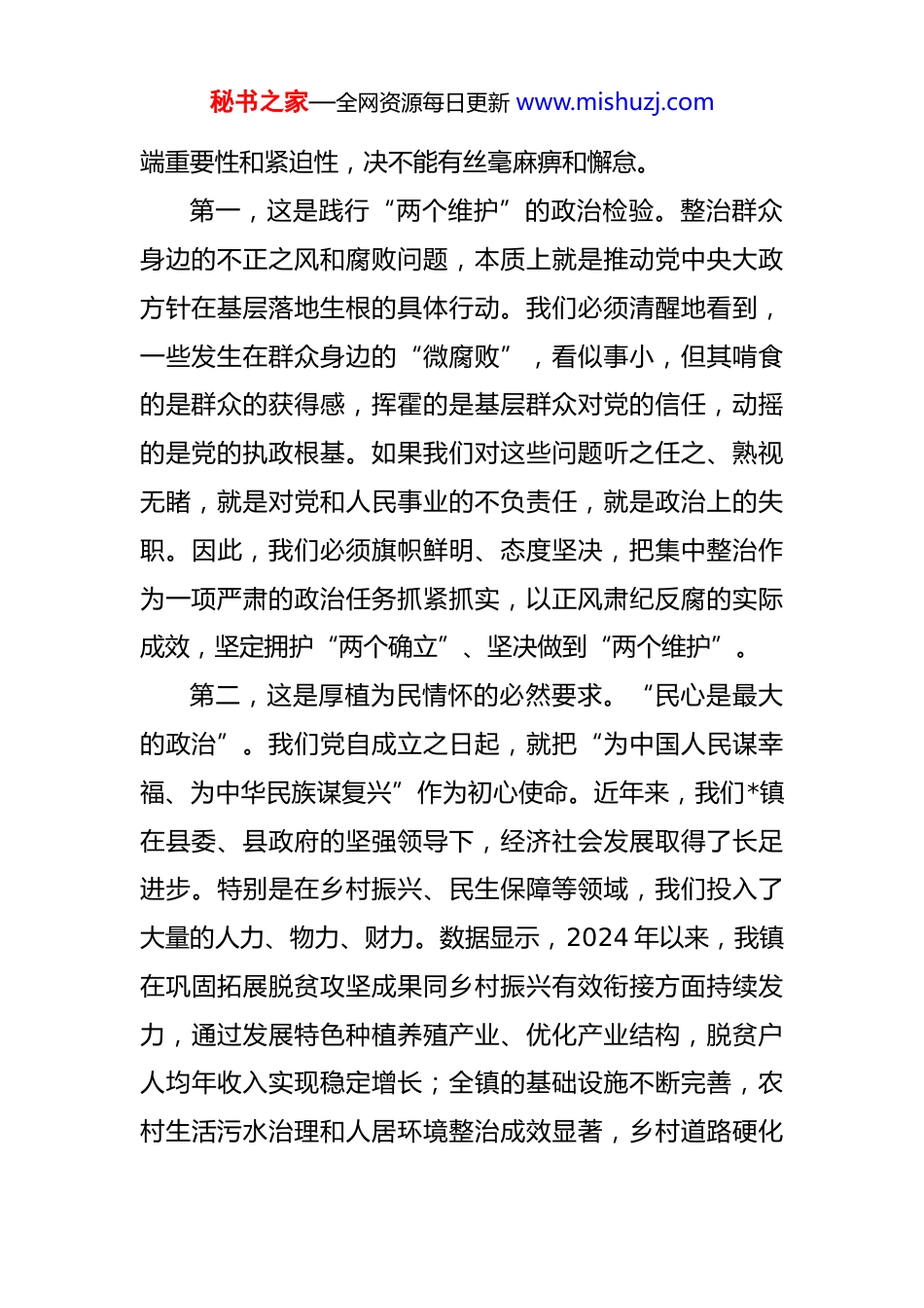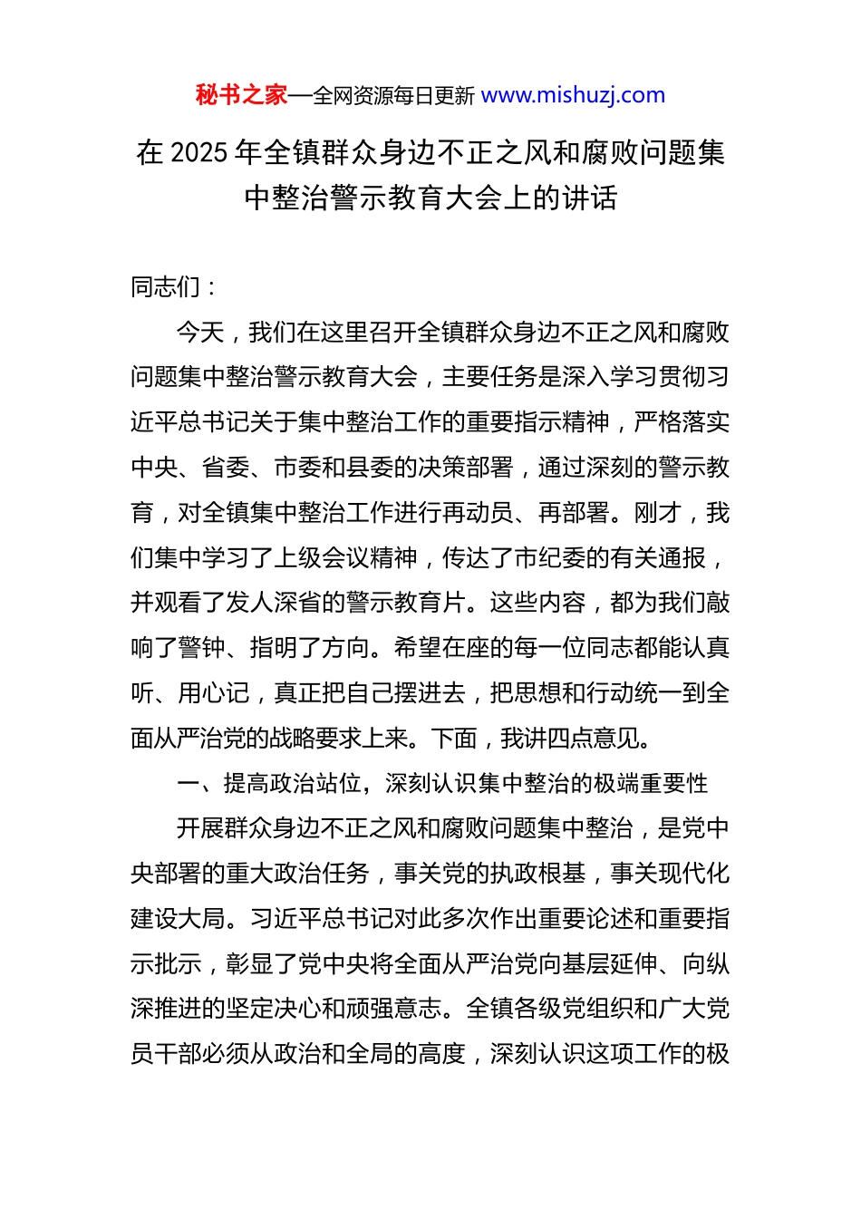 秘书之家—全网资源每日更新 www.mishuzj.com在 2025 年全镇群众身边不正之风和腐败问题集中整治警示教育大会上的讲话 同志们:今天,我们在这里召开全镇群众身边不正之风和腐败问题集中整治警示教育大会,主要任务是深入学习贯彻习近平总书记关于集中整治工作的重要指示精神,严格落实中央、省委、市委和县委的决策部署,通过深刻的警示教育,对全镇集中整治工作进行再动员、再部署。刚才,我们集中学习了上级会议精神,传达了市纪委的有关通报,并观看了发人深省的警示教育片。这些内容,都为我们敲响了警钟、指明了方向。希望在座的每一位同志都能认真听、用心记,真正把自己摆进去,把思想和行动统一到全面从严治党的战略要求上来。下面,我讲四点意见。一、提高政治站位,深刻认识集中整治的极端重要性开展群众身边不正之风和腐败问题集中整治,是党中央部署的重大政治任务,事关党的执政根基,事关现代化建设大局。习近平总书记对此多次作出重要论述和重要指示批示,彰显了党中央将全面从严治党向基层延伸、向纵深推进的坚定决心和顽强意志。全镇各级党组织和广大党员干部必须从政治和全局的高度,深刻认识这项工作的极秘书之家—全网资源每日更新 www.mishuzj.com端重要性和紧迫性,决不能有丝毫麻痹和懈怠。第一,这是践行“两个维护”的政治检验。整治群众身边的不正之风和腐败问题,本质上就是推动党中央大政方针在基层落地生根的具体行动。我们必须清醒地看到,一些发生在群众身边的“微腐败”,看似事小,但其啃食的是群众的获得感,挥霍的是基层群众对党的信任,动摇的是党的执政根基。如果我们对这些问题听之任之、熟视无睹,就是对党和人民事业的不负责任,就是政治上的失职。因此,我们必须旗帜鲜明、态度坚决,把集中整治作为一项严肃的政治任务抓紧抓实,以正风肃纪反腐的实际成效,坚定拥护“两个确立”、坚决做到“两个维护”。第二,这是厚植为民情怀的必然要求。“民心是最大的政治”。我们党自成立之日起,就把“为中国人民谋幸福、为中华民族谋复兴”作为初心使命。近年来,我们*镇在县委、县政府的坚强领导下,经济社会发展取得了长足进步。特别是在乡村振兴、民生保障等领域,我们投入了大量的人力、物力、财力。数据显示,2024 年以来,我镇在巩固拓展脱贫攻坚成果同乡村振兴有效衔接方面持续发力,通过发展特色种植养殖产业、优化产业结构,脱贫户人均年收入实现稳定增长;全镇的基础设施不断完善,农村生活污水治理和人居环境整治成效显著,乡村道路硬化秘书之家—全网资源每日更新 www.mishuzj.com里程逐年增加。在民生领域,我们努力补齐教育短板,办学条件持续改善,义务教育优质均衡发展水平稳步提高;医疗卫生服务体系日益健全,镇卫生院和村卫生室的服务能力显著增强,城乡居民基本医疗保险参保率稳定在 95%以上。在养老社保方面,城乡居民基本养老保险覆盖面持续扩大,对特困人员、留守老人的关爱服务体系更加完善。这些成绩的取得,是全镇干部群众共同奋斗的结果,来之不易。我们必须确保这些发展的成果能够不折不扣地惠及每一位群众,决不能让腐败的“黑手”伸向群众的“口粮田”和“救命钱”。第三,这是推进全面从严治党向基层延伸的现实需要。党的十八大以来,全面从严治党取得了历史性、开创性成就。但我们也要清醒地看到,反腐败斗争形势依然严峻复杂,压力传导在基层末梢存在层层递减的现象,“上热中温下冷”的问题在一定范围内仍然存在。从近两年上级通报和我们自身查处的案件来看,一些基层干部纪法意识淡薄,利用手中的“小微权力”以权谋私、吃拿卡要、优亲厚友的问题时有发生。这些问题虽然发生在个别人身上,但严重损害了党和政府的形象,败坏了社会风气。据不完全统计,仅在 2023 年至 2024 年期间,我镇纪委就收到相关问题线索数十件,立案查处了多起案件,涉及党员秘书之家—全网资源每日更新 www.mishuzj.com干部数人。这充分说明,我们身边的“苍蝇”“蚊子”并未绝迹,滋生腐败的土壤依然存在。我们必须坚持问题导向,拿出刮骨疗毒、猛药去疴的勇气,坚决把群众身边的“蛀虫”一个个揪出来,把全面从严治党...