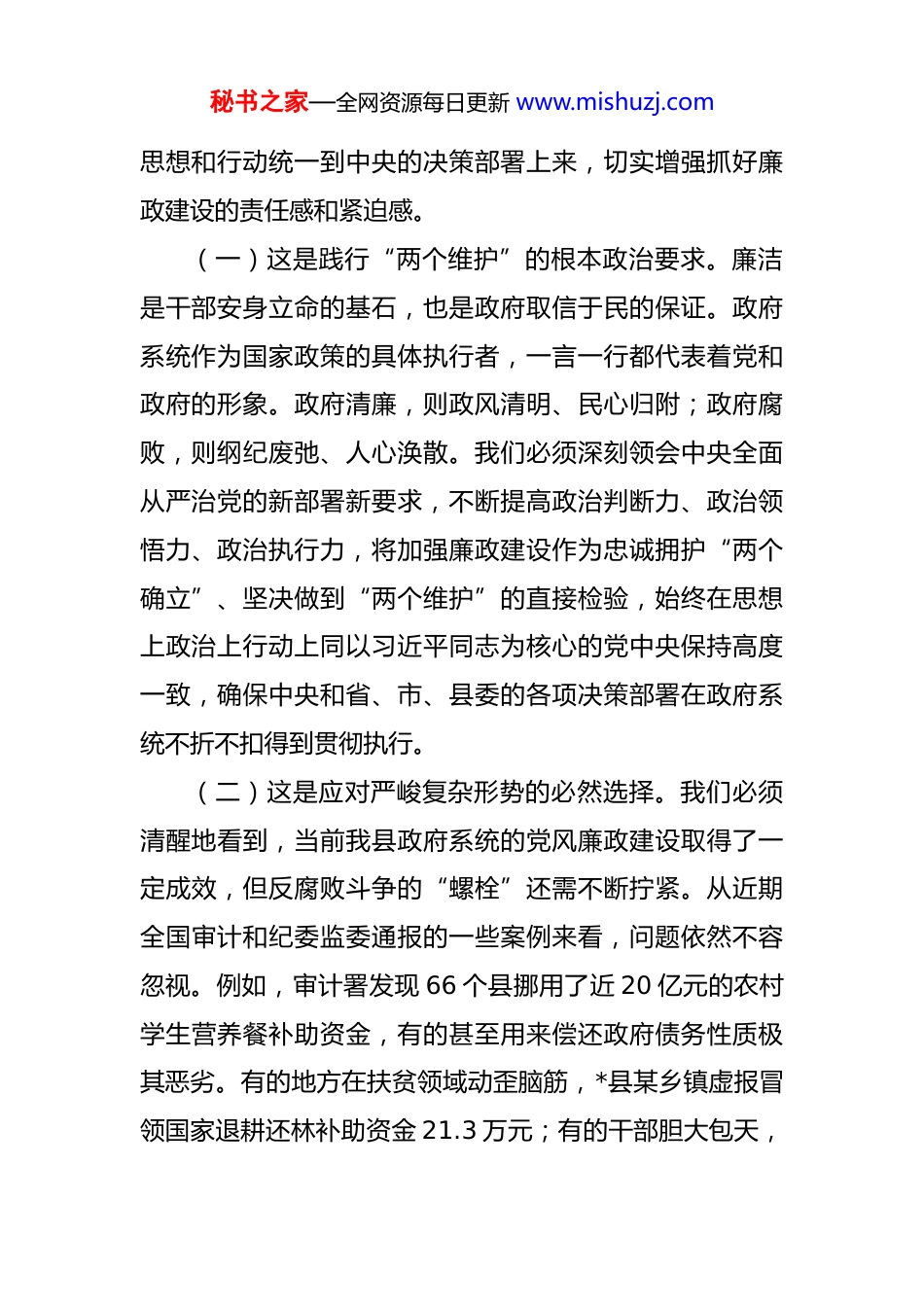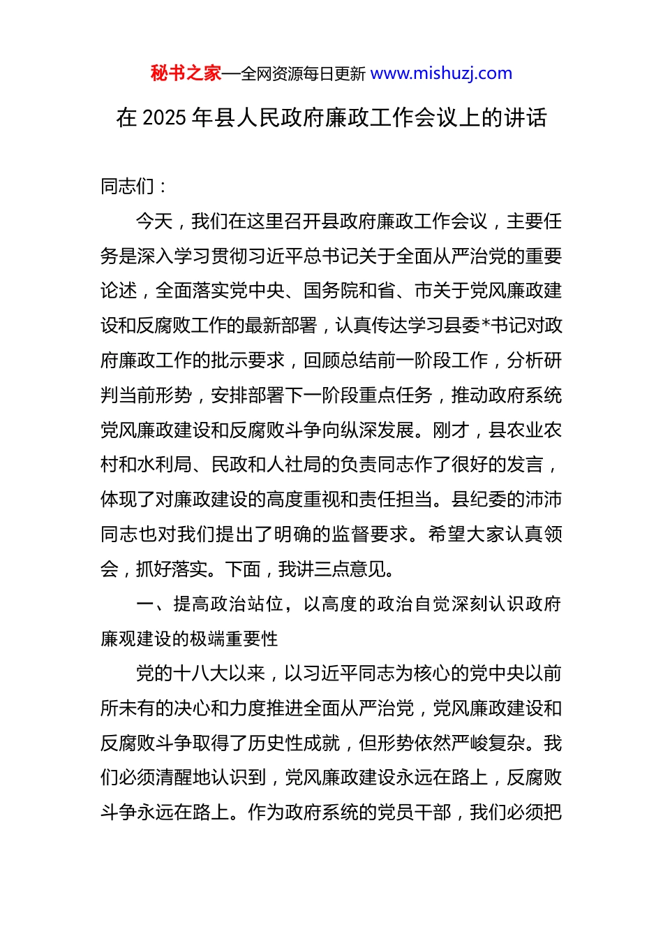 秘书之家—全网资源每日更新 www.mishuzj.com在 2025 年县人民政府廉政工作会议上的讲话 同志们:今天,我们在这里召开县政府廉政工作会议,主要任务是深入学习贯彻习近平总书记关于全面从严治党的重要论述,全面落实党中央、国务院和省、市关于党风廉政建设和反腐败工作的最新部署,认真传达学习县委*书记对政府廉政工作的批示要求,回顾总结前一阶段工作,分析研判当前形势,安排部署下一阶段重点任务,推动政府系统党风廉政建设和反腐败斗争向纵深发展。刚才,县农业农村和水利局、民政和人社局的负责同志作了很好的发言,体现了对廉政建设的高度重视和责任担当。县纪委的沛沛同志也对我们提出了明确的监督要求。希望大家认真领会,抓好落实。下面,我讲三点意见。一、提高政治站位,以高度的政治自觉深刻认识政府廉观建设的极端重要性党的十八大以来,以习近平同志为核心的党中央以前所未有的决心和力度推进全面从严治党,党风廉政建设和反腐败斗争取得了历史性成就,但形势依然严峻复杂。我们必须清醒地认识到,党风廉政建设永远在路上,反腐败斗争永远在路上。作为政府系统的党员干部,我们必须把秘书之家—全网资源每日更新 www.mishuzj.com思想和行动统一到中央的决策部署上来,切实增强抓好廉政建设的责任感和紧迫感。(一)这是践行“两个维护”的根本政治要求。廉洁是干部安身立命的基石,也是政府取信于民的保证。政府系统作为国家政策的具体执行者,一言一行都代表着党和政府的形象。政府清廉,则政风清明、民心归附;政府腐败,则纲纪废弛、人心涣散。我们必须深刻领会中央全面从严治党的新部署新要求,不断提高政治判断力、政治领悟力、政治执行力,将加强廉政建设作为忠诚拥护“两个确立”、坚决做到“两个维护”的直接检验,始终在思想上政治上行动上同以习近平同志为核心的党中央保持高度一致,确保中央和省、市、县委的各项决策部署在政府系统不折不扣得到贯彻执行。(二)这是应对严峻复杂形势的必然选择。我们必须清醒地看到,当前我县政府系统的党风廉政建设取得了一定成效,但反腐败斗争的“螺栓”还需不断拧紧。从近期全国审计和纪委监委通报的一些案例来看,问题依然不容忽视。例如,审计署发现 66 个县挪用了近 20 亿元的农村学生营养餐补助资金,有的甚至用来偿还政府债务性质极其恶劣。有的地方在扶贫领域动歪脑筋,*县某乡镇虚报冒领国家退耕还林补助资金 21.3 万元;有的干部胆大包天,秘书之家—全网资源每日更新 www.mishuzj.com*县财政局干部挪用公款高达 212 万元用于网络赌博。这些发生在群众身边、重点领域的腐败问题,严重损害了群众的切身利益,侵蚀了党和政府的公信力。我们必须深刻吸取教训,举一反三,警钟长鸣。县委*书记在最新的批示中也特别强调,全县政府系统要深刻认识廉政建设的严峻性、复杂性,坚持问题导向,敢于动真碰硬。我们决不能有丝毫的麻痹和松懈,必须以“零容忍”的态度惩治腐败,一体推进不敢腐、不能腐、不想腐的长效机制。(三)这是推动高质量发展的坚实保障。当前,我县正处于转型升级、追赶超越的关键时期,各项改革发展任务十分繁重。越是任务艰巨,越需要风清气正的政治生态和廉洁高效的政务环境。一个地方的发展环境好不好,廉洁是重要的软实力和核心竞争力。如果权力寻租、吃拿卡要等现象滋生蔓延,就会严重破坏营商环境,挫伤市场主体信心,最终制约经济社会发展。今年以来,县纪委监委围绕优化营商环境开展了多轮专项监督,有力推动了相关问题的解决。我们必须深刻认识到,抓廉政就是抓发展,抓作风就是抓环境。要把全面从严治党要求贯穿到政府工作和自身建设的各方面、全过程,以严的基调、严的措施、严的氛围,为全县高质量发展保驾护航,确保我们既能干成事,又能不出事。秘书之家—全网资源每日更新 www.mishuzj.com二、聚焦关键领域,以更严的制度标准持续规范权力运行习近平总书记强 调,要“把权力关进制度的笼子里”。政府是公共权利的重要行使主体,掌握着大量的资金、项目、资源。这些领域是廉政风险的高发区,也是我们监督管理的重中之重。我们必须紧盯重点领域和关键环节,扎...