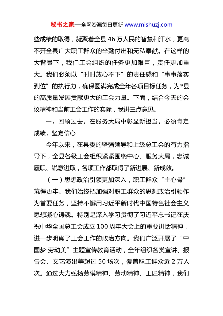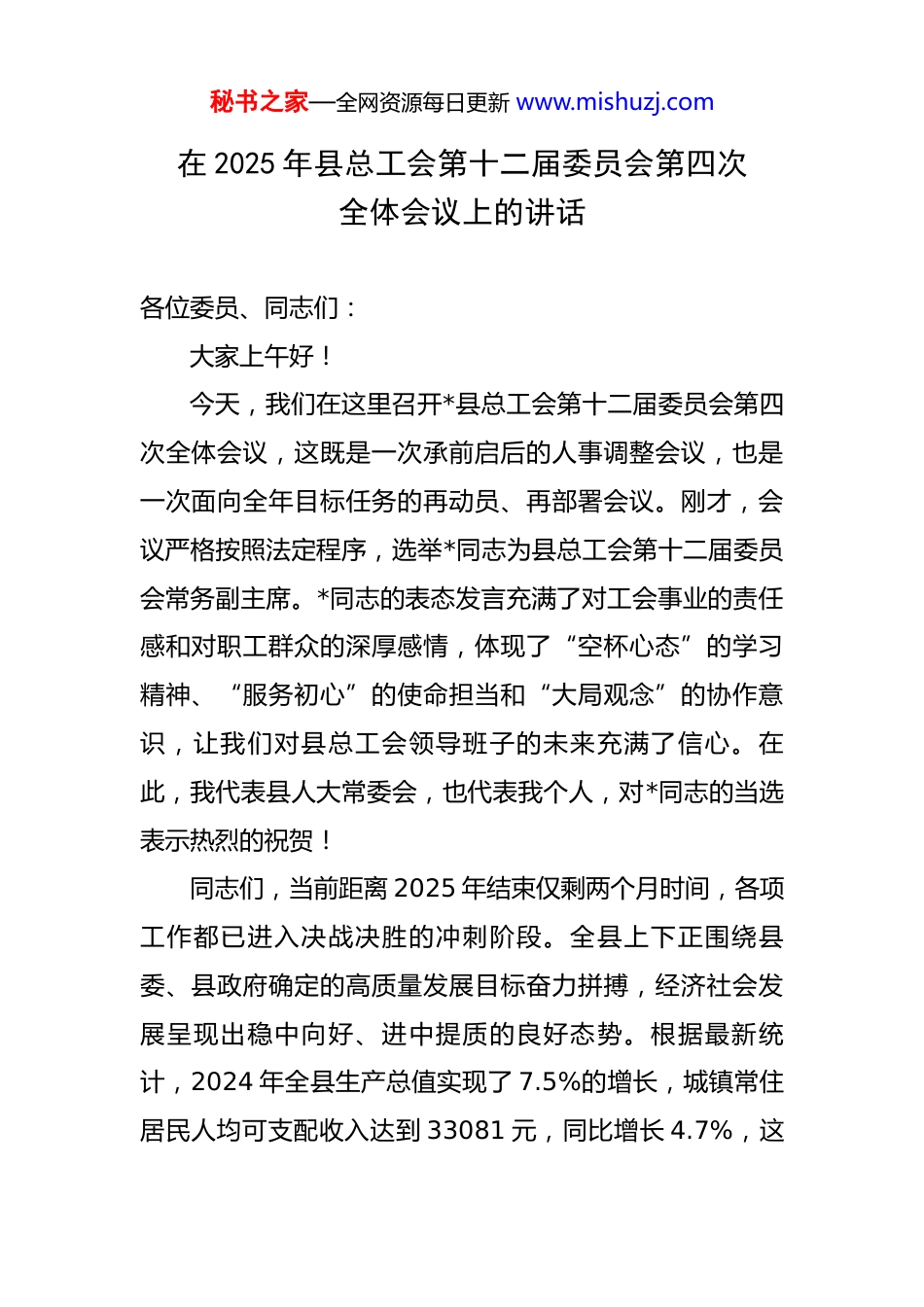 秘书之家—全网资源每日更新 www.mishuzj.com在 2025 年县总工会第十二届委员会第四次全体会议上的讲话 各位委员、同志们:大家上午好!今天,我们在这里召开*县总工会第十二届委员会第四次全体会议,这既是一次承前启后的人事调整会议,也是一次面向全年目标任务的再动员、再部署会议。刚才,会议严格按照法定程序,选举*同志为县总工会第十二届委员会常务副主席。*同志的表态发言充满了对工会事业的责任感和对职工群众的深厚感情,体现了“空杯心态”的学习精神、“服务初心”的使命担当和“大局观念”的协作意识,让我们对县总工会领导班子的未来充满了信心。在此,我代表县人大常委会,也代表我个人,对*同志的当选表示热烈的祝贺!同志们,当前距离 2025 年结束仅剩两个月时间,各项工作都已进入决战决胜的冲刺阶段。全县上下正围绕县委、县政府确定的高质量发展目标奋力拼搏,经济社会发展呈现出稳中向好、进中提质的良好态势。根据最新统计,2024 年全县生产总值实现了 7.5%的增长,城镇常住居民人均可支配收入达到 33081 元,同比增长 4.7%,这秘书之家—全网资源每日更新 www.mishuzj.com些成绩的取得,凝聚着全县 46 万人民的智慧和汗水,更离不开全县广大职工群众的辛勤付出和无私奉献。在这样的大背景下,我们工会组织的任务更加艰巨,责任更加重大。我们必须以“时时放心不下”的责任感和“事事落实到位”的执行力,确保圆满完成全年各项目标任务,为*县的高质量发展贡献更大的工会力量。下面,结合今天的会议精神和当前工会工作的实际,我讲三点意见。一、回顾过去,在服务大局中彰显新担当,必须肯定成绩、坚定信心今年以来,在县委的坚强领导和上级总工会的有力指导下,全县各级工会组织紧紧围绕中心、服务大局,忠诚履职、锐意进取,各项工作都取得了新进展、新成效。(一)思想政治引领更加深入,职工群众“主心骨”筑得更牢。我们始终把加强对职工群众的思想政治引领作为首要任务,坚持不懈用习近平新时代中国特色社会主义思想凝心铸魂。特别是深入学习贯彻了习近平总书记在庆祝中华全国总工会成立 100 周年大会上的重要讲话精神,进一步明确了工会工作的政治方向。我们广泛开展了“中国梦·劳动美”主题宣传教育活动,全年组织各类宣讲、报告会、文艺演出等超过 50 场次,覆盖职工群众近 2 万人次。通过大力弘扬劳模精神、劳动精神、工匠精神,我们秘书之家—全网资源每日更新 www.mishuzj.com成功创建了 3 个市级劳模和工匠人才创新工作室,评选表彰了“*工匠”20 名,在全社会营造了劳动光荣、知识崇高、人才宝贵、创造伟大的浓厚氛围,有效引导了广大职工坚定不移听党话、矢志不渝跟党走。(二)围绕中心、服务大局更加有为,助推发展“主力军”作用显现得更亮。我们主动将工会工作融入全县经济社会发展大局,围绕重点项目、重点产业,广泛开展了多种形式的劳动和技能竞赛。例如,我们联合相关部门,成功举办了现代农业、绿色制造、文旅康养等领域的 15 场县级职工职业技能大赛,超过 3000 名一线职工在赛场上切磋技艺、展示风采,有力激发了广大职工的劳动热情和创造潜能。我们积极响应中央和省市关于深化产业工人队伍建设改革的号召,深入企业开展调研,协助两家龙头企业制定了产业工人技能提升和职业发展规划,为打造一支知识型、技能型、创新型劳动者大军进行了有益探索,为全县经济高质量发展注入了强劲的工匠动力。(三)维权服务主责主业更加聚焦,服务职工“娘家人”形象树得更实。我们始终把维护职工合法权益、竭诚服务职工群众作为工会工作的出发点和落脚点。在构建和谐劳动关系方面,我们加大了劳动争议调处力度,全年共受理劳动争议案件 120 余起,调解成功率达到 95%以上,秘书之家—全网资源每日更新 www.mishuzj.com有效维护了职工队伍的稳定。在帮扶救助困难职工方面,我们持续深化“送温暖”等品牌活动,全年累计发放各类帮扶资金超过 120 万元,为 600 多户困难职工家庭解了燃眉之急;“金秋助学”活动帮助了 150 名困难职工子女圆了大学梦。尤其值得肯定的是,我们高度关注新就业形态劳动者群体...