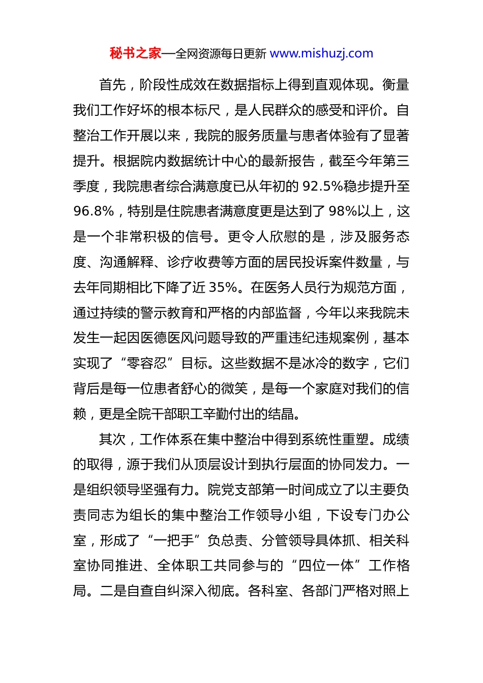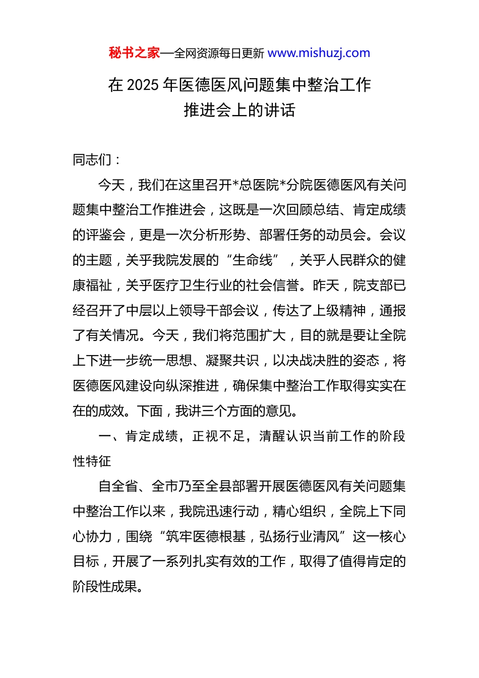 秘书之家—全网资源每日更新 www.mishuzj.com在 2025 年医德医风问题集中整治工作推进会上的讲话 同志们:今天,我们在这里召开*总医院*分院医德医风有关问题集中整治工作推进会,这既是一次回顾总结、肯定成绩的评鉴会,更是一次分析形势、部署任务的动员会。会议的主题,关乎我院发展的“生命线”,关乎人民群众的健康福祉,关乎医疗卫生行业的社会信誉。昨天,院支部已经召开了中层以上领导干部会议,传达了上级精神,通报了有关情况。今天,我们将范围扩大,目的就是要让全院上下进一步统一思想、凝聚共识,以决战决胜的姿态,将医德医风建设向纵深推进,确保集中整治工作取得实实在在的成效。下面,我讲三个方面的意见。一、肯定成绩,正视不足,清醒认识当前工作的阶段性特征自全省、全市乃至全县部署开展医德医风有关问题集中整治工作以来,我院迅速行动,精心组织,全院上下同心协力,围绕“筑牢医德根基,弘扬行业清风”这一核心目标,开展了一系列扎实有效的工作,取得了值得肯定的阶段性成果。秘书之家—全网资源每日更新 www.mishuzj.com首先,阶段性成效在数据指标上得到直观体现。衡量我们工作好坏的根本标尺,是人民群众的感受和评价。自整治工作开展以来,我院的服务质量与患者体验有了显著提升。根据院内数据统计中心的最新报告,截至今年第三季度,我院患者综合满意度已从年初的 92.5%稳步提升至96.8%,特别是住院患者满意度更是达到了 98%以上,这是一个非常积极的信号。更令人欣慰的是,涉及服务态度、沟通解释、诊疗收费等方面的居民投诉案件数量,与去年同期相比下降了近 35%。在医务人员行为规范方面,通过持续的警示教育和严格的内部监督,今年以来我院未发生一起因医德医风问题导致的严重违纪违规案例,基本实现了“零容忍”目标。这些数据不是冰冷的数字,它们背后是每一位患者舒心的微笑,是每一个家庭对我们的信赖,更是全院干部职工辛勤付出的结晶。其次,工作体系在集中整治中得到系统性重塑。成绩的取得,源于我们从顶层设计到执行层面的协同发力。一是组织领导坚强有力。院党支部第一时间成立了以主要负责同志为组长的集中整治工作领导小组,下设专门办公室,形成了“一把手”负总责、分管领导具体抓、相关科室协同推进、全体职工共同参与的“四位一体”工作格局。二是自查自纠深入彻底。各科室、各部门严格对照上秘书之家—全网资源每日更新 www.mishuzj.com级通报的督查情况和整治任务清单,坚持问题导向,开展了多轮“地毯式”的自我排查。从“大处方、泛耗材”等关键环节,到“院前待诊、院后随访”等服务末梢,不留死角、不留盲区,建立问题台账,明确整改时限和责任人,实现了闭环管理。三是制度体系日趋完善。我们结合新形势新要求,对院内《医疗核心制度》《医务人员行为规范》《“九不准”实施细则》等 20 余项规章制度进行了修订和完善,特别是将医德医风考评结果与职称晋升、评先评优、绩效分配等硬性指标直接挂钩,让制度“长出牙齿”,真正起到了约束和激励的双重作用。再者,队伍建设在整治过程中实现质的飞跃。一方面,我们注重加强医务人员的职业道德教育,通过定期开展医德医风专题培训、邀请行业专家举办讲座、组织观看警示教育片等多种形式,不断提升医务人员的职业操守和道德水平。广大医务人员从内心深处认识到医德医风建设的重要性,自觉遵守行业规范,主动提升服务质量。另一方面,积极鼓励医务人员参加各类学术交流和业务培训活动,为他们提供广阔的发展空间和学习机会。今年以来,我院多名医务人员在省级、国家级学术会议上发表演讲,展示了专业风采;还有部分医务人员通过进修学习,掌握了新的诊疗技术和方法,并将其应用到临床实践中,为患秘书之家—全网资源每日更新 www.mishuzj.com者提供了更加优质、高效的医疗服务。同时,我们还建立了科学合理的人才激励机制,对表现优秀、医德高尚的医务人员给予表彰和奖励,激发了全体医务人员的工作积极性和主动性。在肯定成绩的同时,我们更要清醒地认识到,医德医风建设是一项长期而艰巨的系统工程,绝非一朝一夕之功,更不可能一劳永逸。从市、县两级卫健委最...