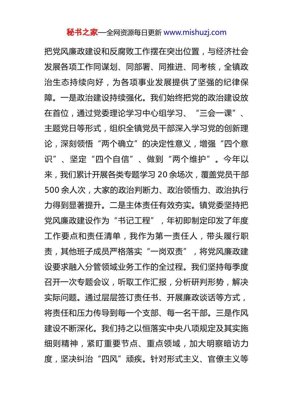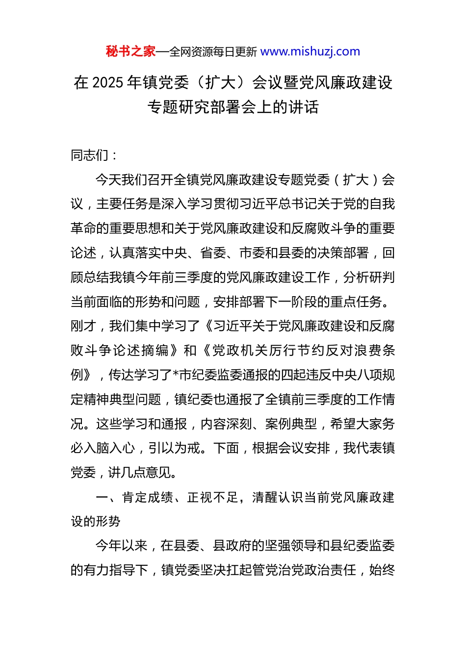 秘书之家—全网资源每日更新 www.mishuzj.com在 2025 年镇党委(扩大)会议暨党风廉政建设专题研究部署会上的讲话 同志们:今天我们召开全镇党风廉政建设专题党委(扩大)会议,主要任务是深入学习贯彻习近平总书记关于党的自我革命的重要思想和关于党风廉政建设和反腐败斗争的重要论述,认真落实中央、省委、市委和县委的决策部署,回顾总结我镇今年前三季度的党风廉政建设工作,分析研判当前面临的形势和问题,安排部署下一阶段的重点任务。刚才,我们集中学习了《习近平关于党风廉政建设和反腐败斗争论述摘编》和《党政机关厉行节约反对浪费条例》,传达学习了*市纪委监委通报的四起违反中央八项规定精神典型问题,镇纪委也通报了全镇前三季度的工作情况。这些学习和通报,内容深刻、案例典型,希望大家务必入脑入心,引以为戒。下面,根据会议安排,我代表镇党委,讲几点意见。一、肯定成绩、正视不足,清醒认识当前党风廉政建设的形势今年以来,在县委、县政府的坚强领导和县纪委监委的有力指导下,镇党委坚决扛起管党治党政治责任,始终秘书之家—全网资源每日更新 www.mishuzj.com把党风廉政建设和反腐败工作摆在突出位置,与经济社会发展各项工作同谋划、同部署、同推进、同考核,全镇政治生态持续向好,为各项事业发展提供了坚强的纪律保障。一是政治建设持续强化。我们始终把党的政治建设放在首位,通过党委理论学习中心组学习、“三会一课”、主题党日等形式,组织全镇党员干部深入学习党的创新理论,深刻领悟“两个确立”的决定性意义,增强“四个意识”、坚定“四个自信”、做到“两个维护”。今年以来,我们累计开展各类专题学习 20 余场次,覆盖党员干部500 余人次,大家的政治判断力、政治领悟力、政治执行力得到显著提升。二是主体责任有效夯实。镇党委坚持把党风廉政建设作为“书记工程”,年初即制定印发了年度工作要点和责任清单,我作为第一责任人,带头履行职责,其他班子成员严格落实“一岗双责”,将党风廉政建设要求融入分管领域业务工作的全过程。我们坚持每季度召开一次专题会议,听取工作汇报,分析研判形势,解决实际问题。通过层层签订责任书、开展廉政谈话等方式,将责任和压力传导到每一个支部、每一名干部。三是作风建设不断深化。我们持之以恒落实中央八项规定及其实施细则精神,紧盯重要节点、重点领域,加大明察暗访力度,坚决纠治“四风”顽疾。针对形式主义、官僚主义等秘书之家—全网资源每日更新 www.mishuzj.com突出问题,我们大力精简文件会议,优化工作流程,推动干部下沉一线解决实际问题。通过持续整治,公款吃喝、公车私用等歪风得到有效遏制,干部队伍干事创业的精气神得到进一步提振。四是监督执纪精准有力。镇纪委聚焦主责主业,充分运用监督执纪“四种形态”,抓早抓小、防微杜渐。今年前三季度,我们共收到问题线索 3 件,已全部办结;立案查处了 2 起违纪案件,给予党纪政务处分 2人次,起到了有力的震慑作用。同时,我们高度重视上级巡视巡察和各类监督检查反馈问题的整改工作,建立问题台账、明确整改时限、落实责任到人,确保件件有着落、事事有回音。截至目前,相关问题的整改完成率达到 99%以上。在肯定成绩的同时,我们必须清醒地看到,与新时代新征程对全面从严治党提出的更高要求相比,与人民群众的期盼相比,我镇的党风廉政建设和反腐败工作还存在一些不容忽视的问题和薄弱环节。一是个别干部的思想认识仍有偏差。有的同志认为党风廉政建设是纪委的事,与自己关系不大,存在“说起来重要、做起来次要、忙起来不要”的现象;有的班子成员履行“一岗双责”的意识不强,对分管领域的干部疏于教育、管理和监督,“重业务、轻廉政”的问题依然存在。二是“四风”问题具有顽秘书之家—全网资源每日更新 www.mishuzj.com固性和反复性。从刚才通报的案例以及我们日常监督发现的情况看,“不吃公款吃老板”、违规收送礼品礼金、借操办婚丧喜庆之机敛财等隐形变异问题仍时有发生。一些干部服务群众的态度依然生硬、效率不高,门好进、脸好看,但事情依然难办,这实质上是官僚主义的新变种。三是群众身边的“微...
