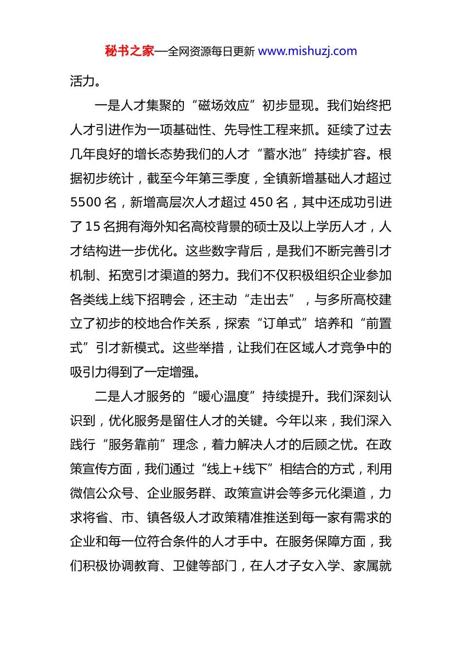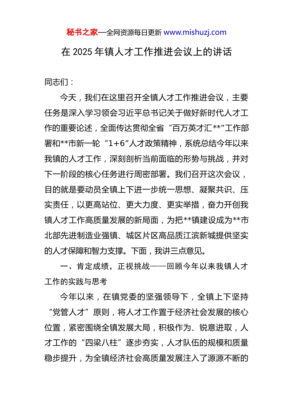 秘书之家—全网资源每日更新 www.mishuzj.com在 2025 年镇人才工作推进会议上的讲话 同志们:今天,我们在这里召开全镇人才工作推进会议,主要任务是深入学习领会习近平总书记关于做好新时代人才工作的重要论述,全面传达贯彻全省“百万英才汇**”工作部署和**市新一轮“1+6”人才政策精神,系统总结今年以来我镇的人才工作,深刻剖析当前面临的形势与挑战,并对下一阶段的核心任务进行周密部署。我们召开这次会议,目的就是要动员全镇上下进一步统一思想、凝聚共识、压实责任,以更高站位、更大力度、更实举措,奋力开创我镇人才工作高质量发展的新局面,为把**镇建设成为**市北部先进制造业强镇、城区片区高品质江滨新城提供坚实的人才保障和智力支撑。下面,我讲三点意见。一、肯定成绩,正视挑战——回顾今年以来我镇人才工作的实践与思考今年以来,在镇党委的坚强领导下,全镇上下坚持“党管人才”原则,将人才工作置于经济社会发展的核心位置,紧密围绕全镇发展大局,积极作为、锐意进取,人才工作的“四梁八柱”逐步夯实,人才队伍的规模和质量稳步提升,为全镇经济社会高质量发展注入了源源不断的秘书之家—全网资源每日更新 www.mishuzj.com活力。一是人才集聚的“磁场效应”初步显现。我们始终把人才引进作为一项基础性、先导性工程来抓。延续了过去几年良好的增长态势我们的人才“蓄水池”持续扩容。根据初步统计,截至今年第三季度,全镇新增基础人才超过5500 名,新增高层次人才超过 450 名,其中还成功引进了 15 名拥有海外知名高校背景的硕士及以上学历人才,人才结构进一步优化。这些数字背后,是我们不断完善引才机制、拓宽引才渠道的努力。我们不仅积极组织企业参加各类线上线下招聘会,还主动“走出去”,与多所高校建立了初步的校地合作关系,探索“订单式”培养和“前置式”引才新模式。这些举措,让我们在区域人才竞争中的吸引力得到了一定增强。二是人才服务的“暖心温度”持续提升。我们深刻认识到,优化服务是留住人才的关键。今年以来,我们深入践行“服务靠前”理念,着力解决人才的后顾之忧。在政策宣传方面,我们通过“线上+线下”相结合的方式,利用微信公众号、企业服务群、政策宣讲会等多元化渠道,力求将省、市、镇各级人才政策精准推送到每一家有需求的企业和每一位符合条件的人才手中。在服务保障方面,我们积极协调教育、卫健等部门,在人才子女入学、家属就秘书之家—全网资源每日更新 www.mishuzj.com医等方面提供绿色通道和便利服务,努力营造“拴心留人”的优良环境。镇人才工作专班的同志们主动上门为企业和人才答疑解惑,这种“店小二”式的服务精神,赢得了不少企业和人才的认可。三是人才发展的“生态环境”不断优化。我们坚持以产业发展集聚人才,以平台建设承载人才。紧扣**镇作为全省“百千万工程”典型镇的定位,我们加快推进了一批重点产业项目和“工改工”项目建设,如**第二工业区“工改工”项目、**智能物流装备研发及制造基地项目等这些高质量的产业载体为人才施展才华提供了广阔的舞台。同时,我们鼓励企业加大研发投入,建立技术中心和研发平台,支持有条件的企业申报博士工作站,为高层次人才的科研创新活动创造条件。通过举办“技能照亮前程”等青年人才交流活动,我们为各类人才搭建了交流思想、碰撞智慧的平台,镇域内的创新创业氛围日益浓厚。在肯定成绩的同时,我们更要清醒地看到工作中存在的短板和不足。对标上级的要求、对标发达地区的先进经验、对标我镇高质量发展的现实需求,我们的工作还有不小的差距。主要体现在以下几个方面:第一,政策落地的“最后一公里”仍未完全打通。尽管省、市层面出台了一系列含金量高、吸引力强的人才政秘书之家—全网资源每日更新 www.mishuzj.com策,但在我镇的传导和落地过程中,仍然存在“中梗阻”现象。部分企业对政策不了解、不熟悉,不知道如何申报;部分人才感觉政策“看得见、摸不着”,申请流程较为繁琐,政策的知晓度和覆盖面有待进一步提升,政策红利未能完全转化为发展实效。第二,人才队伍的“结构性矛盾”依然比较突出。从总量上看,我们的人才队伍在...