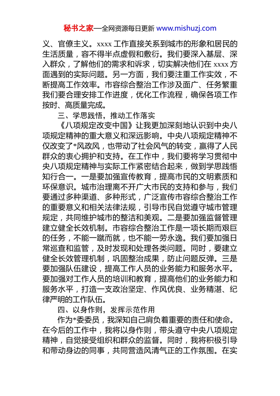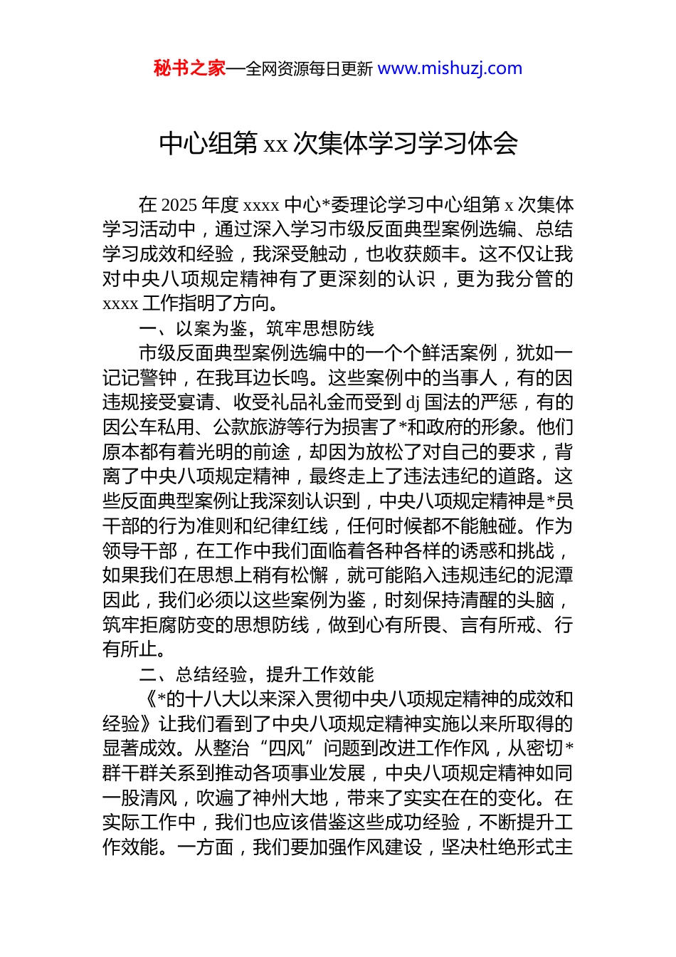 秘书之家—全网资源每日更新 www.mishuzj.com中心组第 xx 次集体学习学习体会在 2025 年度 xxxx 中心*委理论学习中心组第 x 次集体学习活动中,通过深入学习市级反面典型案例选编、总结学习成效和经验,我深受触动,也收获颇丰。这不仅让我对中央八项规定精神有了更深刻的认识,更为我分管的xxxx 工作指明了方向。一、以案为鉴,筑牢思想防线市级反面典型案例选编中的一个个鲜活案例,犹如一记记警钟,在我耳边长鸣。这些案例中的当事人,有的因违规接受宴请、收受礼品礼金而受到 dj 国法的严惩,有的因公车私用、公款旅游等行为损害了*和政府的形象。他们原本都有着光明的前途,却因为放松了对自己的要求,背离了中央八项规定精神,最终走上了违法违纪的道路。这些反面典型案例让我深刻认识到,中央八项规定精神是*员干部的行为准则和纪律红线,任何时候都不能触碰。作为领导干部,在工作中我们面临着各种各样的诱惑和挑战,如果我们在思想上稍有松懈,就可能陷入违规违纪的泥潭因此,我们必须以这些案例为鉴,时刻保持清醒的头脑,筑牢拒腐防变的思想防线,做到心有所畏、言有所戒、行有所止。二、总结经验,提升工作效能《*的十八大以来深入贯彻中央八项规定精神的成效和经验》让我们看到了中央八项规定精神实施以来所取得的显著成效。从整治“四风”问题到改进工作作风,从密切*群干群关系到推动各项事业发展,中央八项规定精神如同一股清风,吹遍了神州大地,带来了实实在在的变化。在实际工作中,我们也应该借鉴这些成功经验,不断提升工作效能。一方面,我们要加强作风建设,坚决杜绝形式主秘书之家—全网资源每日更新 www.mishuzj.com义、官僚主义。xxxx 工作直接关系到城市的形象和居民的生活质量,容不得半点虚假和敷衍。我们要深入基层、深入群众,了解他们的需求和诉求,切实解决他们在 xxxx 方面遇到的实际问题。另一方面,我们要注重工作实效,不断提高工作效率。市容综合整治工作涉及面广、任务繁重我们要合理安排工作进度,优化工作流程,确保各项工作按时、高质量完成。三、学思践悟,推动工作落实《八项规定改变中国》让我更加深刻地认识到中央八项规定精神的重大意义和深远影响。中央八项规定精神不仅改变了*风政风,也带动了社会风气的转变,赢得了人民群众的衷心拥护和支持。在工作中,我们要将学习贯彻中央八项规定精神与实际工作紧密结合起来,做到学思践悟知行合一。一是要加强宣传教育,提高市民的文明素质和环保意识。城市治理离不开广大市民的支持和参与,我们要通过多种渠道、多种形式,广泛宣传市容综合整治工作的重要意义和相关法律法规,引导市民自觉遵守城市管理规定,共同维护城市的整洁和美观。二是要加强监督管理建立健全长效机制。市容综合整治工作是一项长期而艰巨的任务,不能一蹴而就,也不能一劳永逸。我们要加强日常巡查和监管,及时发现和处理各类问题。同时,要建立健全长效管理机制,巩固整治成果,防止问题反弹。三是要加强队伍建设,提高工作人员的业务能力和服务水平。要加强对工作人员的培训和教育,提高他们的业务能力和服务水平,打造一支政治坚定、作风优良、业务精湛、纪律严明的工作队伍。四、以身作则,发挥示范作用作为*委委员,我深知自己肩负着重要的责任和使命。在今后的工作中,我将以身作则,带头遵守中央八项规定精神,自觉接受组织和群众的监督。同时,我将积极引导和带动身边的同事,共同营造风清气正的工作氛围。在实秘书之家—全网资源每日更新 www.mishuzj.com际工作中,我将以更加饱满的热情、更加严谨的态度、更加务实的作风,投入到工作中去。我将深入一线,了解工作进展情况,及时解决工作中遇到的问题。我将加强与相关部门的沟通协调,形成工作合力,共同推进市容综合整治工作取得新的成效。总之,通过本次学习,我深刻认识到中央八项规定精神的重要性和紧迫性。在今后的工作中,我将以中央八项规定精神为指引,不断加强自身建设,提高工作水平,为推动 xxxx 工作再上新台阶贡献自己的力量。