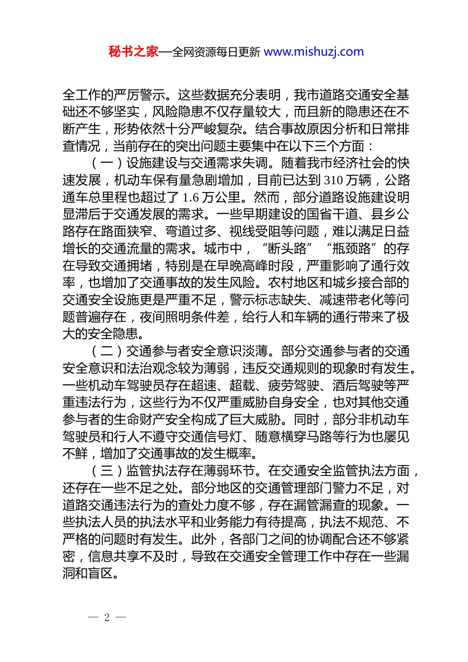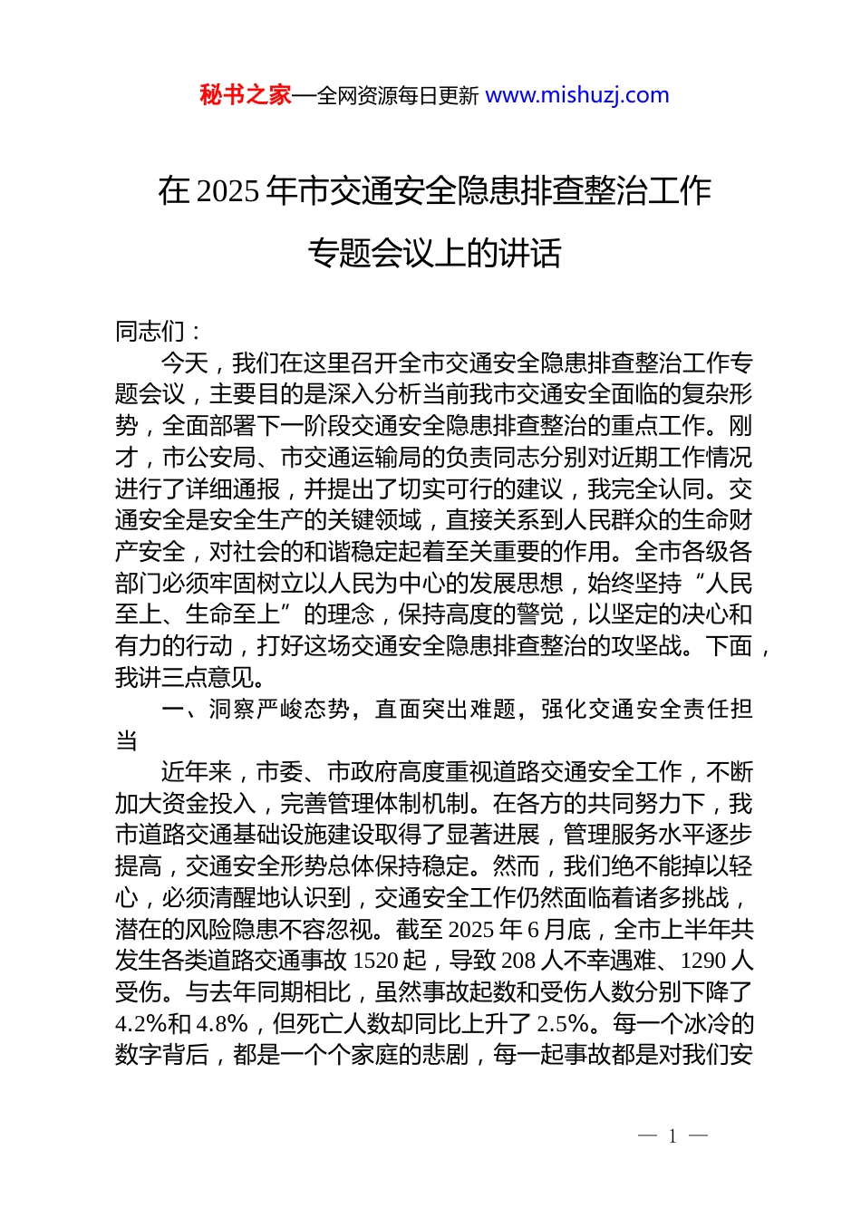 秘书之家—全网资源每日更新 www.mishuzj.com在 2025 年市交通安全隐患排查整治工作专题会议上的讲话同志们:今天,我们在这里召开全市交通安全隐患排查整治工作专题会议,主要目的是深入分析当前我市交通安全面临的复杂形势,全面部署下一阶段交通安全隐患排查整治的重点工作。刚才,市公安局、市交通运输局的负责同志分别对近期工作情况进行了详细通报,并提出了切实可行的建议,我完全认同。交通安全是安全生产的关键领域,直接关系到人民群众的生命财产安全,对社会的和谐稳定起着至关重要的作用。全市各级各部门必须牢固树立以人民为中心的发展思想,始终坚持“人民至上、生命至上”的理念,保持高度的警觉,以坚定的决心和有力的行动,打好这场交通安全隐患排查整治的攻坚战。下面,我讲三点意见。一、洞察严峻态势,直面突出难题,强化交通安全责任担当近年来,市委、市政府高度重视道路交通安全工作,不断加大资金投入,完善管理体制机制。在各方的共同努力下,我市道路交通基础设施建设取得了显著进展,管理服务水平逐步提高,交通安全形势总体保持稳定。然而,我们绝不能掉以轻心,必须清醒地认识到,交通安全工作仍然面临着诸多挑战,潜在的风险隐患不容忽视。截至 2025 年 6 月底,全市上半年共发生各类道路交通事故 1520 起,导致 208 人不幸遇难、1290 人受伤。与去年同期相比,虽然事故起数和受伤人数分别下降了4.2%和 4.8%,但死亡人数却同比上升了 2.5%。每一个冰冷的数字背后,都是一个个家庭的悲剧,每一起事故都是对我们安— 1 —秘书之家—全网资源每日更新 www.mishuzj.com全工作的严厉警示。这些数据充分表明,我市道路交通安全基础还不够坚实,风险隐患不仅存量较大,而且新的隐患还在不断产生,形势依然十分严峻复杂。结合事故原因分析和日常排查情况,当前存在的突出问题主要集中在以下三个方面:(一)设施建设与交通需求失调。随着我市经济社会的快速发展,机动车保有量急剧增加,目前已达到 310 万辆,公路通车总里程也超过了 1.6 万公里。然而,部分道路设施建设明显滞后于交通发展的需求。一些早期建设的国省干道、县乡公路存在路面狭窄、弯道过多、视线受阻等问题,难以满足日益增长的交通流量的需求。城市中,“断头路”“瓶颈路”的存在导致交通拥堵,特别是在早晚高峰时段,严重影响了通行效率,也增加了交通事故的发生风险。农村地区和城乡接合部的交通安全设施更是严重不足,警示标志缺失、减速带老化等问题普遍存在,夜间照明条件差,给行人和车辆的通行带来了极大的安全隐患。(二)交通参与者安全意识淡薄。部分交通参与者的交通安全意识和法治观念较为薄弱,违反交通规则的现象时有发生。一些机动车驾驶员存在超速、超载、疲劳驾驶、酒后驾驶等严重违法行为,这些行为不仅严重威胁自身安全,也对其他交通参与者的生命财产安全构成了巨大威胁。同时,部分非机动车驾驶员和行人不遵守交通信号灯、随意横穿马路等行为也屡见不鲜,增加了交通事故的发生概率。(三)监管执法存在薄弱环节。在交通安全监管执法方面,还存在一些不足之处。部分地区的交通管理部门警力不足,对道路交通违法行为的查处力度不够,存在漏管漏查的现象。一些执法人员的执法水平和业务能力有待提高,执法不规范、不严格的问题时有发生。此外,各部门之间的协调配合还不够紧密,信息共享不及时,导致在交通安全管理工作中存在一些漏洞和盲区。— 2 —秘书之家—全网资源每日更新 www.mishuzj.com二、聚焦关键领域,细化整治举措,提升交通安全治理效能针对当前我市交通安全存在的突出问题,各级各部门要采取切实有效的措施,加大隐患排查整治力度,全面提升交通安全治理水平。(一)加强基础设施建设与改造。要加大对道路交通基础设施建设的投入,科学规划道路布局,加快打通“断头路”“瓶颈路”,优化交通组织,提高道路通行能力。对早期建设的国省干道、县乡公路进行升级改造,拓宽路面、改善弯道设计、增加视距,提高道路的安全性。加强农村地区和城乡接合部的交通安全设施建设,完善警示标志、减速带等设施,改善夜间照明条件,为群众出...