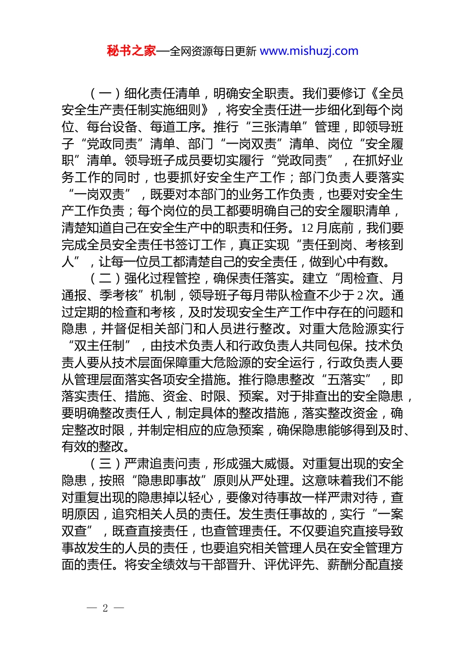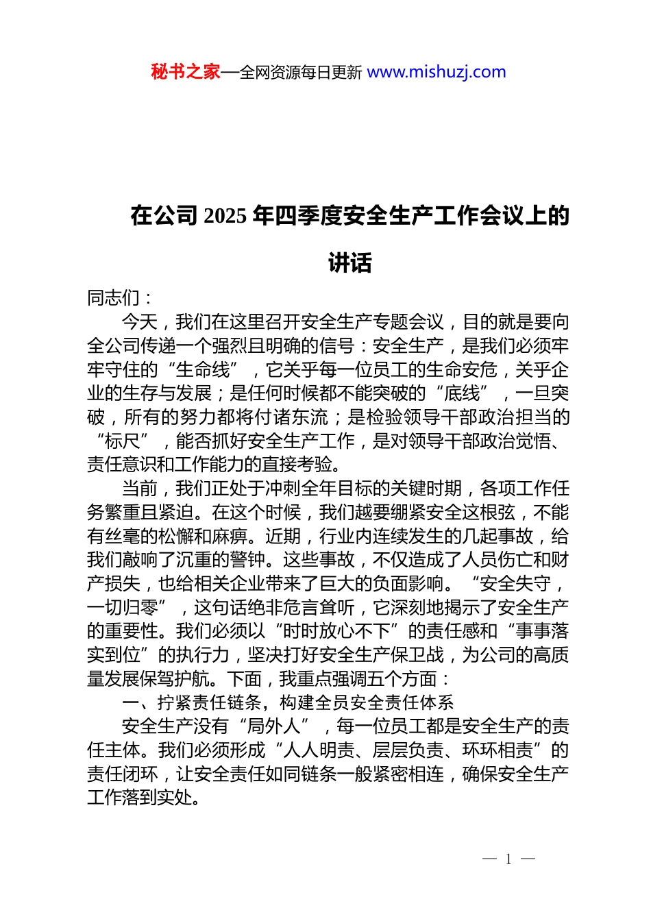 秘书之家—全网资源每日更新 www.mishuzj.com 在公司 2025 年四季度安全生产工作会议上的讲话同志们:今天,我们在这里召开安全生产专题会议,目的就是要向全公司传递一个强烈且明确的信号:安全生产,是我们必须牢牢守住的“生命线”,它关乎每一位员工的生命安危,关乎企业的生存与发展;是任何时候都不能突破的“底线”,一旦突破,所有的努力都将付诸东流;是检验领导干部政治担当的“标尺”,能否抓好安全生产工作,是对领导干部政治觉悟、责任意识和工作能力的直接考验。当前,我们正处于冲刺全年目标的关键时期,各项工作任务繁重且紧迫。在这个时候,我们越要绷紧安全这根弦,不能有丝毫的松懈和麻痹。近期,行业内连续发生的几起事故,给我们敲响了沉重的警钟。这些事故,不仅造成了人员伤亡和财产损失,也给相关企业带来了巨大的负面影响。“安全失守,一切归零”,这句话绝非危言耸听,它深刻地揭示了安全生产的重要性。我们必须以“时时放心不下”的责任感和“事事落实到位”的执行力,坚决打好安全生产保卫战,为公司的高质量发展保驾护航。下面,我重点强调五个方面:一、拧紧责任链条,构建全员安全责任体系安全生产没有“局外人”,每一位员工都是安全生产的责任主体。我们必须形成“人人明责、层层负责、环环相责”的责任闭环,让安全责任如同链条一般紧密相连,确保安全生产工作落到实处。— 1 —秘书之家—全网资源每日更新 www.mishuzj.com(一)细化责任清单,明确安全职责。我们要修订《全员安全生产责任制实施细则》,将安全责任进一步细化到每个岗位、每台设备、每道工序。推行“三张清单”管理,即领导班子“党政同责”清单、部门“一岗双责”清单、岗位“安全履职”清单。领导班子成员要切实履行“党政同责”,在抓好业务工作的同时,也要抓好安全生产工作;部门负责人要落实“一岗双责”,既要对本部门的业务工作负责,也要对安全生产工作负责;每个岗位的员工都要明确自己的安全履职清单,清楚知道自己在安全生产中的职责和任务。12 月底前,我们要完成全员安全责任书签订工作,真正实现“责任到岗、考核到人”,让每一位员工都清楚自己的安全责任,做到心中有数。(二)强化过程管控,确保责任落实。建立“周检查、月通报、季考核”机制,领导班子每月带队检查不少于 2 次。通过定期的检查和考核,及时发现安全生产工作中存在的问题和隐患,并督促相关部门和人员进行整改。对重大危险源实行“双主任制”,由技术负责人和行政负责人共同包保。技术负责人要从技术层面保障重大危险源的安全运行,行政负责人要从管理层面落实各项安全措施。推行隐患整改“五落实”,即落实责任、措施、资金、时限、预案。对于排查出的安全隐患,要明确整改责任人,制定具体的整改措施,落实整改资金,确定整改时限,并制定相应的应急预案,确保隐患能够得到及时、有效的整改。(三)严肃追责问责,形成强大威慑。对重复出现的安全隐患,按照“隐患即事故”原则从严处理。这意味着我们不能对重复出现的隐患掉以轻心,要像对待事故一样严肃对待,查明原因,追究相关人员的责任。发生责任事故的,实行“一案双查”,既查直接责任,也查管理责任。不仅要追究直接导致事故发生的人员的责任,也要追究相关管理人员在安全管理方面的责任。将安全绩效与干部晋升、评优评先、薪酬分配直接— 2 —秘书之家—全网资源每日更新 www.mishuzj.com挂钩,让安全工作成为干部考核的重要指标。通过严肃的追责问责,形成强大的威慑力,促使各级管理人员和员工切实履行安全责任。二、强化风险防控,筑牢双重预防机制我们要把隐患当事故对待,把风险当危机管控,下好先手棋、打好主动仗,做到防患于未然。(一)深化风险辨识,精准识别风险。开展第四季度全流程风险再辨识,重点排查新工艺、新设备、新环境带来的风险。随着公司业务的发展和技术的进步,新工艺、新设备、新环境不断出现,这些都可能带来新的安全风险。我们要运用 HAZOP分析法对重点装置进行系统评估,建立“红橙黄蓝”风险分布图。通过科学的分析和评估,准确识别出各个区域和设备的风险等级,为后续的风险管控...