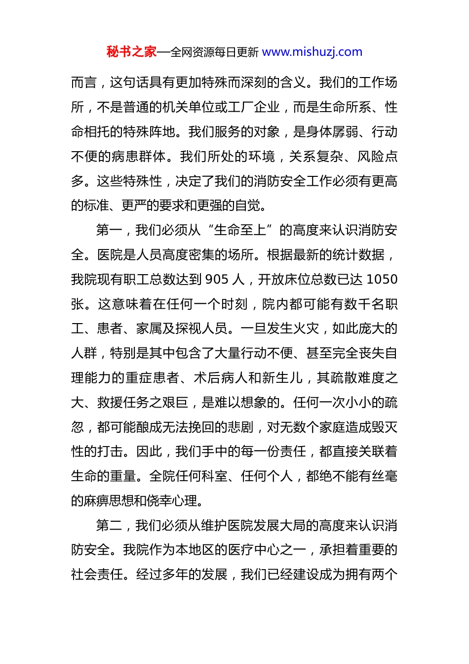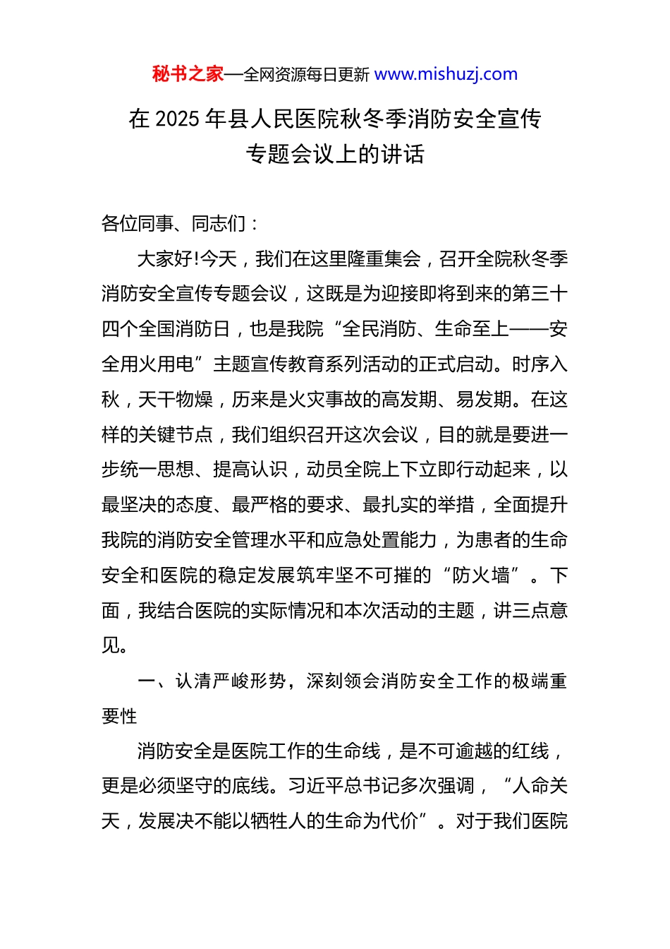 秘书之家—全网资源每日更新 www.mishuzj.com在 2025 年县人民医院秋冬季消防安全宣传专题会议上的讲话 各位同事、同志们:大家好!今天,我们在这里隆重集会,召开全院秋冬季消防安全宣传专题会议,这既是为迎接即将到来的第三十四个全国消防日,也是我院“全民消防、生命至上——安全用火用电”主题宣传教育系列活动的正式启动。时序入秋,天干物燥,历来是火灾事故的高发期、易发期。在这样的关键节点,我们组织召开这次会议,目的就是要进一步统一思想、提高认识,动员全院上下立即行动起来,以最坚决的态度、最严格的要求、最扎实的举措,全面提升我院的消防安全管理水平和应急处置能力,为患者的生命安全和医院的稳定发展筑牢坚不可摧的“防火墙”。下面,我结合医院的实际情况和本次活动的主题,讲三点意见。一、认清严峻形势,深刻领会消防安全工作的极端重要性消防安全是医院工作的生命线,是不可逾越的红线,更是必须坚守的底线。习近平总书记多次强调,“人命关天,发展决不能以牺牲人的生命为代价”。对于我们医院秘书之家—全网资源每日更新 www.mishuzj.com而言,这句话具有更加特殊而深刻的含义。我们的工作场所,不是普通的机关单位或工厂企业,而是生命所系、性命相托的特殊阵地。我们服务的对象,是身体孱弱、行动不便的病患群体。我们所处的环境,关系复杂、风险点多。这些特殊性,决定了我们的消防安全工作必须有更高的标准、更严的要求和更强的自觉。第一,我们必须从“生命至上”的高度来认识消防安全。医院是人员高度密集的场所。根据最新的统计数据,我院现有职工总数达到 905 人,开放床位总数已达 1050张。这意味着在任何一个时刻,院内都可能有数千名职工、患者、家属及探视人员。一旦发生火灾,如此庞大的人群,特别是其中包含了大量行动不便、甚至完全丧失自理能力的重症患者、术后病人和新生儿,其疏散难度之大、救援任务之艰巨,是难以想象的。任何一次小小的疏忽,都可能酿成无法挽回的悲剧,对无数个家庭造成毁灭性的打击。因此,我们手中的每一份责任,都直接关联着生命的重量。全院任何科室、任何个人,都绝不能有丝毫的麻痹思想和侥幸心理。第二,我们必须从维护医院发展大局的高度来认识消防安全。我院作为本地区的医疗中心之一,承担着重要的社会责任。经过多年的发展,我们已经建设成为拥有两个秘书之家—全网资源每日更新 www.mishuzj.com院区,涵盖内科、外科、妇产科、儿科、重症医学科等 32个专业科室的综合性医院。我们的消化内科拥有 120 张床位,妇产科拥有 80 张床位,普外科拥有 80 张床位,重症医学科也配置了 25 张重症监护床位。这些科室的平稳运行,依赖于一个绝对安全的环境。消防安全事故的破坏力是全方位的,它不仅会直接威胁人员生命,还会瞬间摧毁我们斥巨资引进的精密医疗设备、破坏我们精心构建的诊疗环境、中断我们正常的医疗秩序,更会严重损害医院几代人辛苦积累下来的社会声誉和公信力。一个安全稳定的环境,是医院高质量发展的前提和保障。没有安全,一切发展都无从谈起。第三,我们必须从依法治院的高度来认识消防安全。《中华人民共和国消防法》国家卫健委等三部门联合发布的《医疗机构消防安全管理九项规定》以及《医疗机构消防安全管理》行业标准等一系列法律法规和技术规范,为我们划定了明确的法律红线和行为准则。这些规定不是可有可无的参考,而是必须不折不扣执行的刚性要求。落实消防安全责任制,定期开展防火检查和巡查,保障疏散通道和安全出口畅通,按规范配置和维护消防设施,组织开展消防演练和宣传教育,这些都是我们的法定职责。漠视法规,就是对人民生命财产安全的漠视;玩忽职守,必将秘书之家—全网资源每日更新 www.mishuzj.com受到法律的严惩。我们必须将法治思维贯穿于消防安全管理的全过程,做到有法必依、执法必严、违法必究。二、正视工作现状,清醒把握当前存在的成绩与不足近年来,院党委和院行政始终高度重视消防安全工作,我们持续加大投入,不断完善制度,积极开展各类安全生产检查和消防演练活动全院职工的消防安全意识和应急处置能力得到了显著提升,医院连...