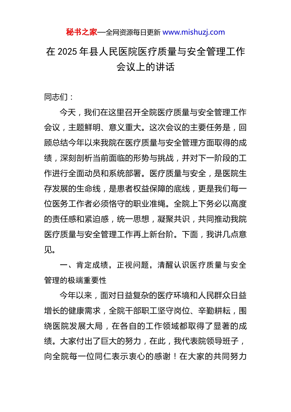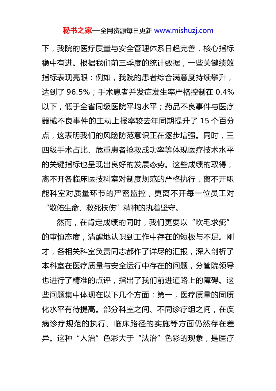 秘书之家—全网资源每日更新 www.mishuzj.com在 2025 年县人民医院医疗质量与安全管理工作会议上的讲话 同志们:今天,我们在这里召开全院医疗质量与安全管理工作会议,主题鲜明、意义重大。这次会议的主要任务是,回顾总结今年以来我院在医疗质量与安全管理方面取得的成绩,深刻剖析当前面临的形势与挑战,并对下一阶段的工作进行全面动员和系统部署。医疗质量与安全,是医院生存发展的生命线,是患者权益保障的底线,更是我们每一位医务工作者必须恪守的职业准绳。全院上下务必以高度的责任感和紧迫感,统一思想,凝聚共识,共同推动我院医疗质量与安全管理工作再上新台阶。下面,我讲几点意见。一、肯定成绩,正视问题,清醒认识医疗质量与安全管理的极端重要性今年以来,面对日益复杂的医疗环境和人民群众日益增长的健康需求,全院干部职工坚守岗位、辛勤耕耘,围绕医院发展大局,在各自的工作领域都取得了显著的成绩。大家付出了巨大的努力,在此,我代表院领导班子,向全院每一位同仁表示衷心的感谢!在大家的共同努力秘书之家—全网资源每日更新 www.mishuzj.com下,我院的医疗质量与安全管理体系日趋完善,核心指标稳中有进。根据我们前三季度的统计数据,一些关键绩效指标表现亮眼:例如,我院的患者综合满意度持续攀升,达到了 96.5%;手术患者并发症发生率严格控制在 0.4%以下,低于全省同级医院平均水平;药品不良事件与医疗器械不良事件的主动上报率较去年同期提升了 15 个百分点,这表明我们的风险防范意识正在逐步增强。同时,三四级手术占比、危重患者抢救成功率等体现医疗技术水平的关键指标也呈现出良好的发展态势。这些成绩的取得,离不开各临床医技科室对制度规范的严格执行,离不开职能科室对质量环节的严密监控,更离不开每一位员工对“敬佑生命、救死扶伤”精神的执着坚守。然而,在肯定成绩的同时,我们更要以“吹毛求疵”的审慎态度,清醒地认识到工作中存在的短板与不足。刚才,各相关科室负责同志都作了详尽的汇报,深入剖析了本科室在医疗质量与安全运行中存在的问题,分管院领导也进行了精准的点评,指出了我们前进道路上的障碍。这些问题集中体现在以下几个方面:第一,医疗质量的同质化水平有待提高。部分科室之间、不同诊疗组之间,在疾病诊疗规范的执行、临床路径的实施等方面仍然存在差异。这种“人治”色彩大于“法治”色彩的现象,是医疗秘书之家—全网资源每日更新 www.mishuzj.com质量均质化的最大敌人,也是我们必须着力解决的深层次问题。第二,流程管理的精细化程度尚有差距。一些流程性指标,如患者平均住院日、术前平均等待时间等,虽然总体可控,但与行业标杆相比仍有不小的优化空间。这背后反映出的是我们的资源调配、科室协作、信息流程等方面还存在堵点和断点,服务效率未能达到最优。第三,安全管理的系统性思维仍需强化。尽管我们加大了不良事件的上报力度,但从数据分析来看,对事件根本原因的追溯(RCA)还不够深入,系统性地改进措施未能完全落地。对于患者跌倒、院内压疮、用药错误等可预防的风险事件,我们的防范体系还存在“缝隙”,未能形成真正的闭环管理。第四,患者就医体验的“痛点”依然存在。虽然我们一直在努力改善服务,但“沟通时间短、等候时间长、流程指引不清”等问题,依然是群众反映较为集中的“槽点”。这说明我们的人文关怀和主动服务意识,距离人民群众的期望还有一定距离。同志们,医疗质量与安全工作,一枝一叶总关情。任何一个微小的差错,对患者和家庭而言,都可能是 100%的伤害;任何一次安全隐患的疏忽,对医院的声誉和发展而言,都可能是颠覆性的打击。我们必须深刻认识到,抓质量就是抓发展,抓安全就是抓稳定。这项工作没有“完成时”,只有“进行时”,秘书之家—全网资源每日更新 www.mishuzj.com容不得我们有半点松懈和麻痹。全院上下必须把思想和行动统一到医院党委的决策部署上来,以“归零”的心态和“冲刺”的姿态,直面问题,迎难而上。二、聚焦重点,多措并举,全面构筑医疗质量与安全管理的坚固防线针对当前存在的问题和未来的发展要求,结合医院的“一个愿景,两个目标...