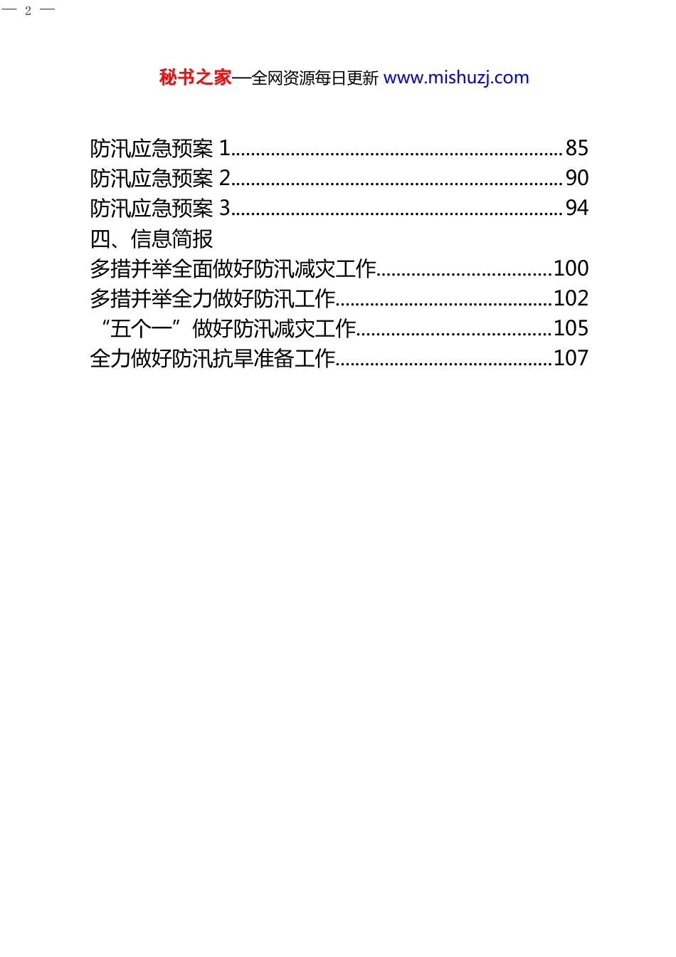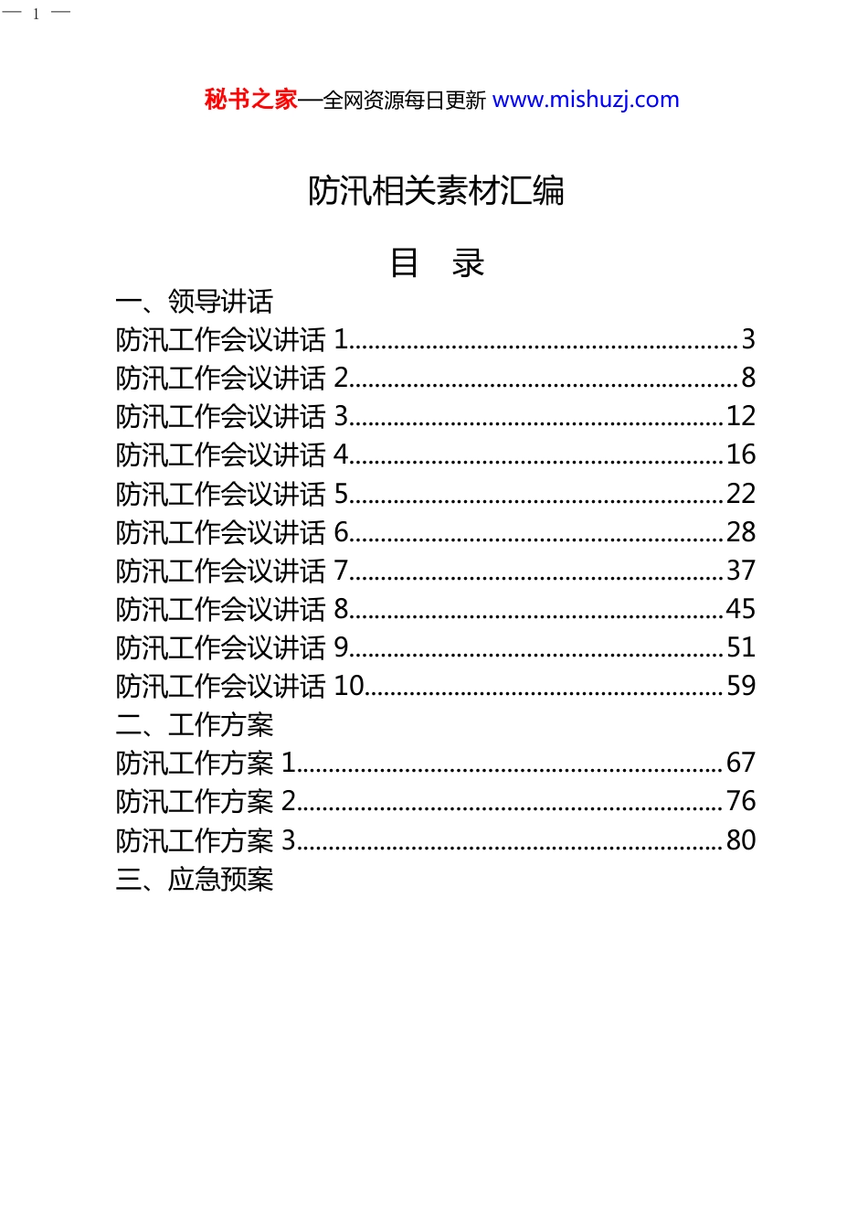 — 1 —秘书之家—全网资源每日更新 www.mishuzj.com防汛相关素材汇编目录一、领导讲话防汛工作会议讲话 1.............................................................3防汛工作会议讲话 2.............................................................8防汛工作会议讲话 3...........................................................12防汛工作会议讲话 4...........................................................16防汛工作会议讲话 5...........................................................22防汛工作会议讲话 6...........................................................28防汛工作会议讲话 7...........................................................37防汛工作会议讲话 8...........................................................45防汛工作会议讲话 9...........................................................51防汛工作会议讲话 10........................................................59二、工作方案防汛工作方案 1...................................................................67防汛工作方案 2...................................................................76防汛工作方案 3...................................................................80三、应急预案— 2 —秘书之家—全网资源每日更新 www.mishuzj.com防汛应急预案 1...................................................................85防汛应急预案 2...................................................................90防汛应急预案 3...................................................................94四、信息简报多措并举全面做好防汛减灾工作...................................100多措并举全力做好防汛工作............................................102“五个一”做好防汛减灾工作.......................................105全力做好防汛抗旱准备工作............................................107— 3 —秘书之家—全网资源每日更新 www.mishuzj.com防汛工作会议讲话 1这次会议主要任务是深入贯彻落实省委常委会议对全省防汛抗洪工作作出的部署,进一步查摆工作中存在的突出问题,下面,就切实做好当前防汛抗洪各项工作,我重点强调以下“五个到位”。一是思想准备要到位。近期,我省不确定性气候天气突出,总体表现为,天天有降雨,总量大且分布较为均匀,暴雨次数多,大江大河、水库虽然可控,但小江小河防范压力明显加大。特别是部分乡镇村屯遭受不同程度的洪涝灾害,防汛形势十分严峻。从预测分析看,今年汛期我省不排除主要江河发生较大洪水的可能,局地暴雨洪涝可能多发频发,极易因局部强降雨、 台风登陆影响等引发中小河流洪水和山洪。当前,还要注意由于前期降水较多,各地土壤水分饱和,江河水位上涨较快,水库蓄水增多,再遇强降雨极易发生灾害。“七下八上”是我省防汛的关键时间点,在七月下旬到八月上旬这个紧要时期,全省上下必须牢牢绷紧防汛抗洪这根弦,坚决克服麻痹侥幸心理, 从应对最不利气候形势和最极端天气情况出发,有备无患,不可掉以轻心,全力做好各项防御准备。二是责任落实要到位。目前,全省防汛抢险工作已进入“汛期档”,各地主要领导和分管领导要把工作重心调整到这个“档期”,要以雨情汛情为令,把“子弹上膛”,随时赶往一线, 靠前指挥,做到雨情汛情在哪里,我们的工作就在哪里。要全面落实以行政首长负责制为核心的各项责任制,要把责任目标分解到部门、落实到岗位、量化到个人,河湖长要切实担起防汛抗洪职责,做到守土有责、守土负责、守土尽责。特别要加— 4 —秘书之家—全网资源每日更新 www.mishuzj.com强农村地区、边远山区、城乡结合部、偏远旅游景点等重点部位责任落实。各级防总要发挥总指挥、总协调作用,加强应急值守,坚持领导带班、技术人员值班和 24 小时值守制度。防汛期间,市地县党政主要领导不能同时离开属地,主管领...