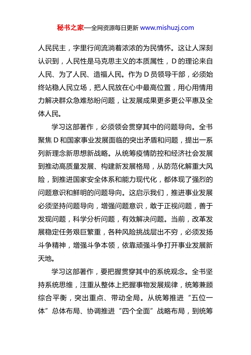 秘书之家—全网资源每日更新 www.mishuzj.comD 员领导干部在学习《习近平谈 ZHI 国理政》第五卷专题研讨会上的发言讲话材料《习近平谈 ZHI 国理政》第五卷集中展现了以习近平同志为核心的 D 中 Y 统筹中华民族伟大复兴战略全局和世界百年未有之大变局,团结带领全 D 全国各族人民迈上全面建设社会主义现代化国家新征程的伟大实践,是深入学习贯彻习近平新时代中国特色社会主义思想的权威教材。通过系统研读,深切感受到这部著作闪耀着马克思主义真理光芒,蕴含着深邃的战略思维、宽广的历史视野、深厚的人民情怀,为推动新时代 D 和国家事业发展提供了科学指引。一、深刻领悟蕴含其中的真理力量第五卷的出版,是 D 的思想理论建设的一件大事,是用 D 的创新理论武装全 D、教育人民的重要举措。这部著作贯穿着马克思主义的立场观点方法,闪耀着真理光芒,具有强大的思想伟力。学习这部著作,首先要把握贯穿其中的人民立场。全书始终坚持以人民为中心的发展思想,把人民对美好生活的向往作为奋斗目标。从强调“江山就是人民、人民就是江山”,到部署共同富裕重大战略任务,再到推进全过程秘书之家—全网资源每日更新 www.mishuzj.com人民民主,字里行间流淌着浓浓的为民情怀。这让人深刻认识到,人民性是马克思主义的本质属性,D 的理论来自人民、为了人民、造福人民。作为 D 员领导干部,必须始终站稳人民立场,把人民放在心中最高位置,用心用情用力解决群众急难愁盼问题,让发展成果更多更公平惠及全体人民。学习这部著作,必须领会贯穿其中的问题导向。全书聚焦 D 和国家事业发展面临的突出矛盾和问题,提出一系列新理念新思想新战略。从统筹疫情防控和经济社会发展到推动高质量发展、构建新发展格局,从防范化解重大风险,到推进国家安全体系和能力现代化,都体现了强烈的问题意识和鲜明的问题导向。这启示我们,推进事业发展必须坚持问题导向,增强问题意识,敢于正视问题,善于发现问题,科学分析问题,有效解决问题。当前,改革发展稳定任务艰巨繁重,各种风险挑战层出不穷,必须发扬斗争精神,增强斗争本领,依靠顽强斗争打开事业发展新天地。学习这部著作,要把握贯穿其中的系统观念。全书坚持系统思维,注重从整体上把握事物发展规律,统筹兼顾综合平衡,突出重点、带动全局。从统筹推进“五位一体”总体布局、协调推进“四个全面”战略布局,到统筹秘书之家—全网资源每日更新 www.mishuzj.com发展和安全,从推进中国式现代化到推动构建人类命运共同体,都体现了系统观念。这要求我们增强系统思维能力善于通过历史看现实、透过现象看本质,把握好全局和局部、当前和长远、宏观和微观、主要矛盾和次要矛盾的关系,前瞻性思考、全局性谋划、整体性推进各项工作。二、准确把握彰显其中的时代价值第五卷生动记录了 D 的十九届六中全会以来,以习近平同志为核心的 D 中 Y 团结带领全 D 全国各族人民推进 D和国家事业取得的新成就,集中反映了 D 的创新理论的最新成果,具有重大现实意义和深远历史意义。这部著作为全面建设社会主义现代化国家指明了前进方向。书中系统阐述了中国式现代化的中国特色、本质要求和重大原则,深刻回答了建设什么样的社会主义现代化强国、怎样建设社会主义现代化强国的重大时代课题。特别是关于中国式现代化是人口规模巨大的现代化、是全体人民共同富裕的现代化、是物质文明和精神文明相协调的现代化、是人与自然和谐共生的现代化、是走和平发展道路的现代化的重要论述,揭示了中国式现代化的鲜明特征和独特优势,为全面建设社会主义现代化国家提供了根本遵循。作为领导干部,必须完整准确全面贯彻新发展理念加快构建新发展格局,着力推动高质量发展,在现代化建秘书之家—全网资源每日更新 www.mishuzj.com设新征程上奋勇前进。这部著作为推进 D 的自我革命提供了强大思想武器。书中深刻阐述了全面从严 ZHID 的战略方针,强调必须时刻保持解决大 D 独有难题的清醒和坚定,持之以恒推进 D 的自我革命。特别是关于“六个必须坚持”的重要论述,深刻揭示了 D 百年奋斗的历史经验,为新时代 D 的建...