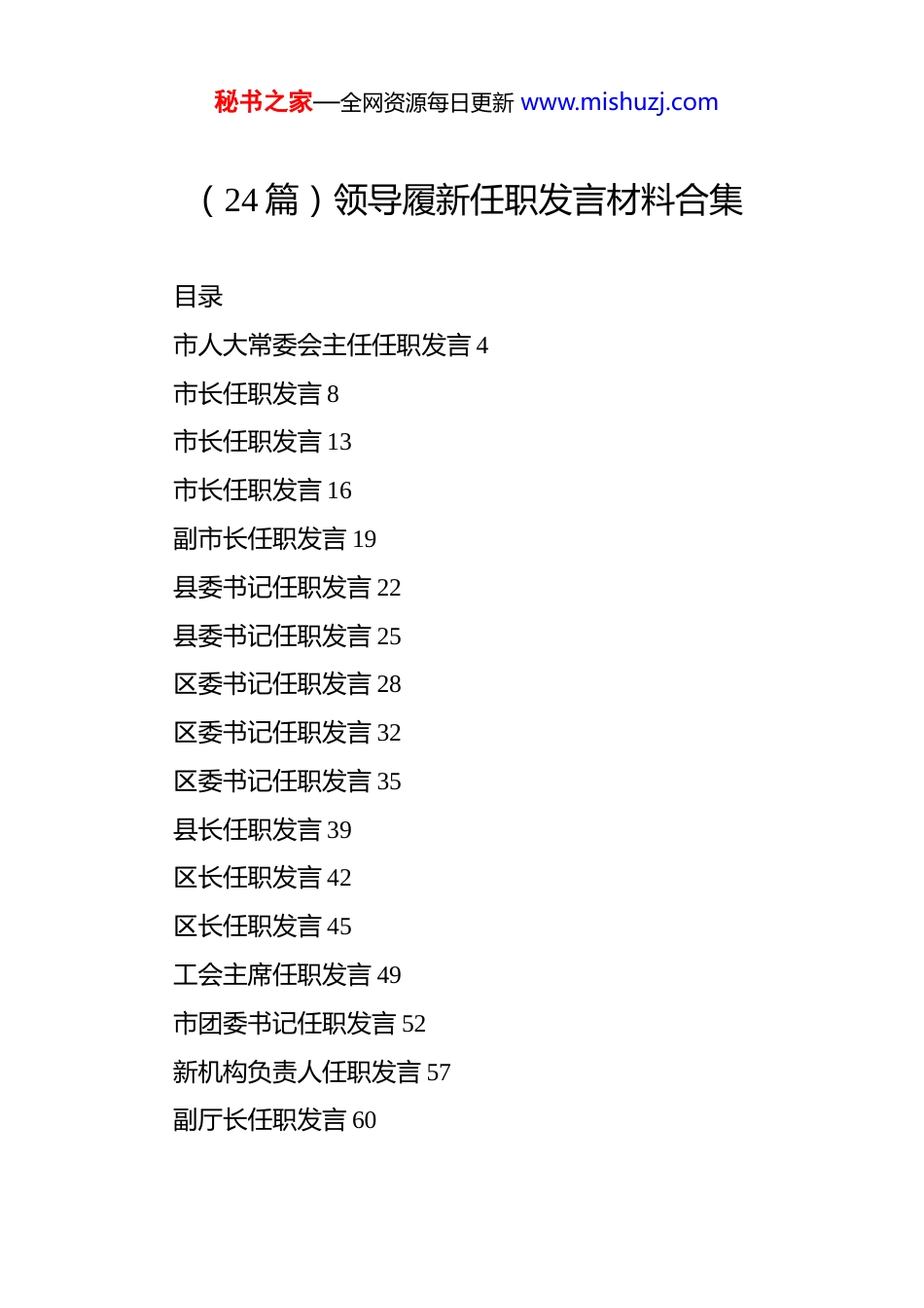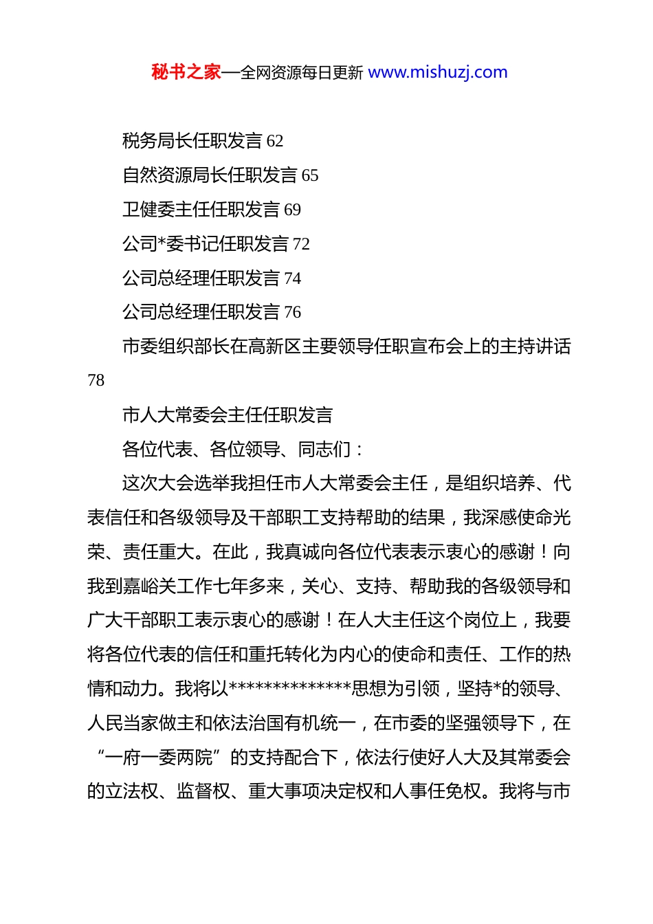 秘书之家—全网资源每日更新 www.mishuzj.com(24 篇)领导履新任职发言材料合集目录市人大常委会主任任职发言 4市长任职发言 8市长任职发言 13市长任职发言 16副市长任职发言 19县委书记任职发言 22县委书记任职发言 25区委书记任职发言 28区委书记任职发言 32区委书记任职发言 35县长任职发言 39区长任职发言 42区长任职发言 45工会主席任职发言 49市团委书记任职发言 52新机构负责人任职发言 57副厅长任职发言 60秘书之家—全网资源每日更新 www.mishuzj.com税务局长任职发言 62自然资源局长任职发言 65卫健委主任任职发言 69公司*委书记任职发言 72公司总经理任职发言 74公司总经理任职发言 76市委组织部长在高新区主要领导任职宣布会上的主持讲话78市人大常委会主任任职发言各位代表、各位领导、同志们:这次大会选举我担任市人大常委会主任,是组织培养、代表信任和各级领导及干部职工支持帮助的结果,我深感使命光荣、责任重大。在此,我真诚向各位代表表示衷心的感谢!向我到嘉峪关工作七年多来,关心、支持、帮助我的各级领导和广大干部职工表示衷心的感谢!在人大主任这个岗位上,我要将各位代表的信任和重托转化为内心的使命和责任、工作的热情和动力。我将以**************思想为引领,坚持*的领导、人民当家做主和依法治国有机统一,在市委的坚强领导下,在“一府一委两院”的支持配合下,依法行使好人大及其常委会的立法权、监督权、重大事项决定权和人事任免权。我将与市秘书之家—全网资源每日更新 www.mishuzj.com人大常委会组成人员和全体代表一道,继承和发扬历届市人大常委会的优良传统,解放思想、开拓创新,以永不懈怠的精神状态,推进人大工作与时俱进,不辜负各位代表和全市人民的信任和重托。第一,不断强化思想武装,自觉提高政治站位。对**************思想和十九大精神,要系统学、跟进学、联系实际学,对******关于坚持和完善人民代表大会制度的重要思想要坚定不移贯彻落实。把准政治方向、站稳政治立场、保持政治定力,以实际行动树牢“四个意识”、坚定“四个自信”、坚决做到“两个维护”,自觉在思想上、政治上、行动上同以***同志为核心的*中央保持高度一致。善于通过法定程序把市委的重大决策转化为全市人民的共同意志,通过发挥人大各项职能作用把市委各项工作部署落到实处,通过发挥代表作用推动民主法治建设不断取得新进步。第二,牢记使命勇于担当,依法高效履职尽责。人大的血脉在人民、根基在人民、力量在人民。要把人民群众的信任度、满意度作为衡量人大工作的重要标准,时刻关注民生、体察民情,汇民声、聚民意、集民智、保民权、维民利,不断增强广大人民群众的获得感、幸福感和安全感。要秉承宪法至上,人民至上,带头尊法、学法、守法、用法,善于运用法治思维谋秘书之家—全网资源每日更新 www.mishuzj.com划推动人大工作。坚持民之所需、用之所急,依法立法、民主立法,立良法、促善治,在推进“城市建设管理、环境保护、历史文化保护”方面提供法治保障。要按照围绕中心、服务大局的工作定位,紧盯市委重大决策、政府重点工作,增强与“一府一委两院”工作的“融合度”,创新监督方式,加大监督力度,增强监督实效,依法履行好监督权,达到监督、支持与服务相统一。通过监督助推抓落实、提质量、促发展。通过监督促进依法行政和公正司法,推进法治政府、法治社会建设进程。要紧紧围绕高质量发展、生态环保、乡村振兴、重大改革、重大风险、城市精细化管理、社会治理和司法公平正义等方面依法讨论决定重大事项,努力为经济转型升级、城市转型发展、社会和谐稳定保驾护航。要始终坚持*管干部和人大依法任免干部有机统一,依法行使好人事任免职权。第三,发挥代表主体作用,全面加强自身建设。打铁还需自身硬。一方面,要坚持把尊重代表主体地位、提高代表素质能力、更好发挥代表作用,作为开展人大工作的重要基础。加强代表履职培训、调研视察、外出考察等,以增长知识、开阔眼界、启迪思路,帮助代表提高履职能力。建设好代表之家、代表工作站等履职平台,提升代表履职服务保障工作水平。在经费、时...