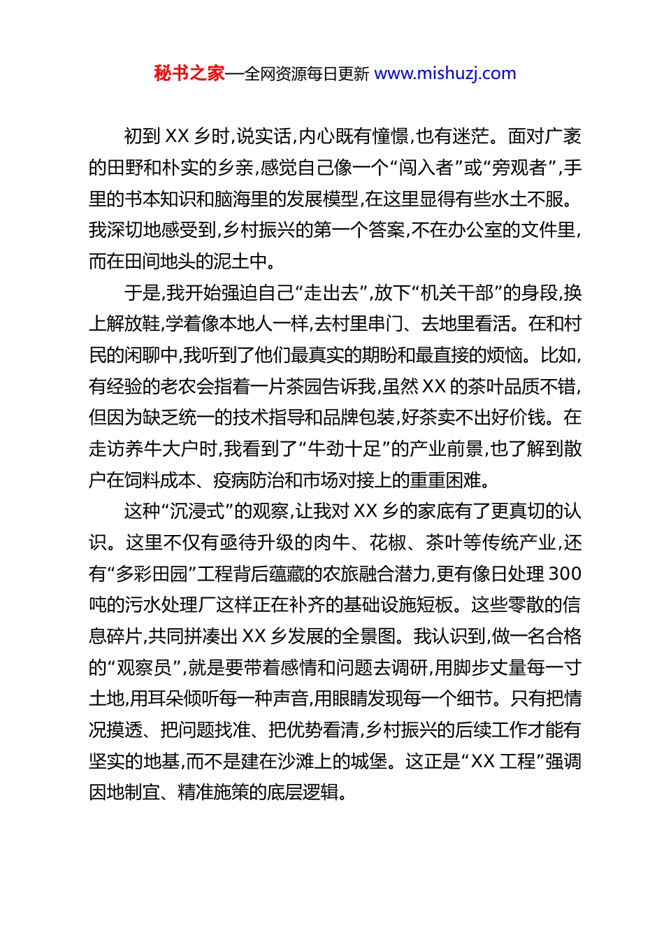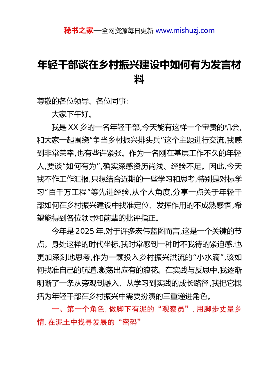 秘书之家—全网资源每日更新 www.mishuzj.com年轻干部谈在乡村振兴建设中如何有为发言材料尊敬的各位领导、各位同事:大家下午好。我是 XX 乡的一名年轻干部,今天能有这样一个宝贵的机会,“”和大家一起围绕 争当乡村振兴排头兵 这个主题进行交流,我感到非常荣幸,也有些许紧张。作为一名刚在基层工作不久的年轻人,“”要谈 如何有为 ,确实深感资历尚浅、经验不足。因此,今天我不作工作汇报,只想结合近期的一些学习和思考,特别是对标学“”习 百千万工程 等先进经验,从个人角度,分享一点关于年轻干部如何在乡村振兴建设中找准定位、发挥作用的不成熟感悟,希望能得到各位领导和前辈的批评指正。今年是 2025 年,对于许多宏伟蓝图而言,这是一个关键的节点。身处这样的时代坐标,我时常感到一种时不我待的紧迫感,也更加深刻地思考,“”作为一颗投入乡村振兴洪流的 小水滴 ,该如何找准自己的航道,激荡出应有的浪花。在实践与反思中,我逐渐明晰了一条从旁观到融入、从学习到实践的成长路径,我把它概括为年轻干部在乡村振兴中需要扮演的三重递进角色。一、第一个角色,做脚下有泥的“观察员”,用脚步丈量乡情,在泥土中找寻发展的“密码”秘书之家—全网资源每日更新 www.mishuzj.com初到 XX 乡时,说实话,内心既有憧憬,也有迷茫。面对广袤的田野和朴实的乡亲,“”“”感觉自己像一个 闯入者 或 旁观者 ,手里的书本知识和脑海里的发展模型,在这里显得有些水土不服。我深切地感受到,乡村振兴的第一个答案,不在办公室的文件里,而在田间地头的泥土中。于是,“”我开始强迫自己 走出去 ,“”放下 机关干部 的身段,换上解放鞋,学着像本地人一样,去村里串门、去地里看活。在和村民的闲聊中,我听到了他们最真实的期盼和最直接的烦恼。比如,有经验的老农会指着一片茶园告诉我,虽然 XX 的茶叶品质不错,但因为缺乏统一的技术指导和品牌包装,好茶卖不出好价钱。在走访养牛大户时,“”我看到了 牛劲十足 的产业前景,也了解到散户在饲料成本、疫病防治和市场对接上的重重困难。“”这种 沉浸式 的观察,让我对 XX 乡的家底有了更真切的认识。这里不仅有亟待升级的肉牛、花椒、茶叶等传统产业,还“”有 多彩田园 工程背后蕴藏的农旅融合潜力,更有像日处理 300吨的污水处理厂这样正在补齐的基础设施短板。这些零散的信息碎片,共同拼凑出 XX 乡发展的全景图。我认识到,做一名合格“”的 观察员 ,就是要带着感情和问题去调研,用脚步丈量每一寸土地,用耳朵倾听每一种声音,用眼睛发现每一个细节。只有把情况摸透、把问题找准、把优势看清,乡村振兴的后续工作才能有坚实的地基,“而不是建在沙滩上的城堡。这正是 XX”工程 强调因地制宜、精准施策的底层逻辑。秘书之家—全网资源每日更新 www.mishuzj.com二、第二个角色,做心中有数的“策划员”,用智慧连接城乡,在现实中擘画可行的“蓝图”当调研积累到一定程度,“”“”从 观察员 向 策划员 的角色转变就显得尤为关键。如果说观察是输入,那么策划就是消化和输出的过程。这个过程,考验的是将一线情况与宏观政策、传统资源与现代市场进行有效连接的能力。我常常思考,作为年轻干部,最大的优势或许不在于经验,而“在于视野和思维。学习 XX”工程 的经验,其核心就是破解城乡二元结构,推动城乡融合发展。在 XX 乡,这意味着不能就乡村论乡村。例如,在思考如何提升茶叶附加值时,除了引入高校技术团队进行田间管理,是否还能借助我们在外求学时接触到的电商直播、社群营销等新模式,为 XX 的茶叶打开新的销路?“在规划 多”彩田园 项目时,除了发展特色种养,是否可以借鉴一些地区的经验,引入研学、采摘、民宿等元素,“”让一产 接二连三 ,实现价值倍增?“”成为一名 心中有数 的策划员,需要具备两种思维。一是“”系统思维 ,要能跳出眼前的一亩三分地,将产业发展与基础设施建设、人居环境整治、乡风文明培育等统筹起来。比如,发展稻渔共作项目,既是农业生产方式的创新,也与生态环境保护息息相关,这本身就是系统规划的体现。二是“”转化思维 ,要善于“”将上级的政策文件 翻译 成群众能听懂、能参与的具体项目。像...
